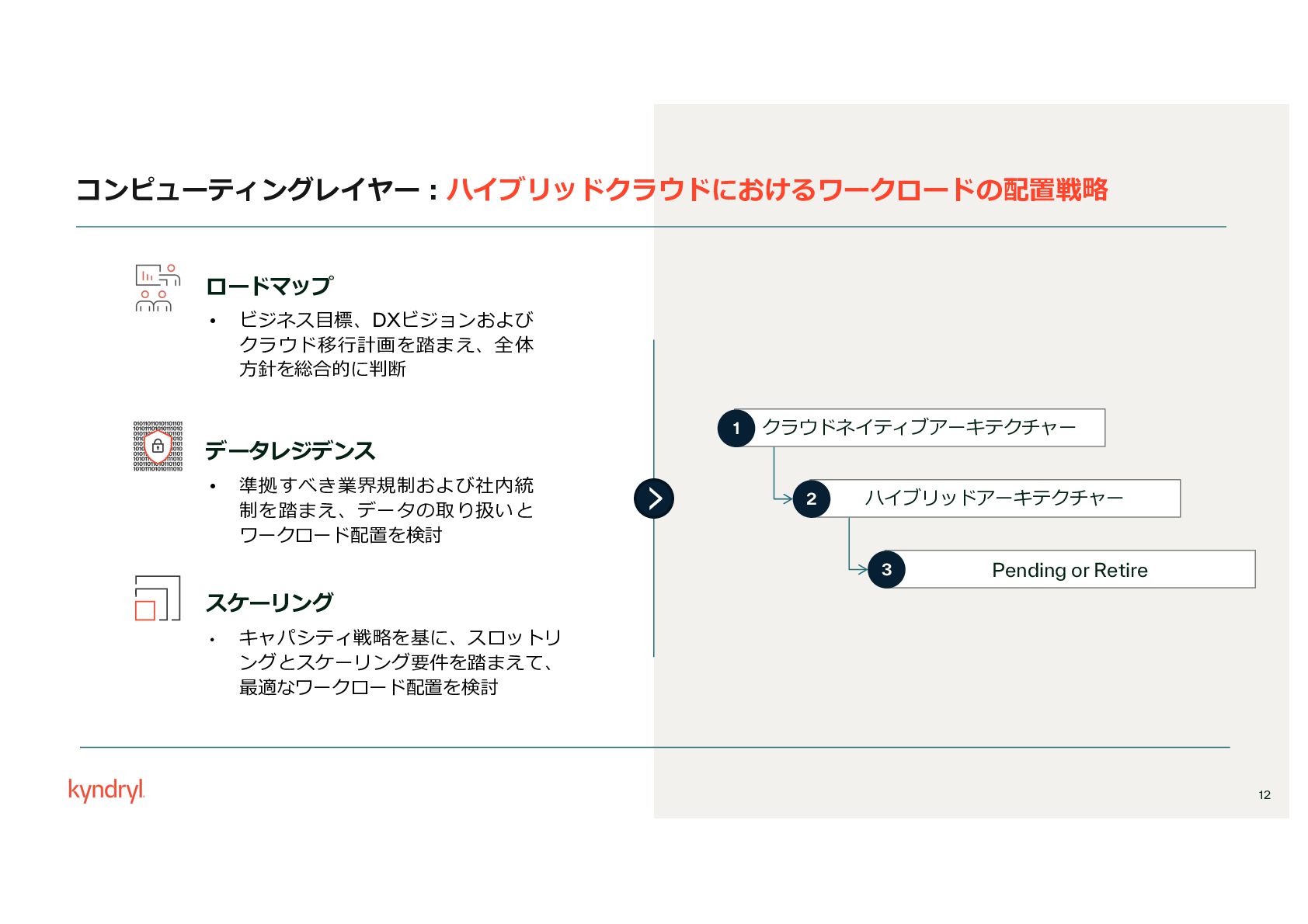スケーリング データレジデンス • キャパシティ戦略を基に、スロットリ ングとスケーリング要件を踏まえて、 最適なワークロード配置を検討 クラウドネイティブアーキテクチャー 1 ハイブリッドアーキテクチャー 2 Pending or Retire 3 12