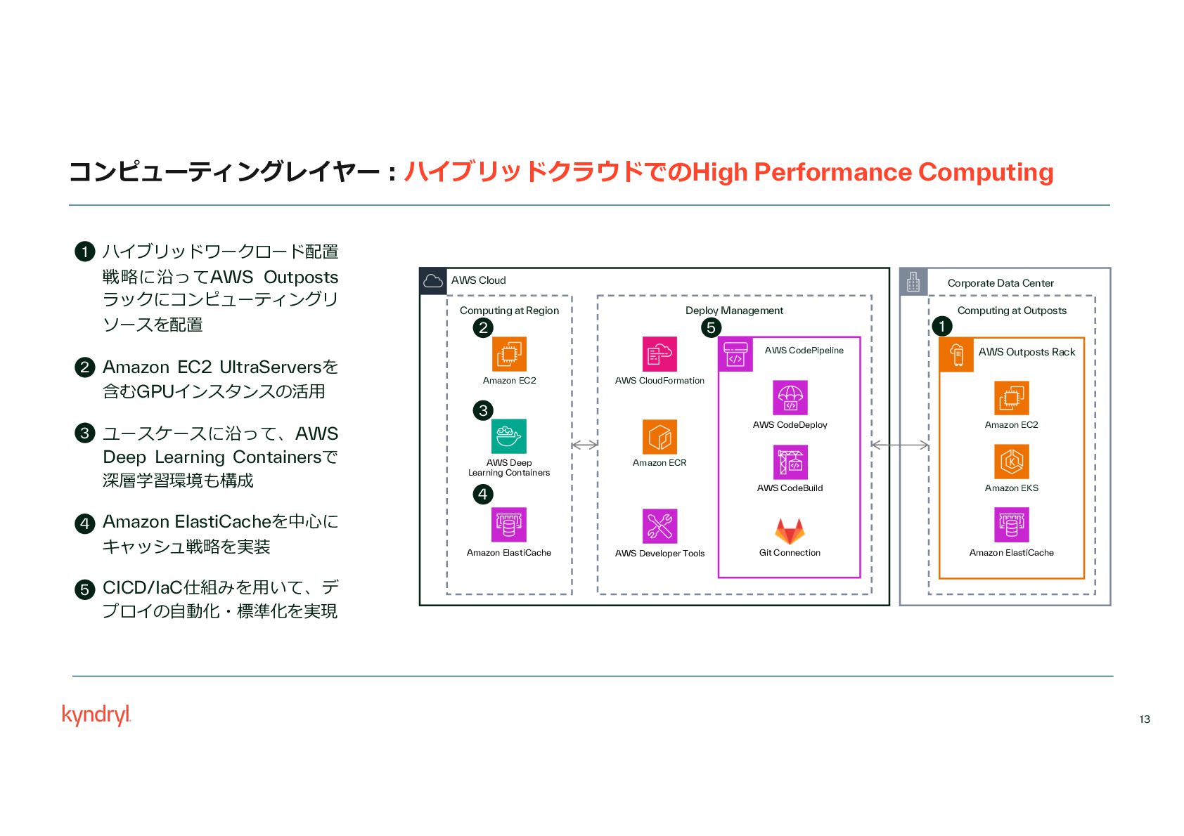 Amazon EC2 Amazon S3 on Outposts Amazon EBS Amazon EKS Amazon S3 on Outposts On-premise Infrastructure MF On-premise Infrastructure MF AWS Direct Connect Service Link Service Link Corporate Data Center (Region-01) Corporate Data Center (Region-02) AWS Region-01 Outposts VPC-01 AWS Region-02 Outposts VPC-02 Outposts Rack-01 Outposts Rack-02 Control Computing AWS Config AWS Organizations Amazon CloudWatch AWS Systems Manager DA, AI/ML Amazon Athena Amazon Q AWS Glue AWS CloudFormation AWS Step Functions Amazon Bedrock Architecture Overview︓AWS Outpostsを活⽤したハイブリッドクラウド構成 AWS CodePipeline Amazon DynamoDB 11 Amazon EC2 Amazon ElastiCache Amazon EBS AWS Deep Learning Containers Amazon ElastiCache Amazon EC2 Amazon EBS Amazon EKS Amazon ElastiCache Amazon CloudWatch AWS Systems Manager Amazon CloudWatch AWS Systems Manager Private Subnet Private Subnet Private Subnet Private Subnet