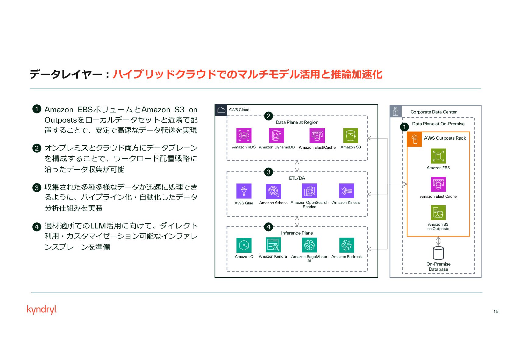 DynamoDB Data Plane at On-Premise AWS Outposts Rack Amazon ElastiCache Corporate Data Center 1 Amazon S3 on Outposts Amazon EBS On-Premise Database Data Plane at Region ETL/DA Inference Plane Amazon SageMaker AI Amazon Kendra Amazon Kinesis Amazon OpenSearch Service Amazon RDS Amazon ElastiCache Amazon S3 1 2 3 4 Amazon EBSボリュームとAmazon S3 on Outpostsをローカルデータセットと近隣で配 置することで、安定で⾼速なデータ転送を実現 オンプレミスとクラウド両⽅にデータプレーン を構成することで、ワークロード配置戦略に 沿ったデータ収集が可能 収集された多種多様なデータが迅速に処理でき るように、パイプライン化・⾃動化したデータ 分析仕組みを実装 適材適所でのLLM活⽤に向けて、ダイレクト 利⽤・カスタマイゼーション可能なインファレ ンスプレーンを準備 2 3 4 15 AWS Cloud