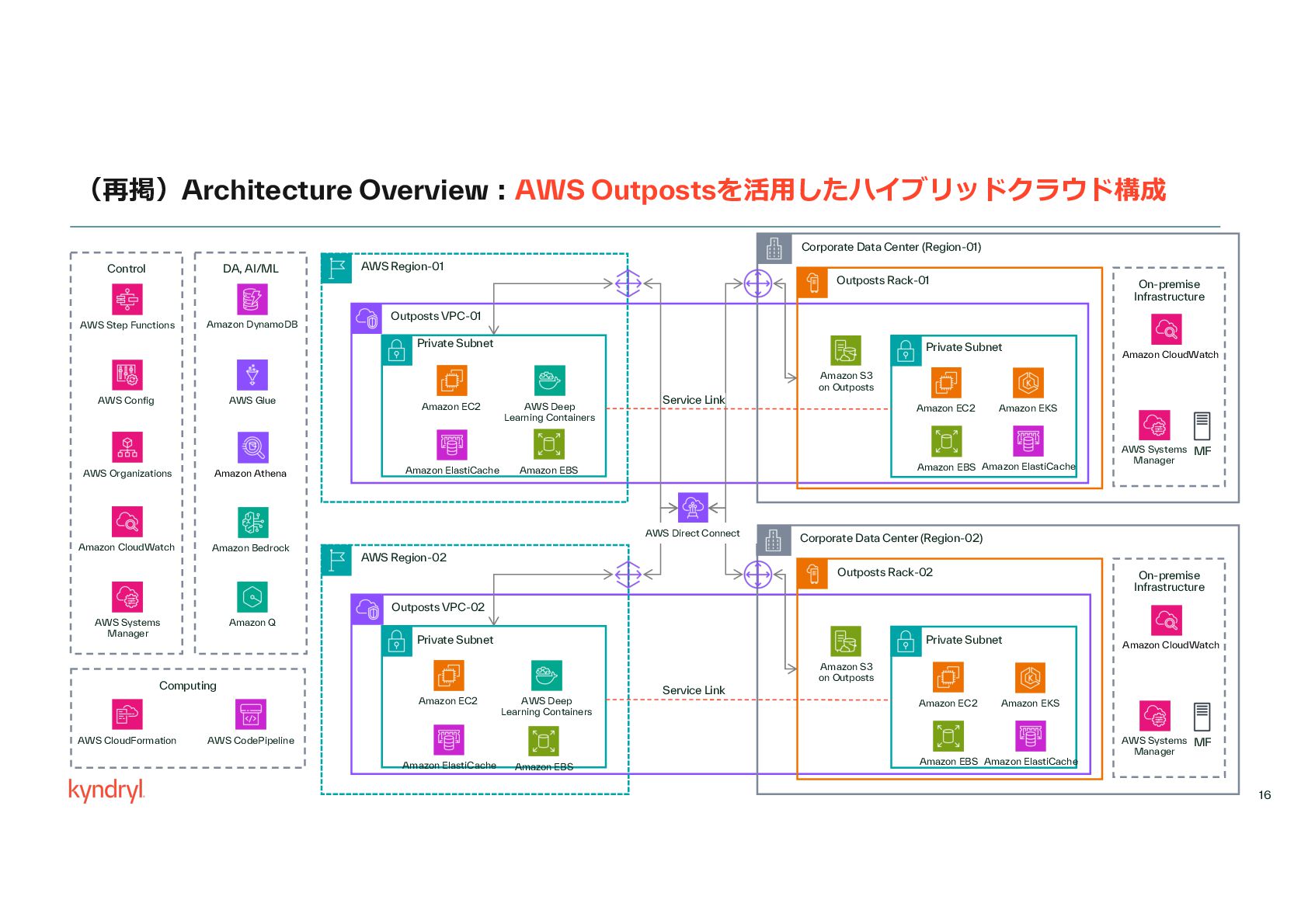 Amazon EC2 Amazon S3 on Outposts Amazon EBS Amazon EKS Amazon S3 on Outposts On-premise Infrastructure MF On-premise Infrastructure MF AWS Direct Connect Service Link Service Link Corporate Data Center (Region-01) Corporate Data Center (Region-02) AWS Region-01 Outposts VPC-01 AWS Region-02 Outposts VPC-02 Outposts Rack-01 Outposts Rack-02 Control Computing AWS Config AWS Organizations Amazon CloudWatch AWS Systems Manager DA, AI/ML Amazon Athena Amazon Q AWS Glue AWS CloudFormation AWS Step Functions Amazon Bedrock (再掲)Architecture Overview︓AWS Outpostsを活⽤したハイブリッドクラウド構成 AWS CodePipeline Amazon DynamoDB 16 Amazon EC2 Amazon ElastiCache Amazon EBS AWS Deep Learning Containers Amazon ElastiCache Amazon EC2 Amazon EBS Amazon EKS Amazon ElastiCache Amazon CloudWatch AWS Systems Manager Amazon CloudWatch AWS Systems Manager Private Subnet Private Subnet Private Subnet Private Subnet