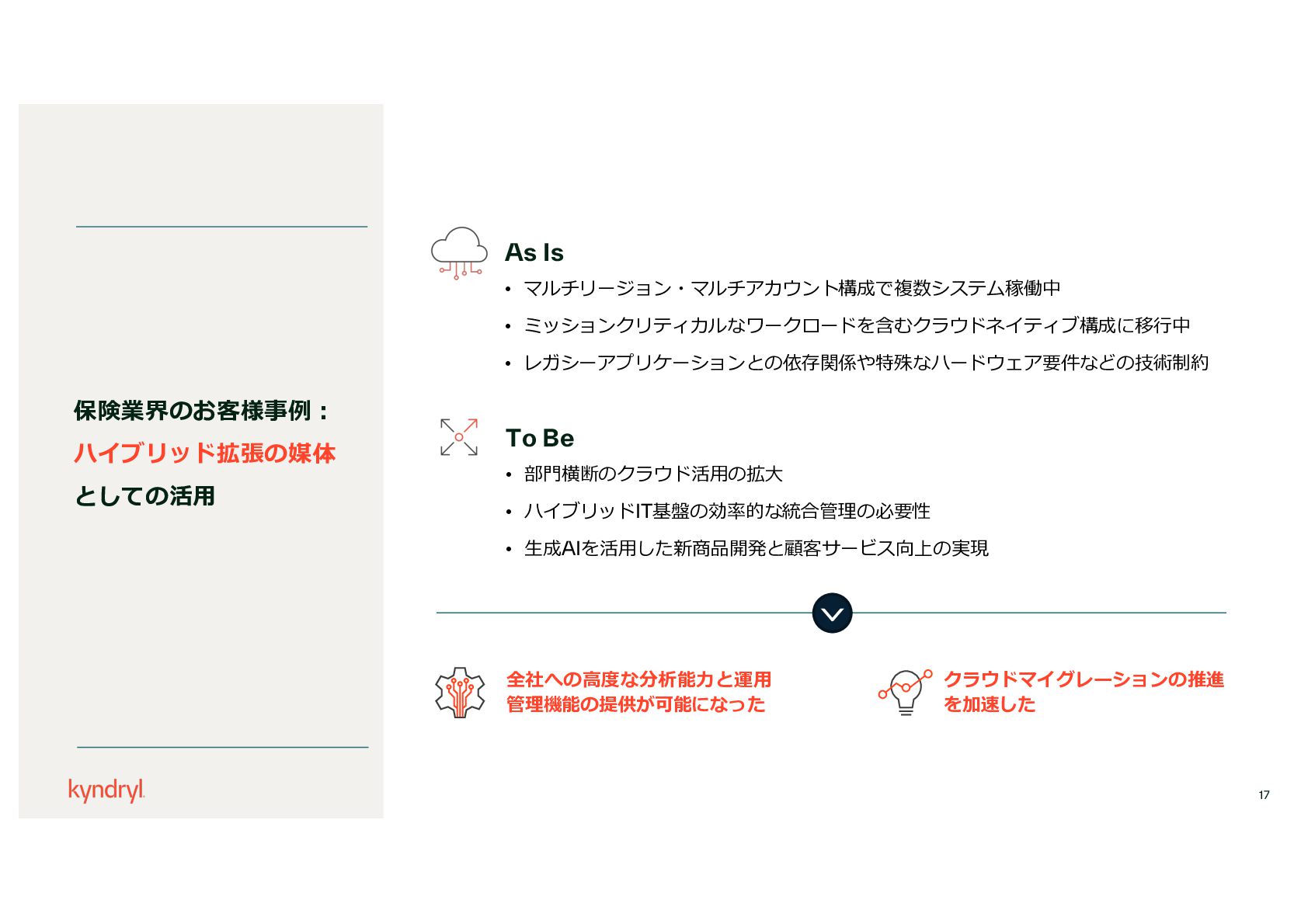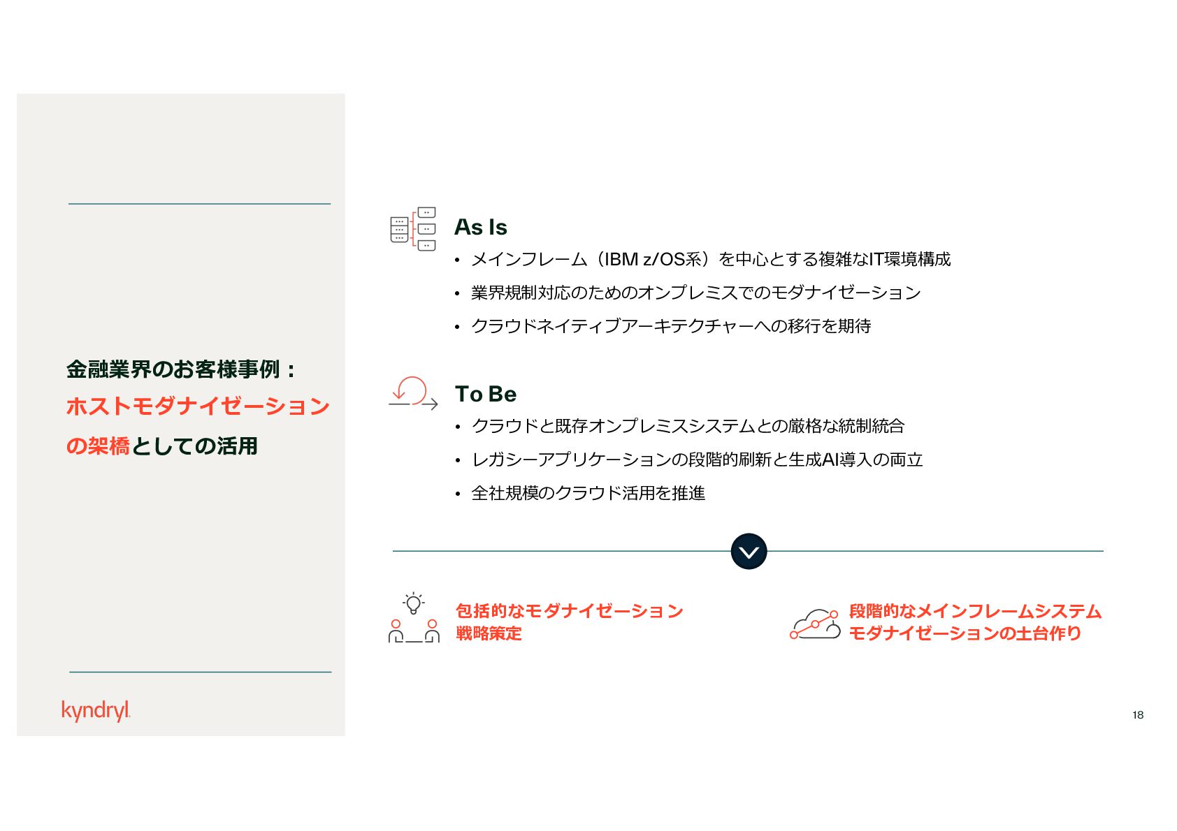 Is 全社への⾼度な分析能⼒と運⽤ 管理機能の提供が可能になった クラウドマイグレーションの推進 を加速した 17 • 部⾨横断のクラウド活⽤の拡⼤ • ハイブリッドIT基盤の効率的な統合管理の必要性 • ⽣成AIを活⽤した新商品開発と顧客サービス向上の実現 To Be