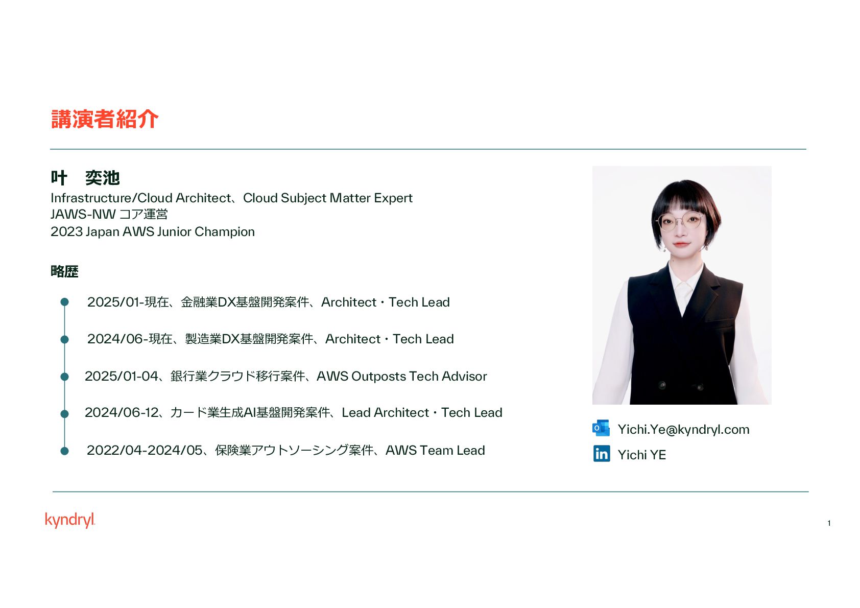 2023 Japan AWS Junior Champion 略歴 2025/01-現在、⾦融業DX基盤開発案件、Architect・Tech Lead 2024/06-現在、製造業DX基盤開発案件、Architect・Tech Lead 2025/01-04、銀⾏業クラウド移⾏案件、AWS Outposts Tech Advisor 2024/06-12、カード業⽣成AI基盤開発案件、Lead Architect・Tech Lead 2022/04-2024/05、保険業アウトソーシング案件、AWS Team Lead [email protected] Yichi YE 1