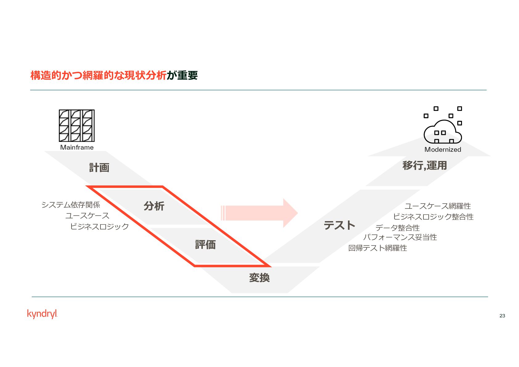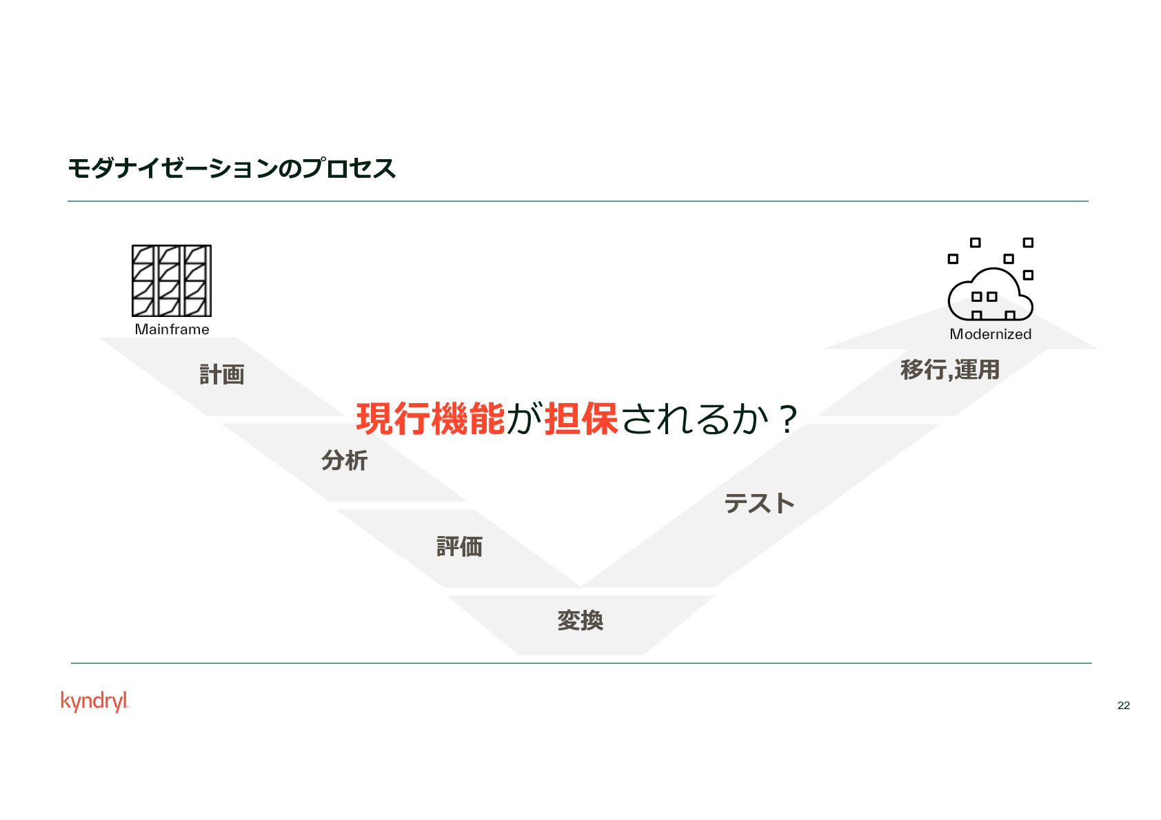 システム依存関係 Mainframe Modernized ユースケース網羅性 ビジネスロジック整合性 データ整合性 パフォーマンス妥当性 回帰テスト網羅性