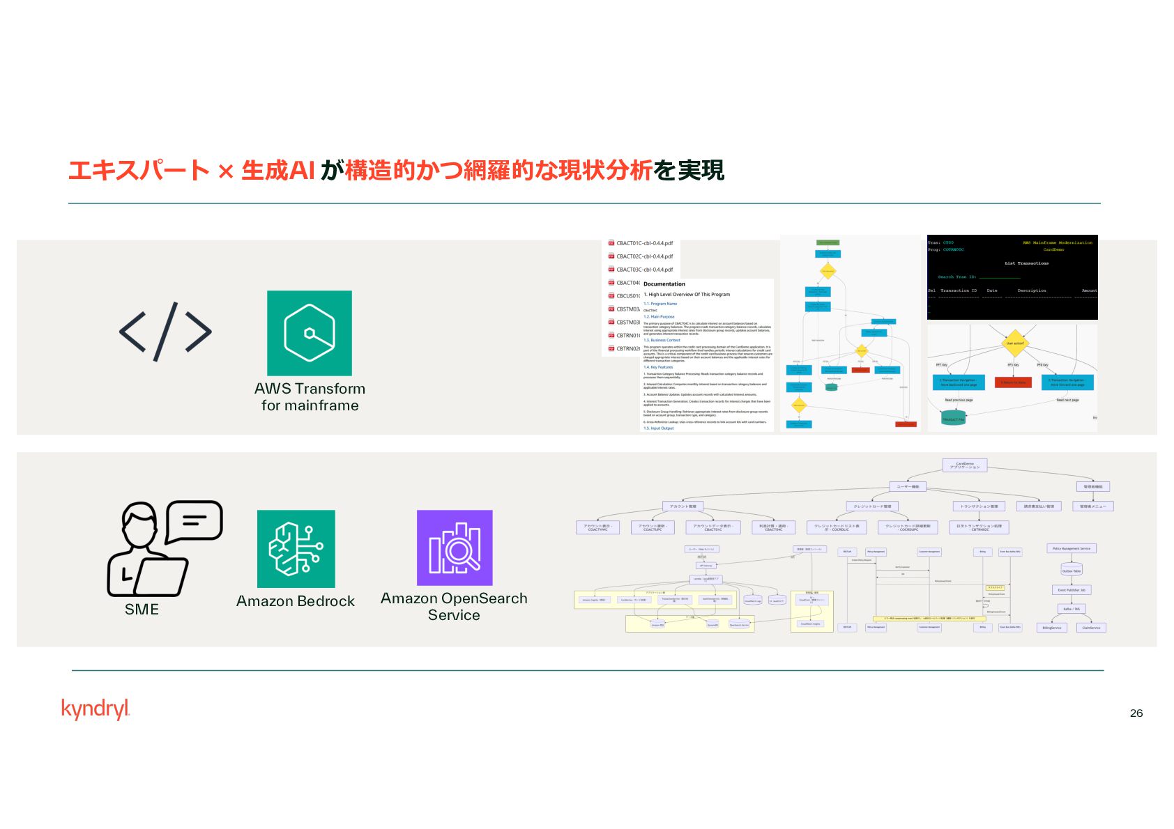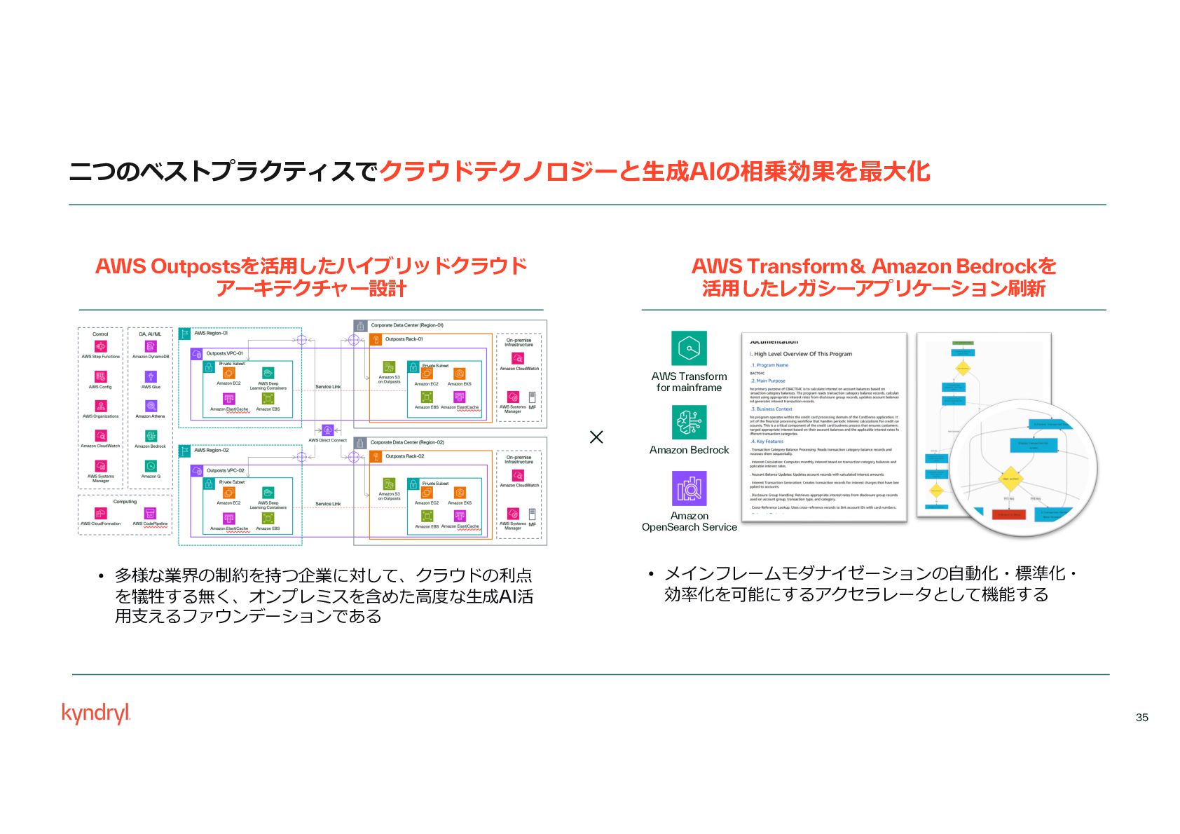 多様な業界の制約を持つ企業に対して、クラウドの利点 を犠牲する無く、オンプレミスを含めた⾼度な⽣成AI活 ⽤⽀えるファウンデーションである 35 AWS Transform for mainframe Amazon Bedrock Amazon OpenSearch Service • メインフレームモダナイゼーションの⾃動化・標準化・ 効率化を可能にするアクセラレータとして機能する Private Subnet Private Subnet Private Subnet Private Subnet