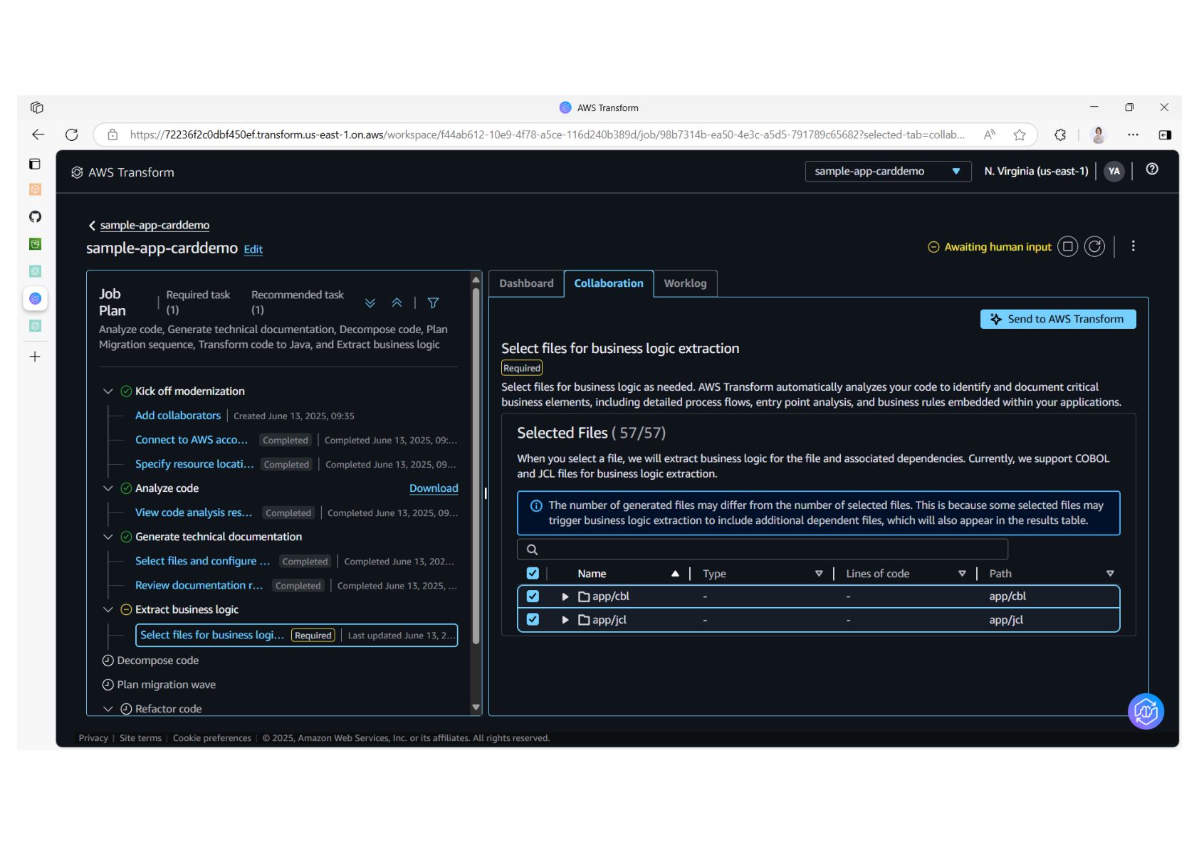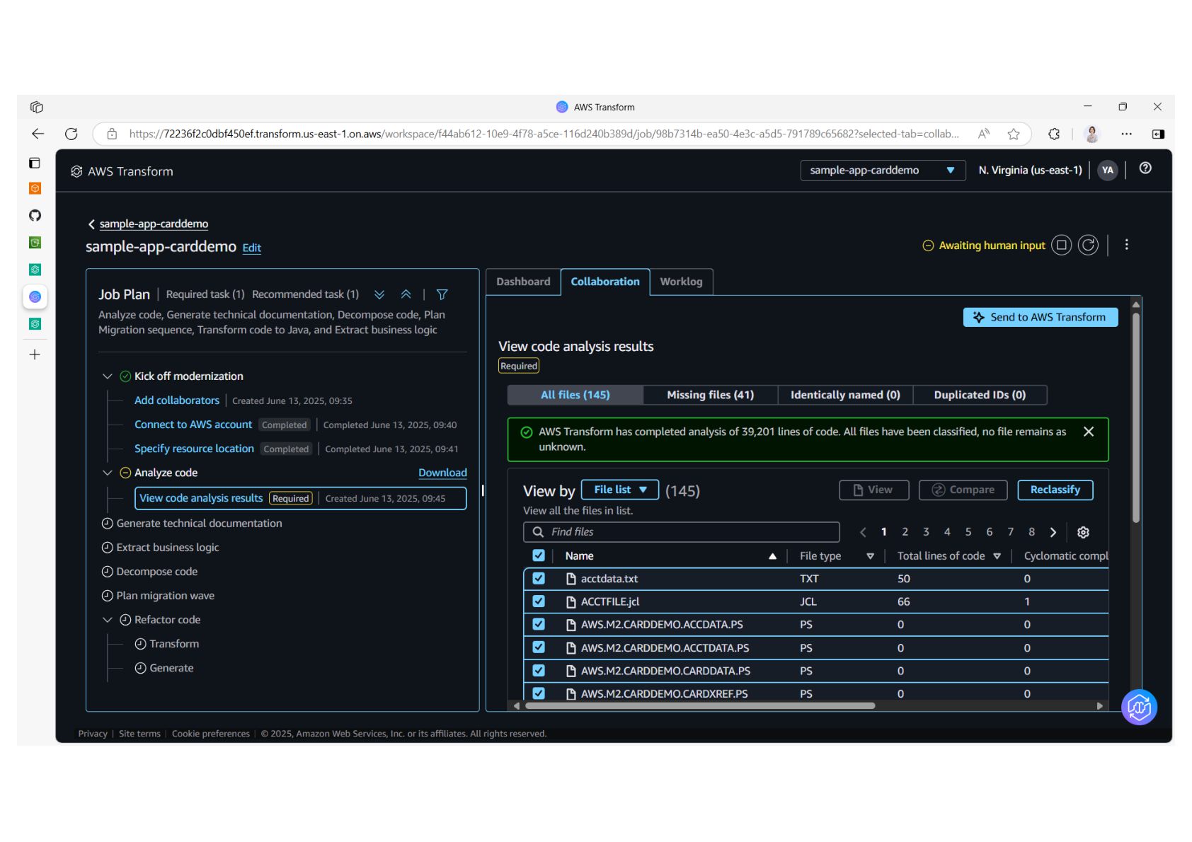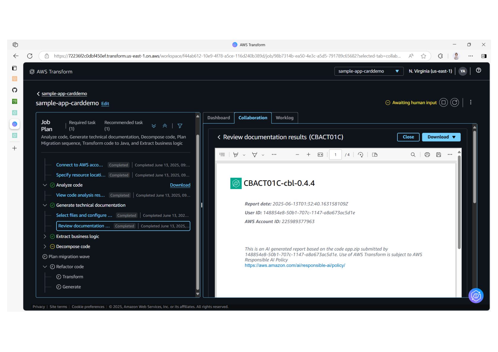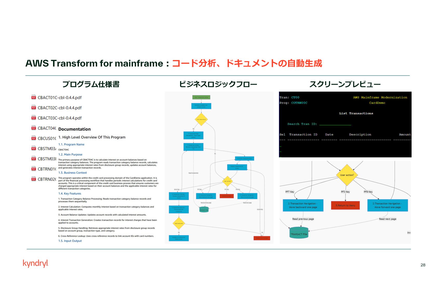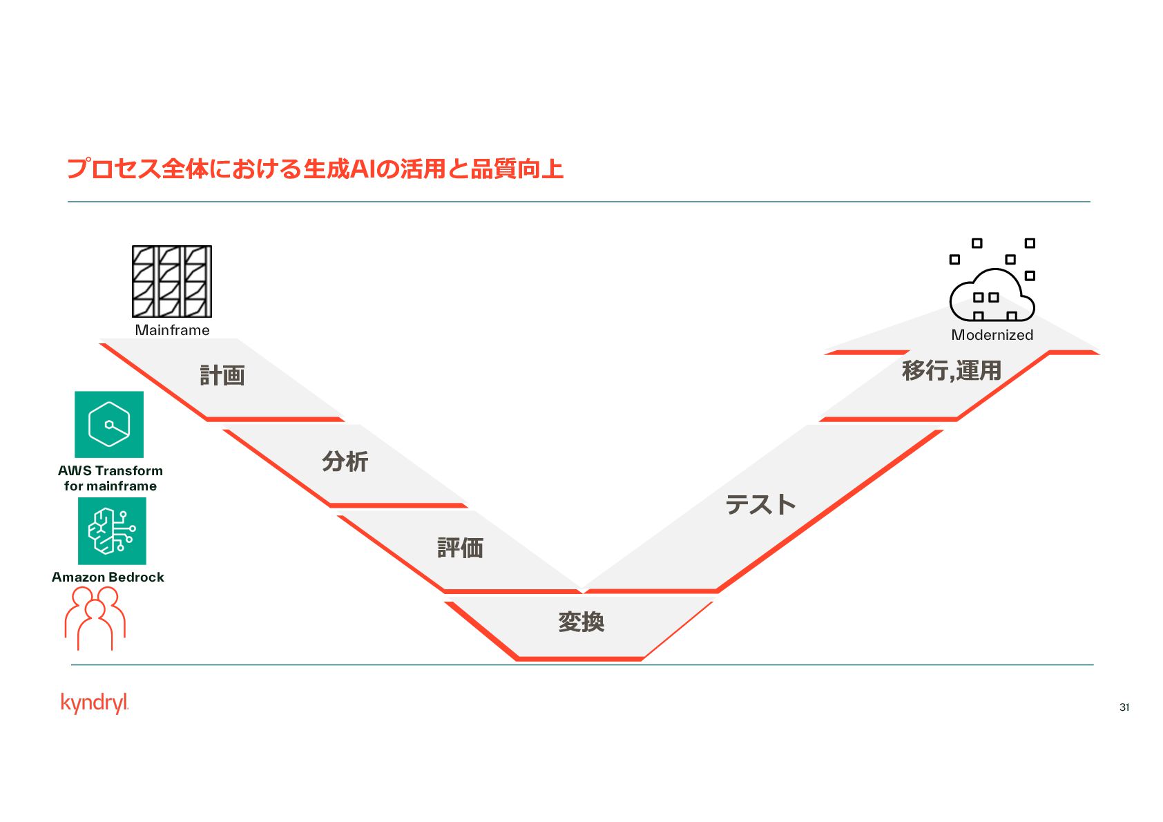Mainframe Modernized ユースケース網羅性 ビジネスロジック整合性 データ整合性 パフォーマンス妥当性 回帰テスト網羅性 メインフレームワークロードを⼤規模に モダナイズするための初のエージェント型 AI サービス。 初期評価から最終デプロイにおよぶモダナ イゼーションのあらゆる段階全体の複雑な リソース集約型タスクを⾃動化。 AWS Transform for mainframe