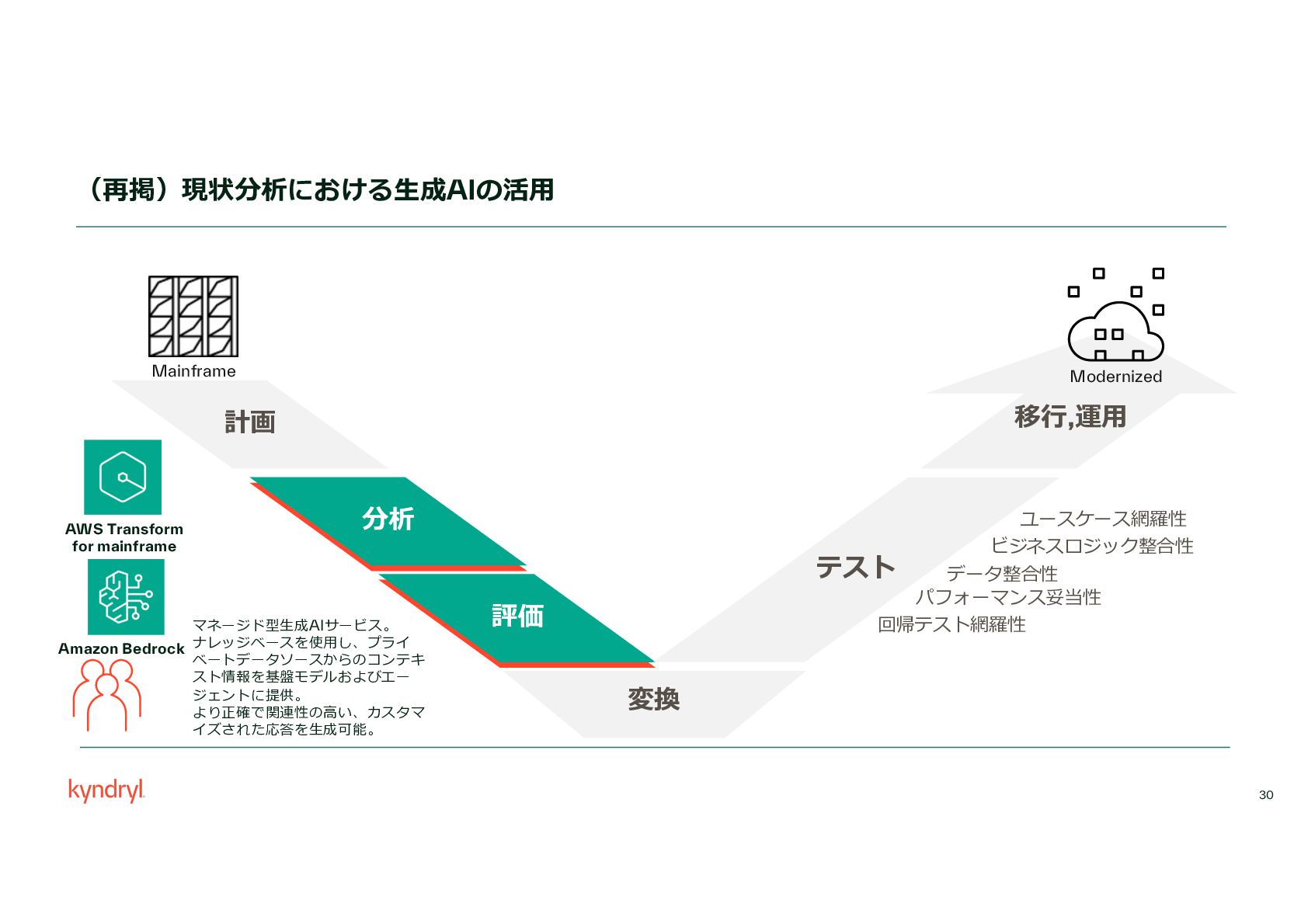 評価 テスト 変換 移⾏,運⽤ Modernized マネージド型⽣成AIサービス。 ナレッジベースを使⽤し、プライ ベートデータソースからのコンテキ スト情報を基盤モデルおよびエー ジェントに提供。 より正確で関連性の⾼い、カスタマ イズされた応答を⽣成可能。 Amazon Bedrock AWS Transform for mainframe