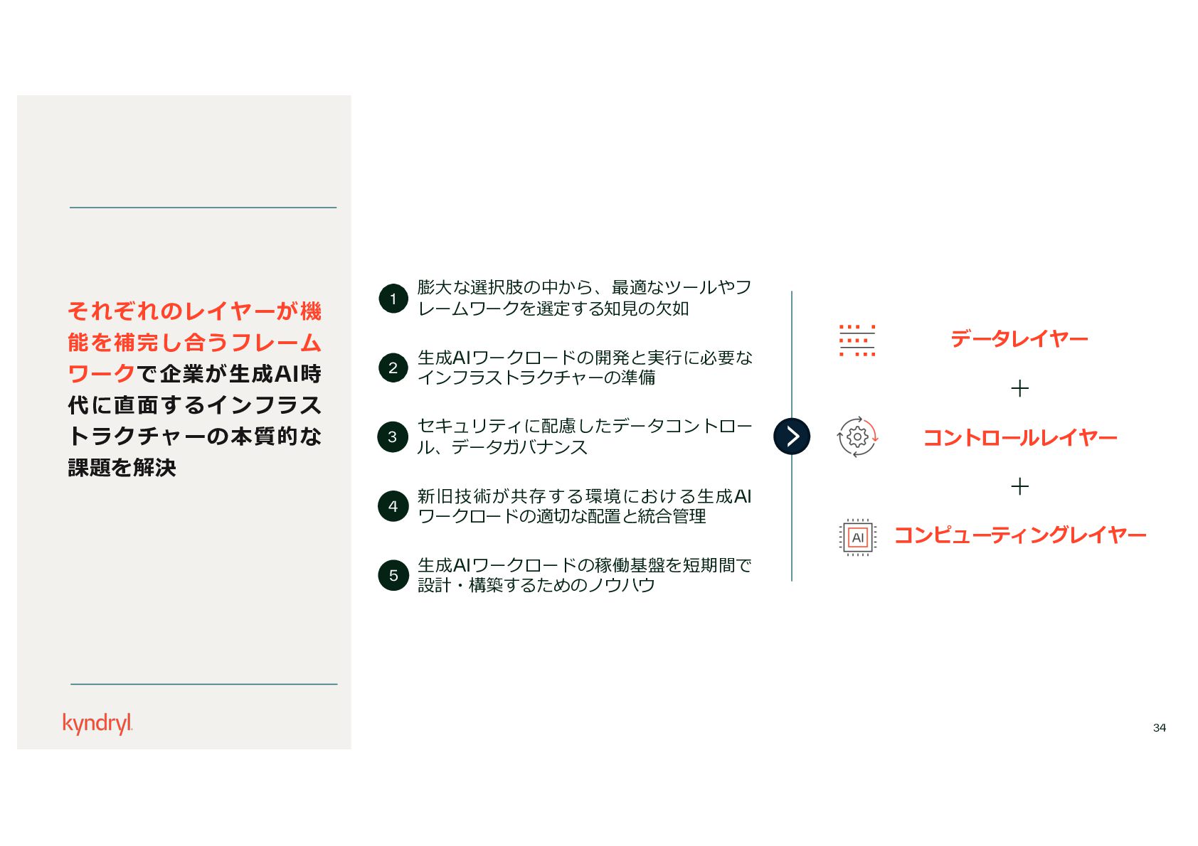 20. それぞれのレイヤーが機 能を補完し合うフレーム ワークで企業が⽣成AI時 代に直⾯するインフラス トラクチャーの本質的な 課題を解決 34 1 2 3