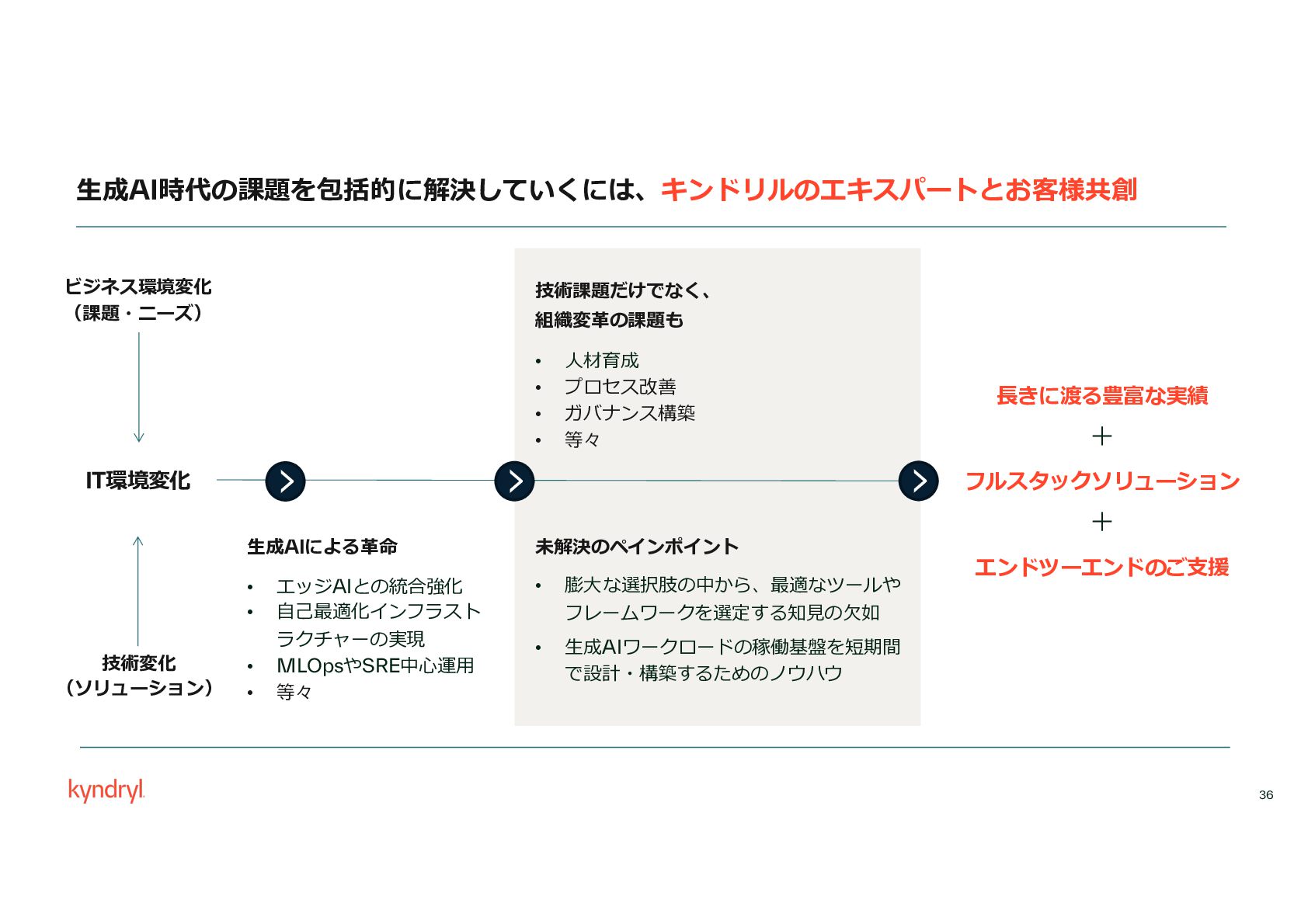 22. ⽣成AI時代の課題を包括的に解決していくには、キンドリルのエキスパートとお客様共創 36 • エッジAIとの統合強化 • ⾃⼰最適化インフラスト ラクチャーの実現 • MLOpsやSRE中⼼運⽤ •