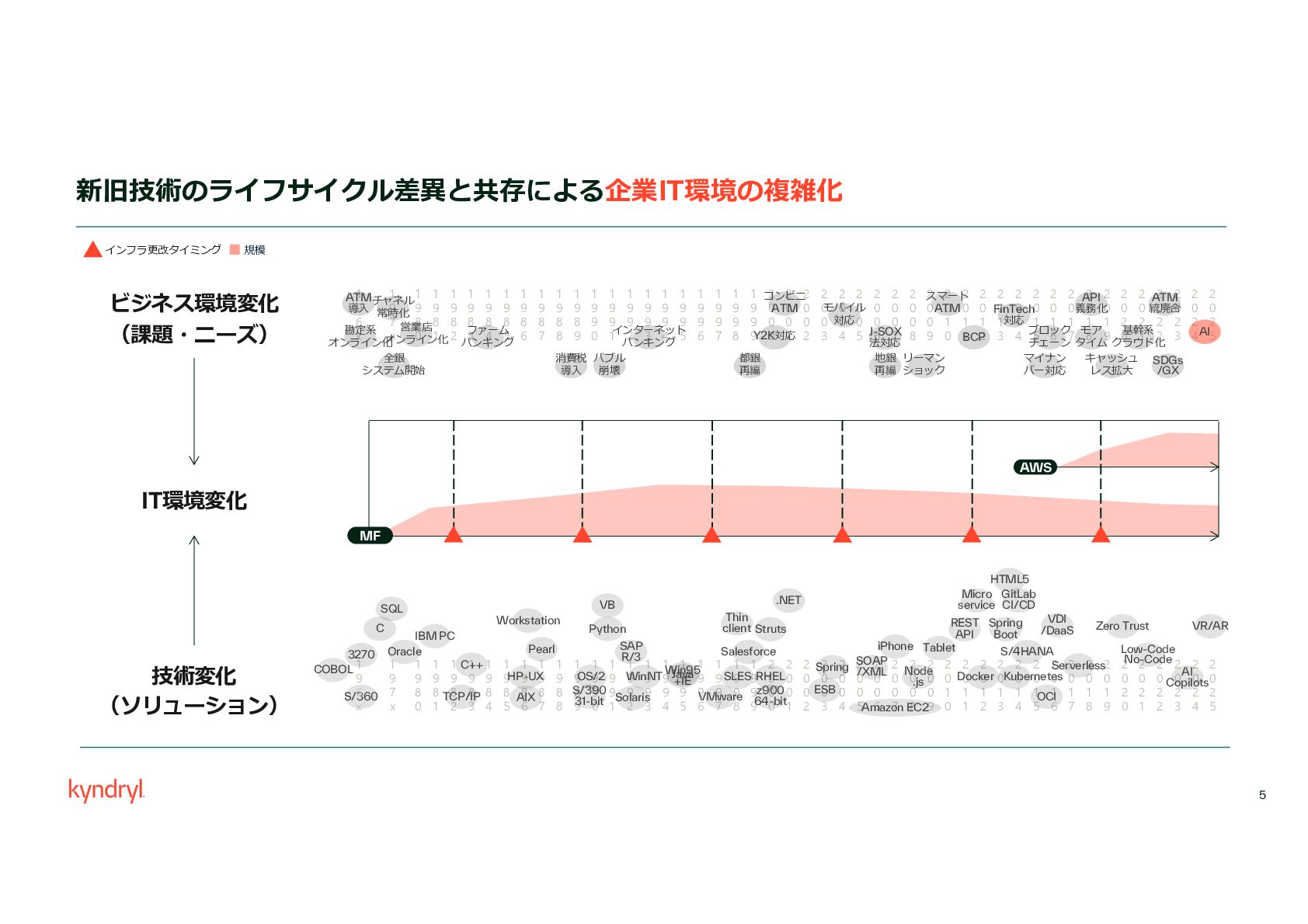 4. 新旧技術のライフサイクル差異と共存による企業IT環境の複雑化 規模 インフラ更改タイミング AWS S/360 Oracle 1 9 6 x