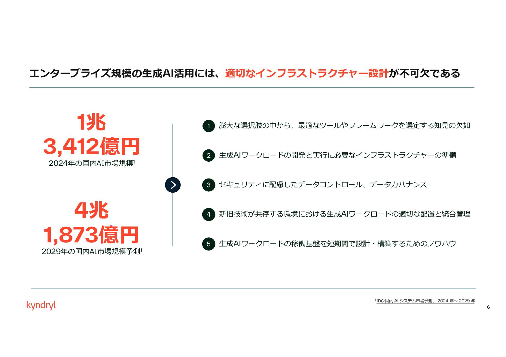 5. エンタープライズ規模の⽣成AI活⽤には、適切なインフラストラクチャー設計が不可⽋である 4兆 1,873億円 2029年の国内AI市場規模予測1 1 2 3 4 膨⼤な選択肢の中から、最適なツールやフレームワークを選定する知⾒の⽋如 ⽣成AIワークロードの開発と実⾏に必要なインフラストラクチャーの準備
