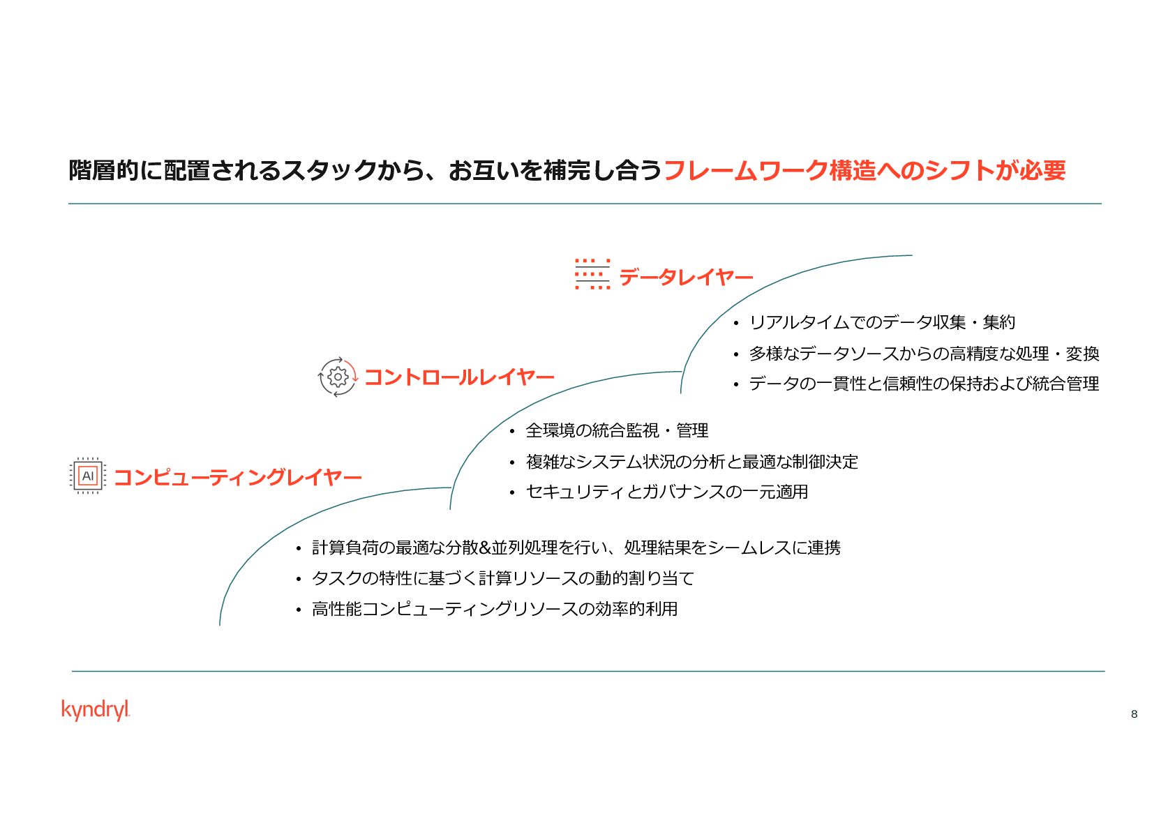 6. 階層的に配置されるスタックから、お互いを補完し合うフレームワーク構造へのシフトが必要 コンピューティングレイヤー コントロールレイヤー データレイヤー • 計算負荷の最適な分散&並列処理を⾏い、処理結果をシームレスに連携 • タスクの特性に基づく計算リソースの動的割り当て • ⾼性能コンピューティングリソースの効率的利⽤