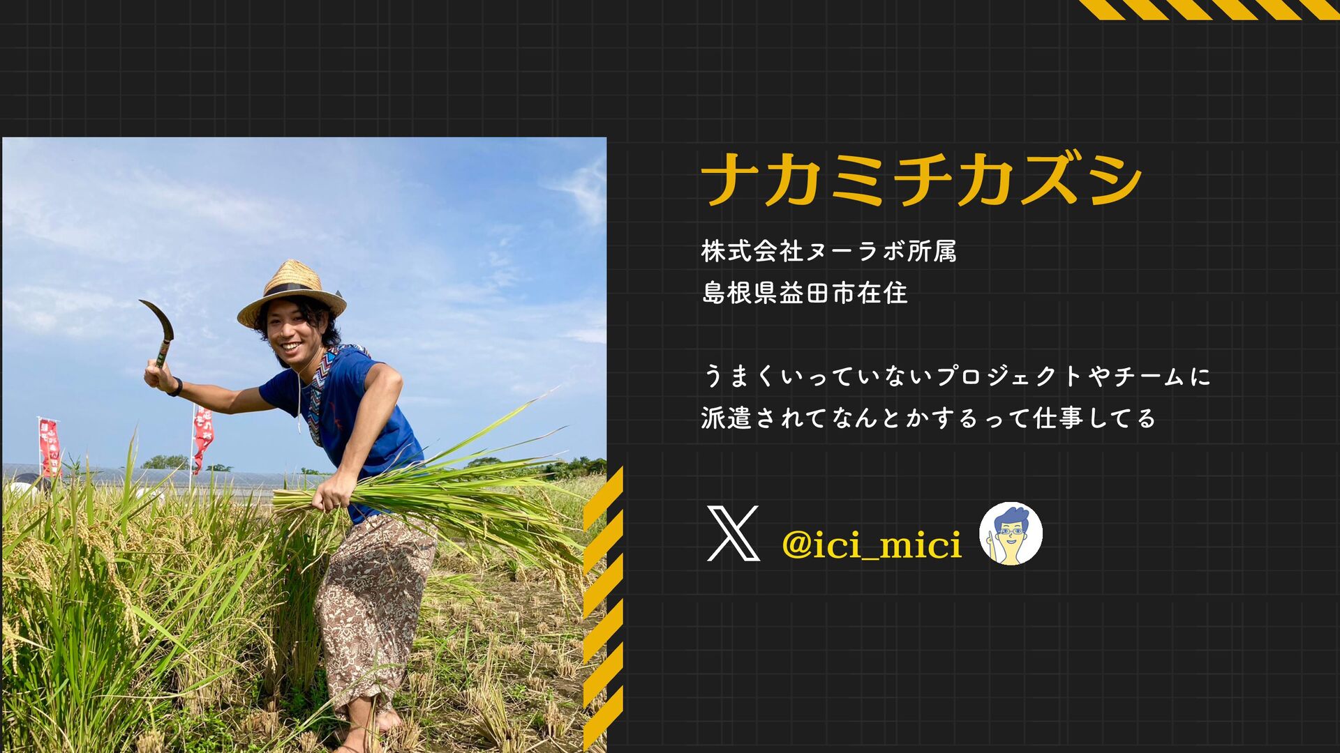 ナカミチカズシ גࣜձࣾψʔϥϘॴଐ ౡࠜݝӹాࢢࡏॅ ͏·͍͍ͬͯ͘ͳ͍ϓϩδΣΫτνʔϜʹ ݣ͞ΕͯͳΜͱ͔͢Δͬͯࣄͯ͠Δ @ici_mici