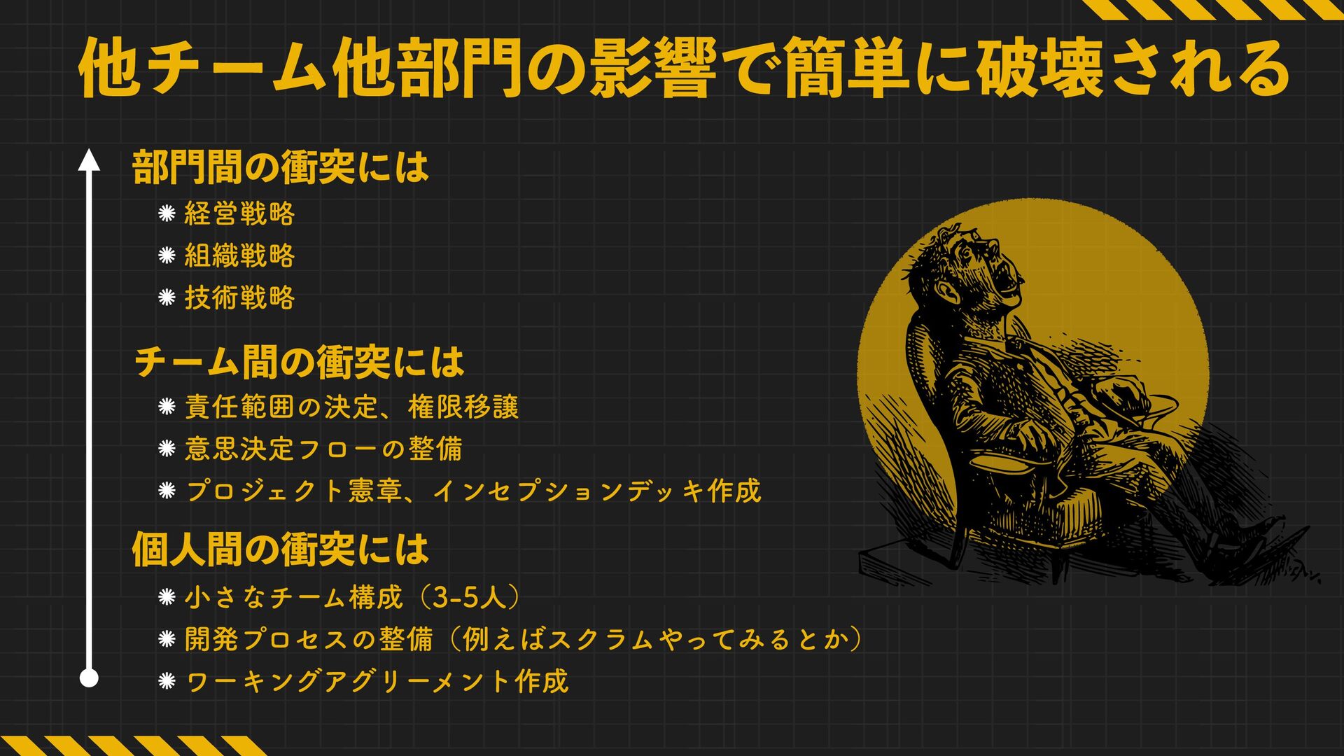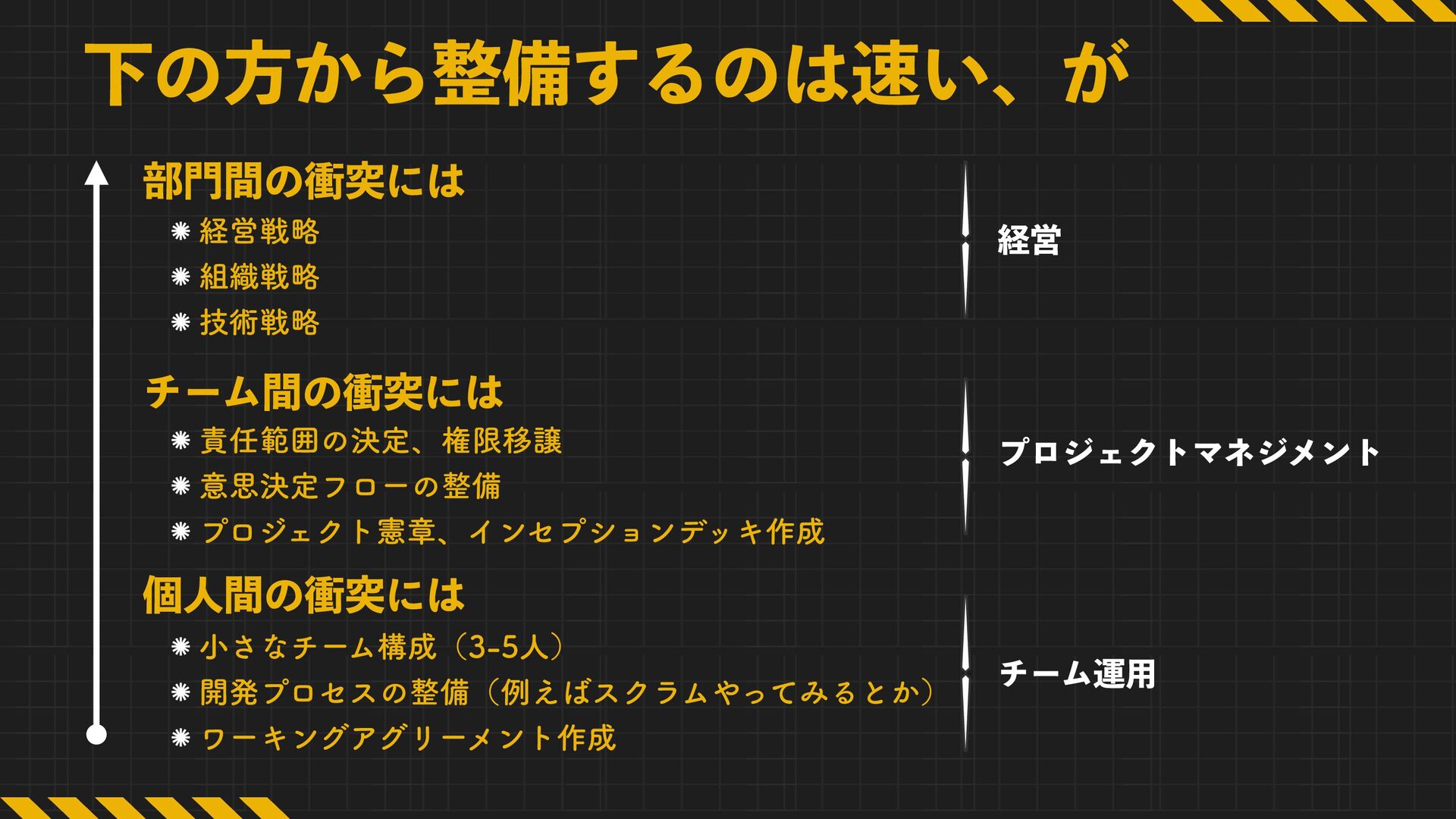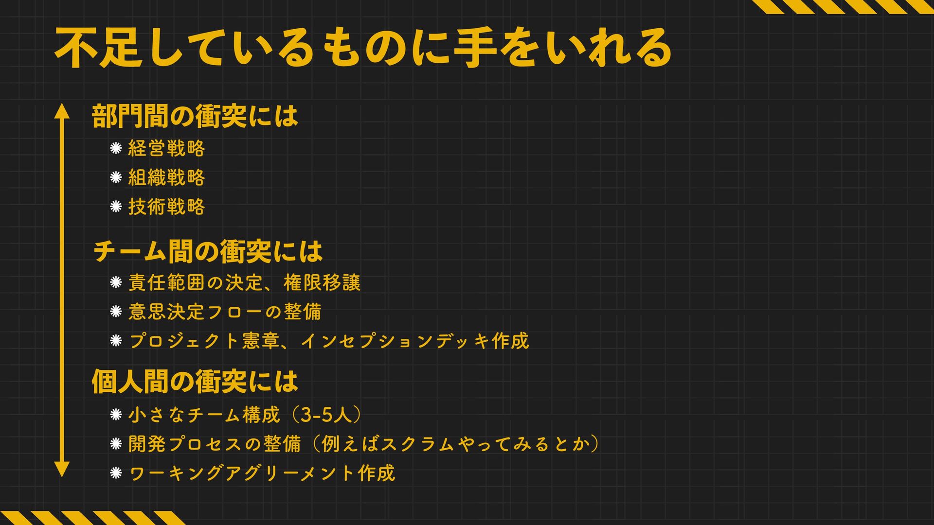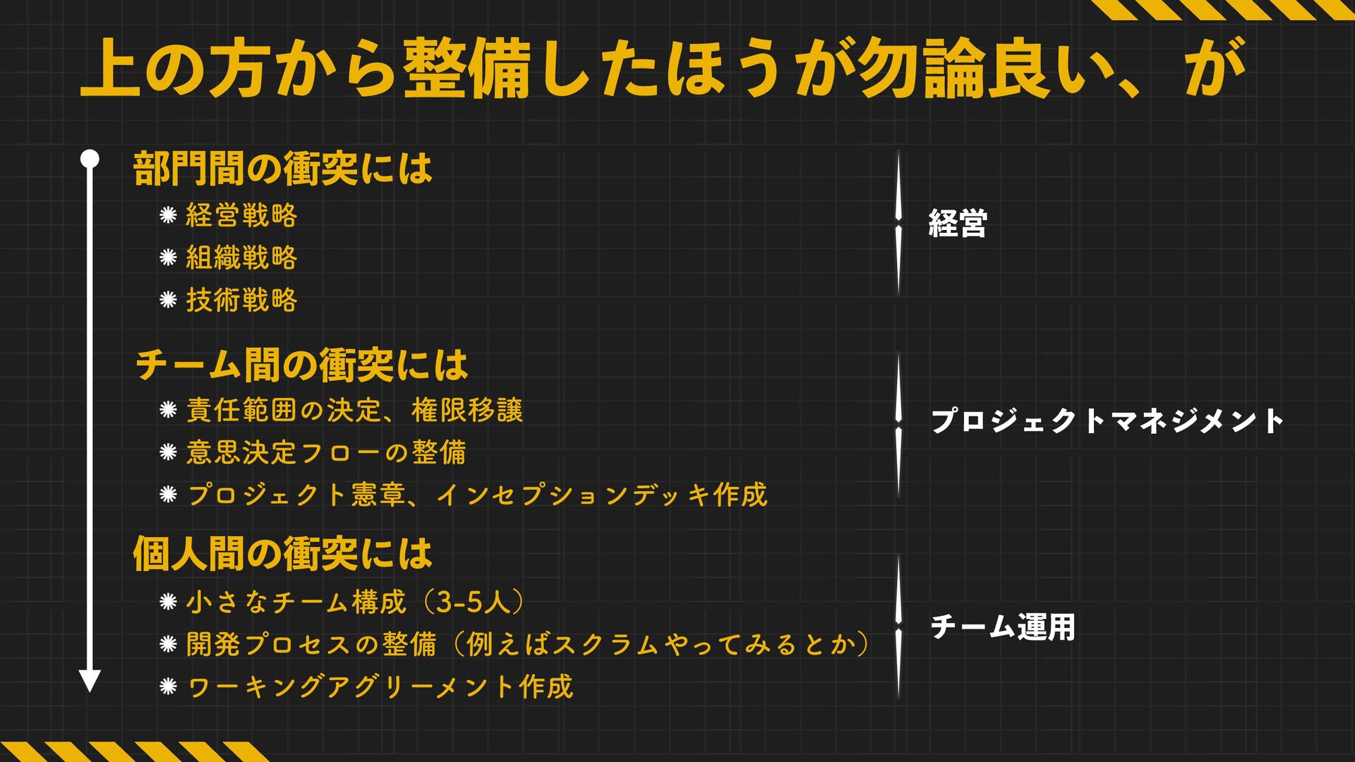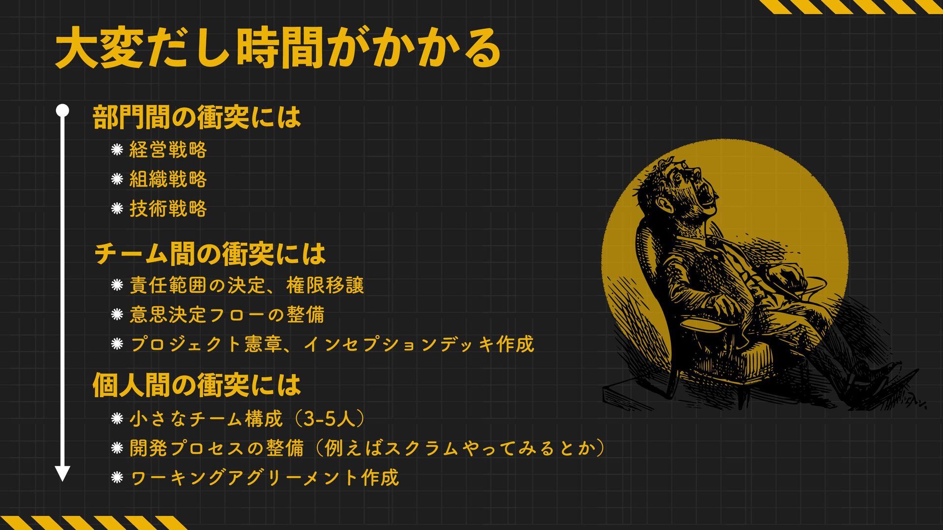 େม͕͔͔ͩ࣌ؒ͠Δ ෦ؒͷিಥʹ ݸਓؒͷিಥʹ νʔϜؒͷিಥʹ ܦӦઓུ ৫ઓུ ٕज़ઓུ ൣғͷܾఆɺݖݶҠৡ ҙࢥܾఆϑϩʔͷඋ ϓϩδΣΫτݑষɺΠϯηϓγϣϯσοΩ࡞