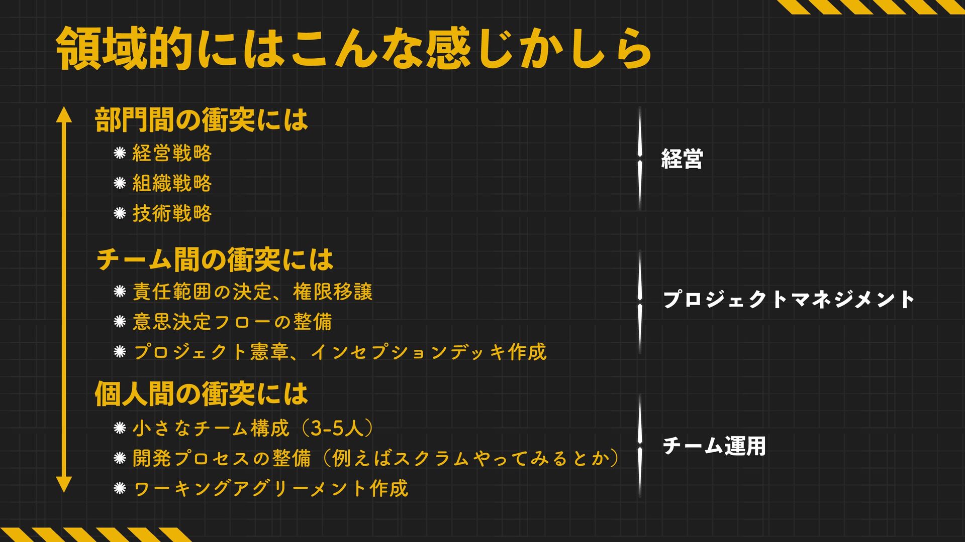 ྖҬతʹ͜Μͳײ͔͡͠Β ෦ؒͷিಥʹ ݸਓؒͷিಥʹ νʔϜؒͷিಥʹ ܦӦઓུ ৫ઓུ ٕज़ઓུ ൣғͷܾఆɺݖݶҠৡ ҙࢥܾఆϑϩʔͷඋ ϓϩδΣΫτݑষɺΠϯηϓγϣϯσοΩ࡞