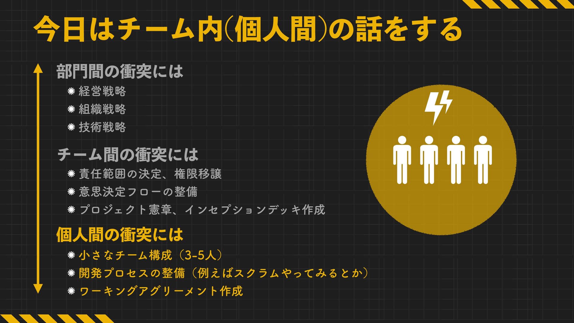 ࠓνʔϜ ݸਓؒ ͷΛ͢Δ ෦ؒͷিಥʹ ݸਓؒͷিಥʹ νʔϜؒͷিಥʹ ܦӦઓུ ৫ઓུ ٕज़ઓུ ൣғͷܾఆɺݖݶҠৡ