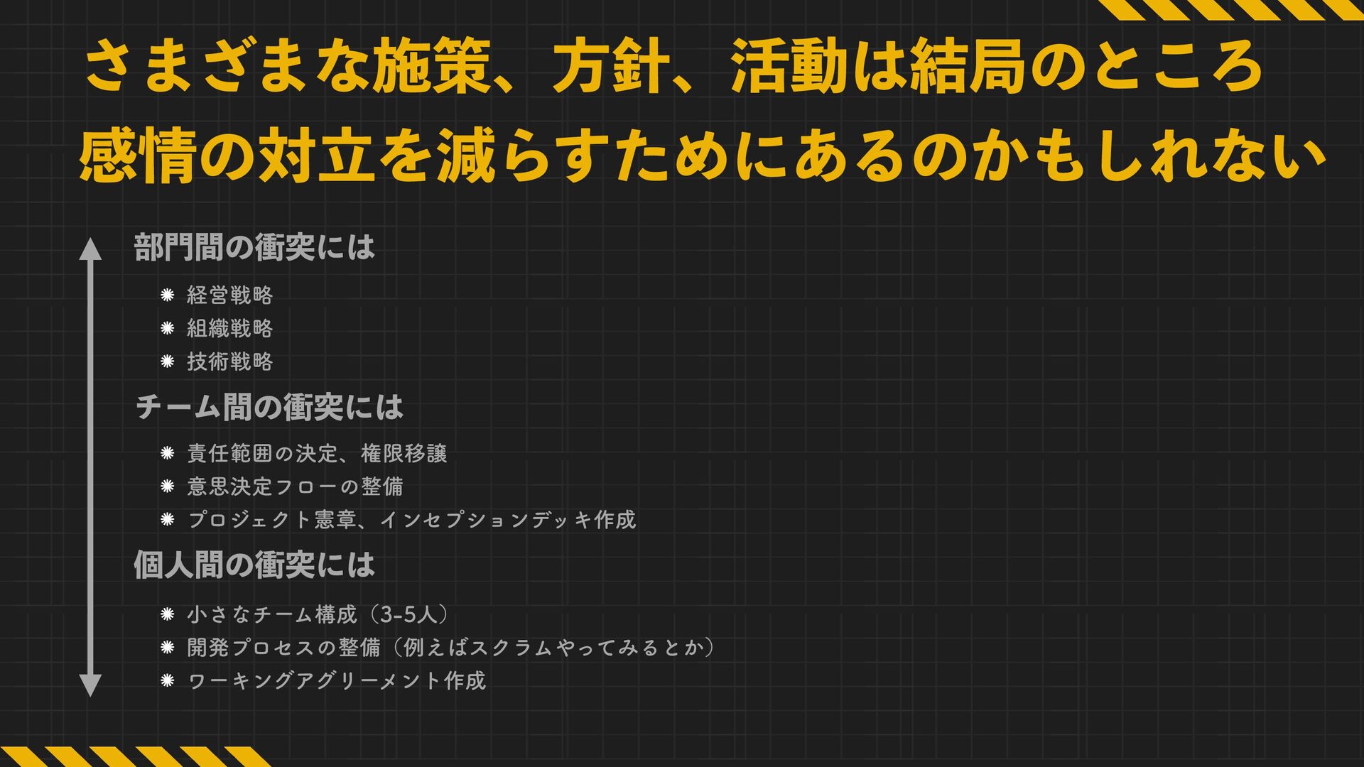 ͞·͟·ͳࢪࡦɺํɺ׆ಈ݁ہͷͱ͜Ζ ײͷରཱΛݮΒͨ͢Ίʹ͋Δͷ͔͠Εͳ͍ ෦ؒͷিಥʹ ݸਓؒͷিಥʹ νʔϜؒͷিಥʹ ܦӦઓུ ৫ઓུ ٕज़ઓུ ൣғͷܾఆɺݖݶҠৡ ҙࢥܾఆϑϩʔͷඋ