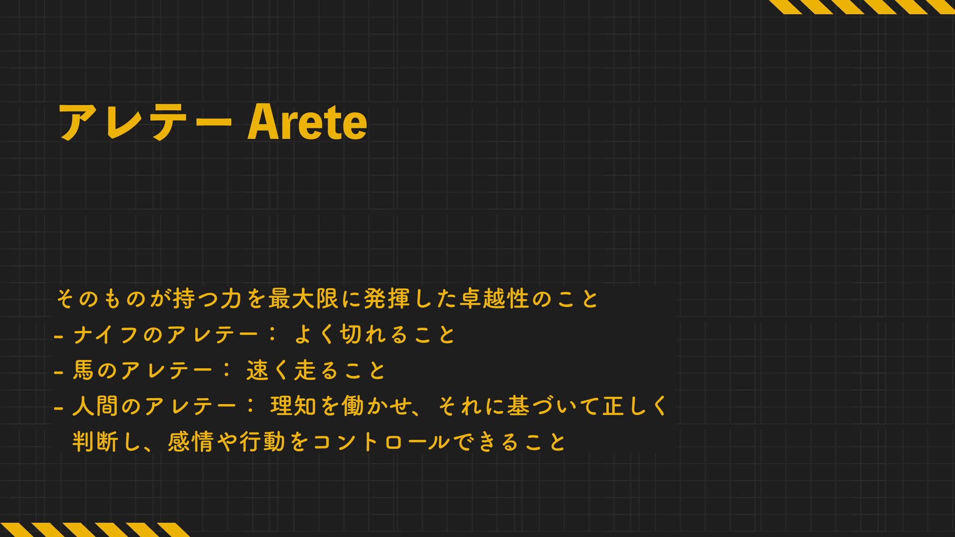ΞϨςʔ"SFUF ͦͷͷ͕࣋ͭྗΛ࠷େݶʹൃشͨ͠ӽੑͷ͜ͱ φΠϑͷΞϨςʔɿΑ͘ΕΔ͜ͱ അͷΞϨςʔɿ͘Δ͜ͱ ਓؒͷΞϨςʔɿཧΛಇ͔ͤɺͦΕʹج͍ͮͯਖ਼͘͠ அ͠ɺײߦಈΛίϯτϩʔϧͰ͖Δ͜ͱ