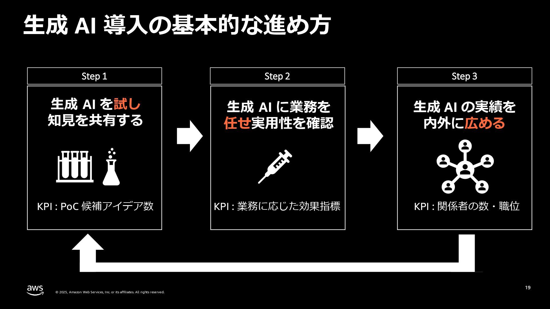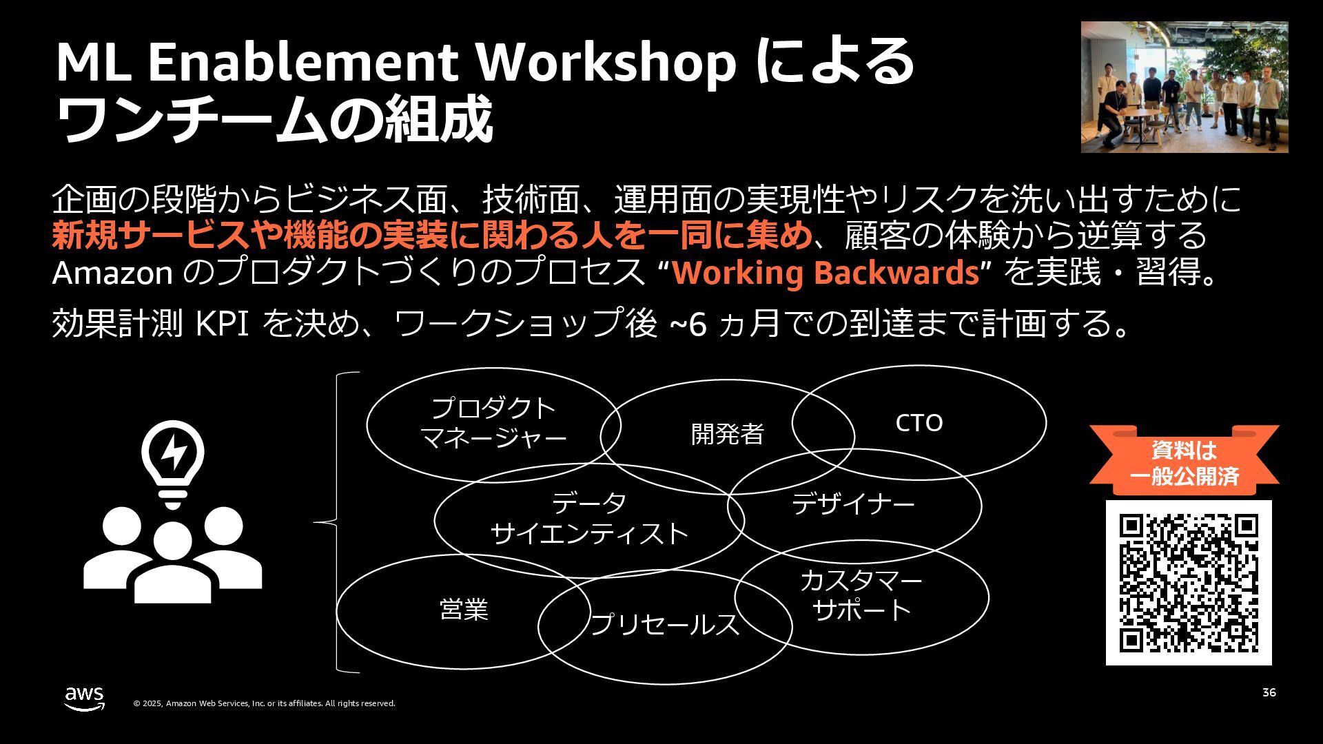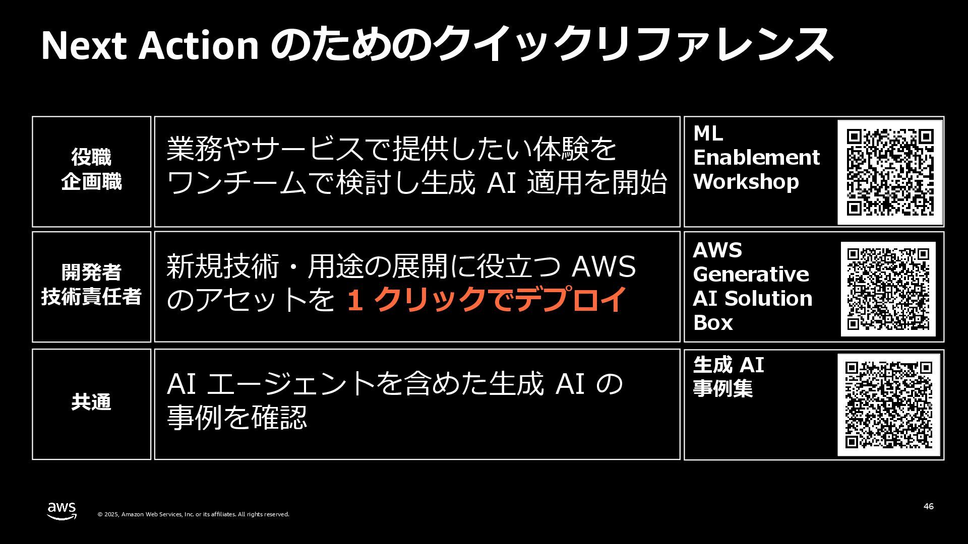 rights reserved. 46 Next Action のためのクイックリファレンス 生成 AI 事例集 AWS Generative AI Solution Box ML Enablement Workshop 役職 企画職 開発者 技術責任者 共通 業務やサービスで提供したい体験を ワンチームで検討し生成 AI 適用を開始 新規技術・用途の展開に役立つ AWS のアセットを 1 クリックでデプロイ AI エージェントを含めた生成 AI の 事例を確認