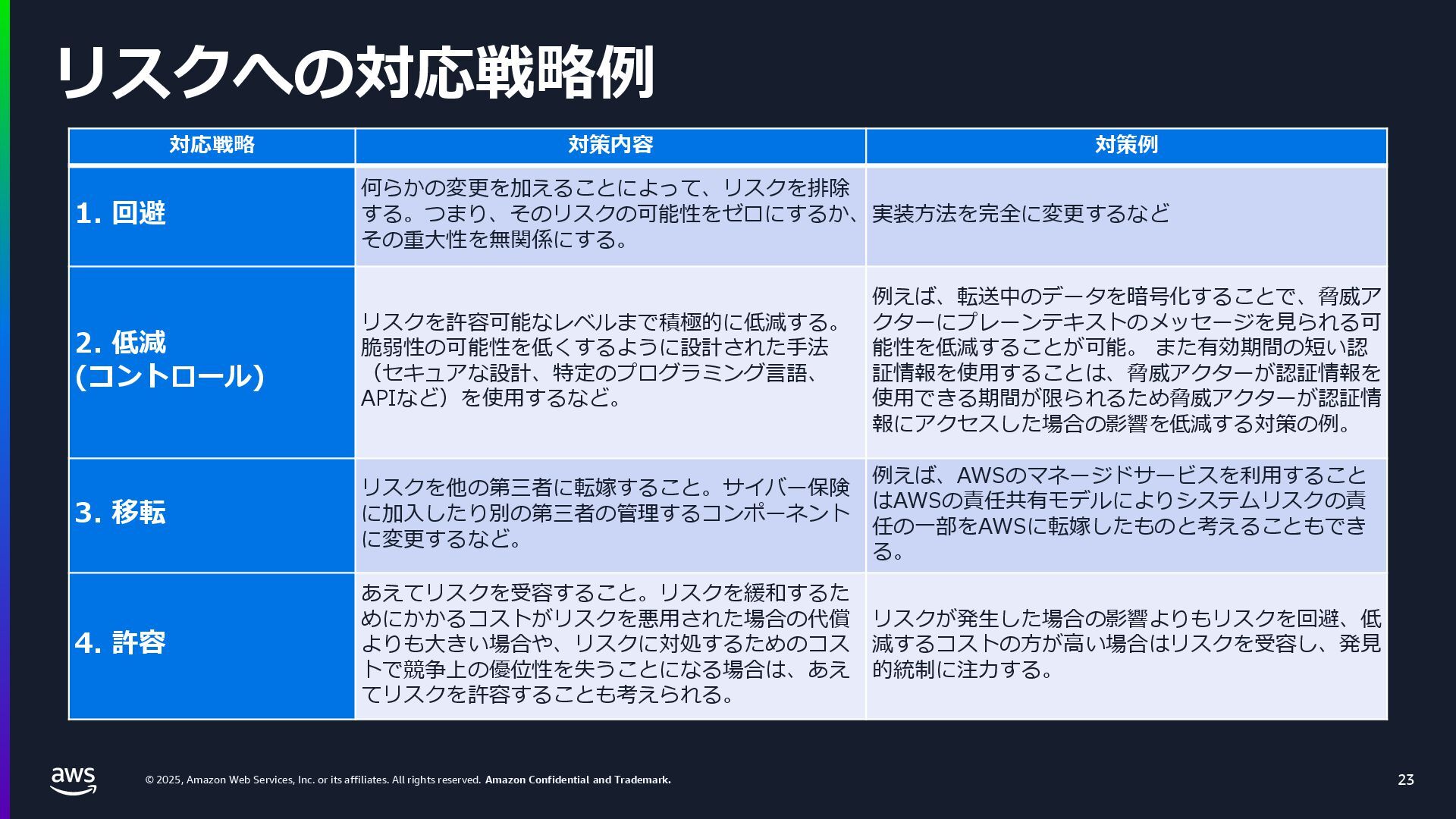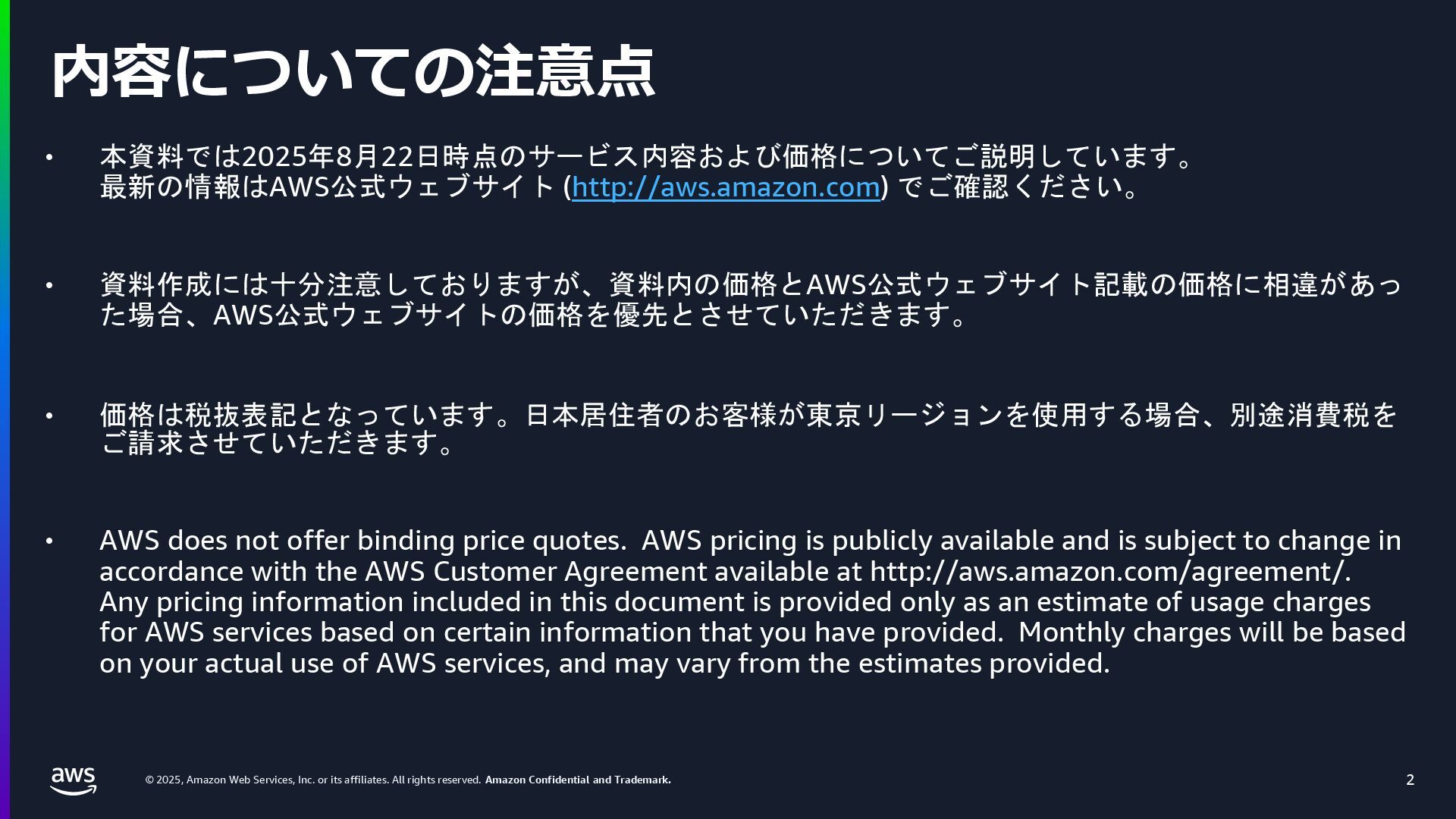 rights reserved. Amazon Confidential and Trademark. 内容についての注意点 2 • 本資料では2025年8月22日時点のサービス内容および価格についてご説明しています。 最新の情報はAWS公式ウェブサイト (http://aws.amazon.com) でご確認ください。 • 資料作成には十分注意しておりますが、資料内の価格とAWS公式ウェブサイト記載の価格に相違があっ た場合、AWS公式ウェブサイトの価格を優先とさせていただきます。 • 価格は税抜表記となっています。日本居住者のお客様が東京リージョンを使用する場合、別途消費税を ご請求させていただきます。 • AWS does not offer binding price quotes. AWS pricing is publicly available and is subject to change in accordance with the AWS Customer Agreement available at http://aws.amazon.com/agreement/. Any pricing information included in this document is provided only as an estimate of usage charges for AWS services based on certain information that you have provided. Monthly charges will be based on your actual use of AWS services, and may vary from the estimates provided.