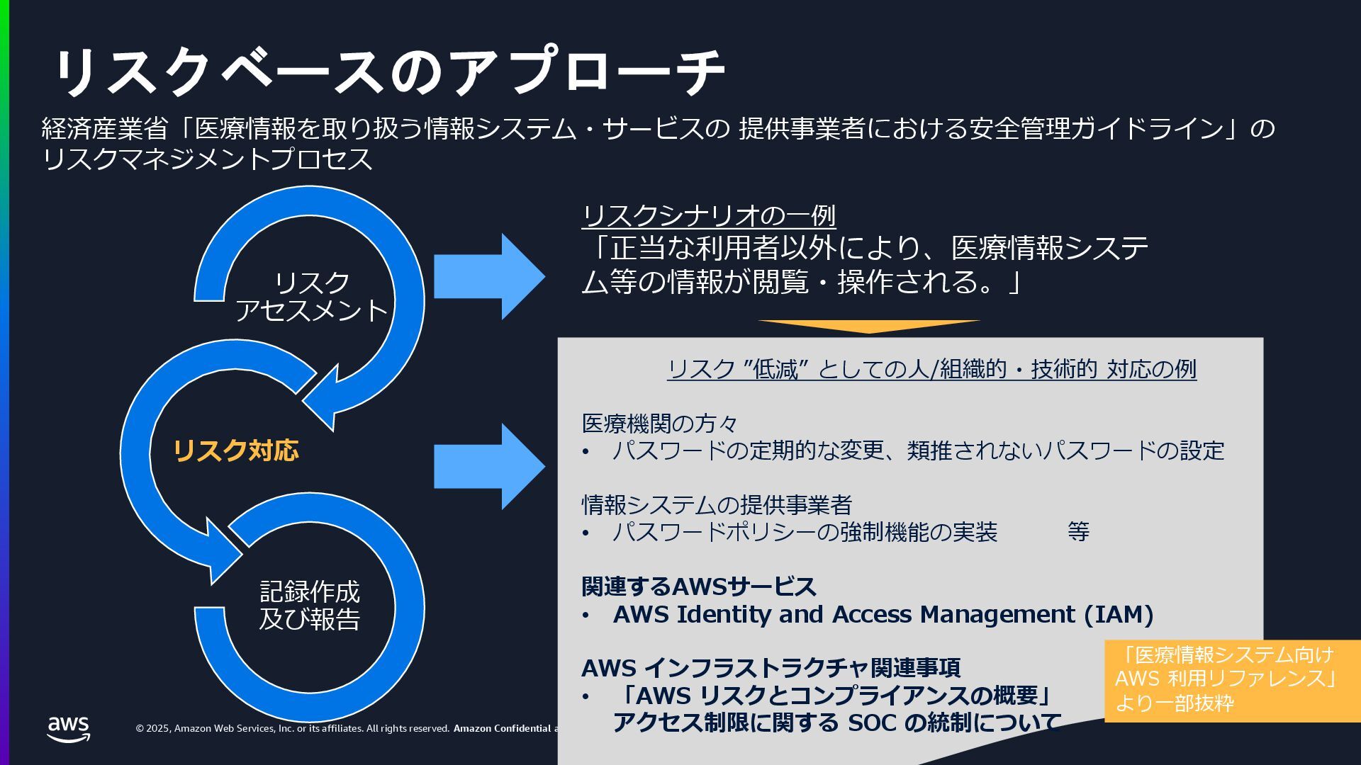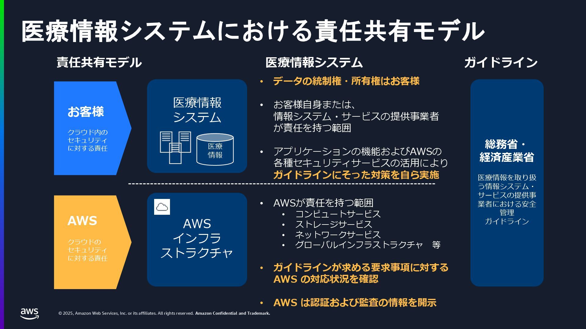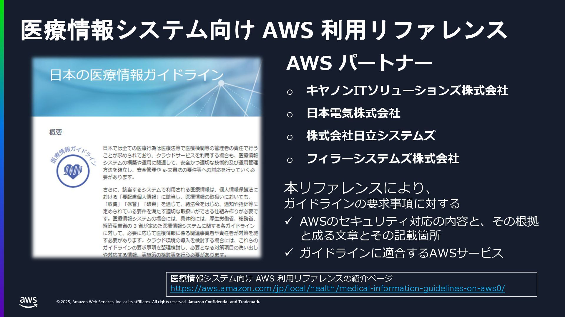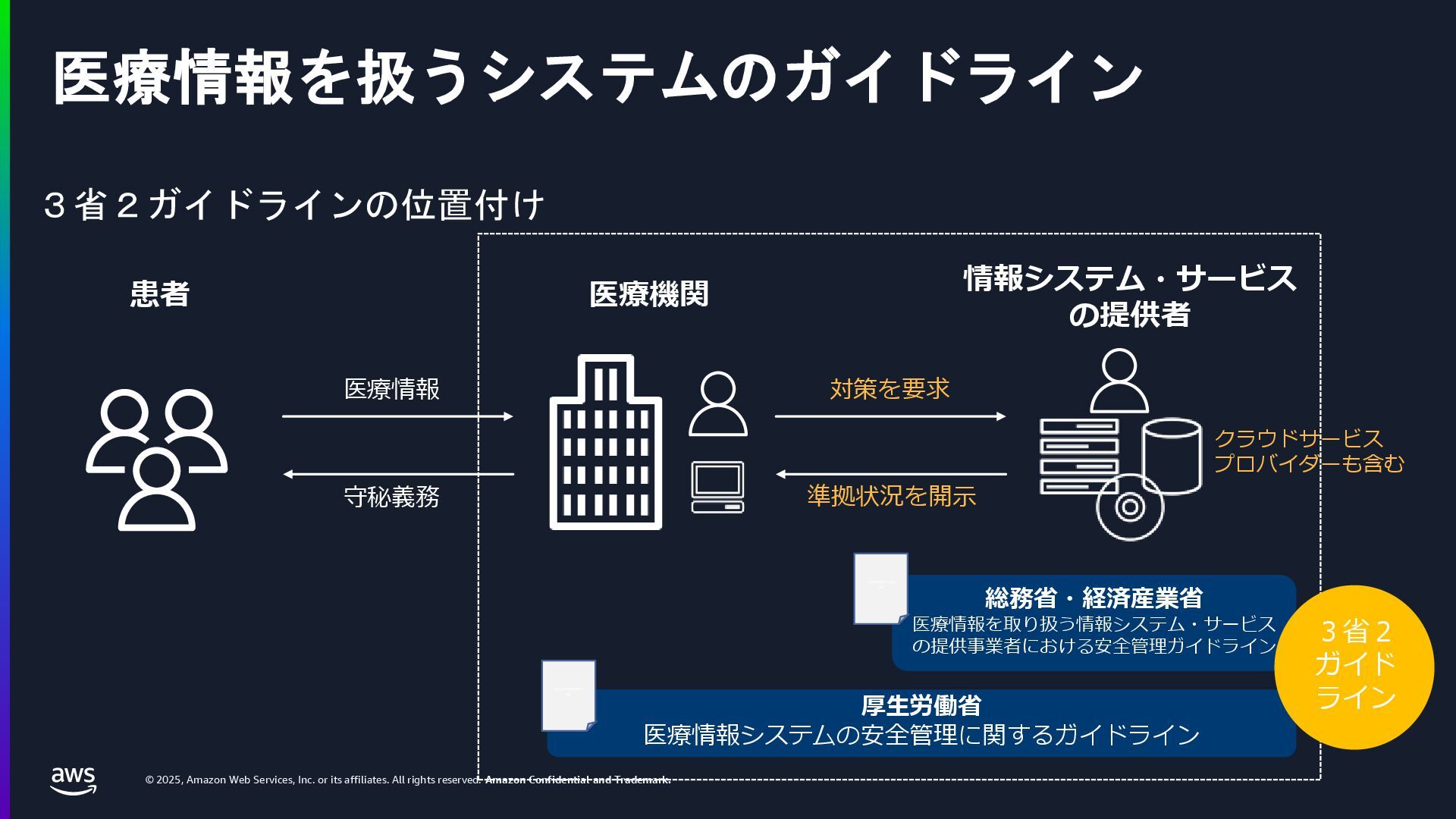 rights reserved. Amazon Confidential and Trademark. 医療情報システム向け AWS 利用リファレンス AWS パートナー o キヤノンITソリューションズ株式会社 o 日本電気株式会社 o 株式会社日立システムズ o フィラーシステムズ株式会社 医療情報システム向け AWS 利用リファレンスの紹介ページ https://aws.amazon.com/jp/local/health/medical-information-guidelines-on-aws0/ 本リファレンスにより、 ガイドラインの要求事項に対する ✓ AWSのセキュリティ対応の内容と、その根拠 と成る文章とその記載箇所 ✓ ガイドラインに適合するAWSサービス