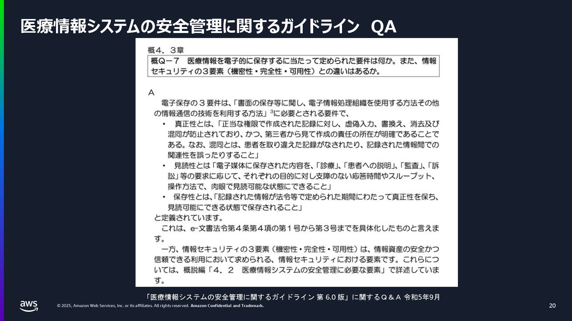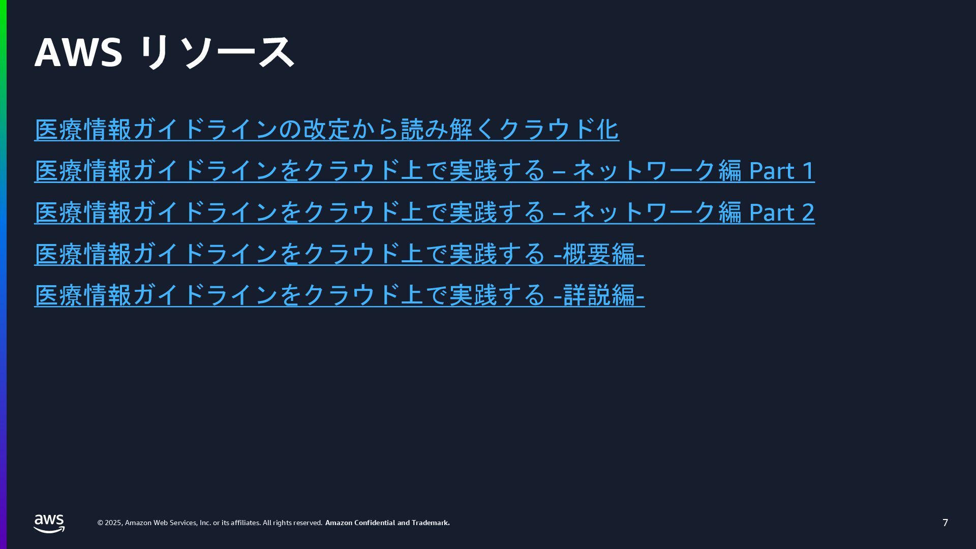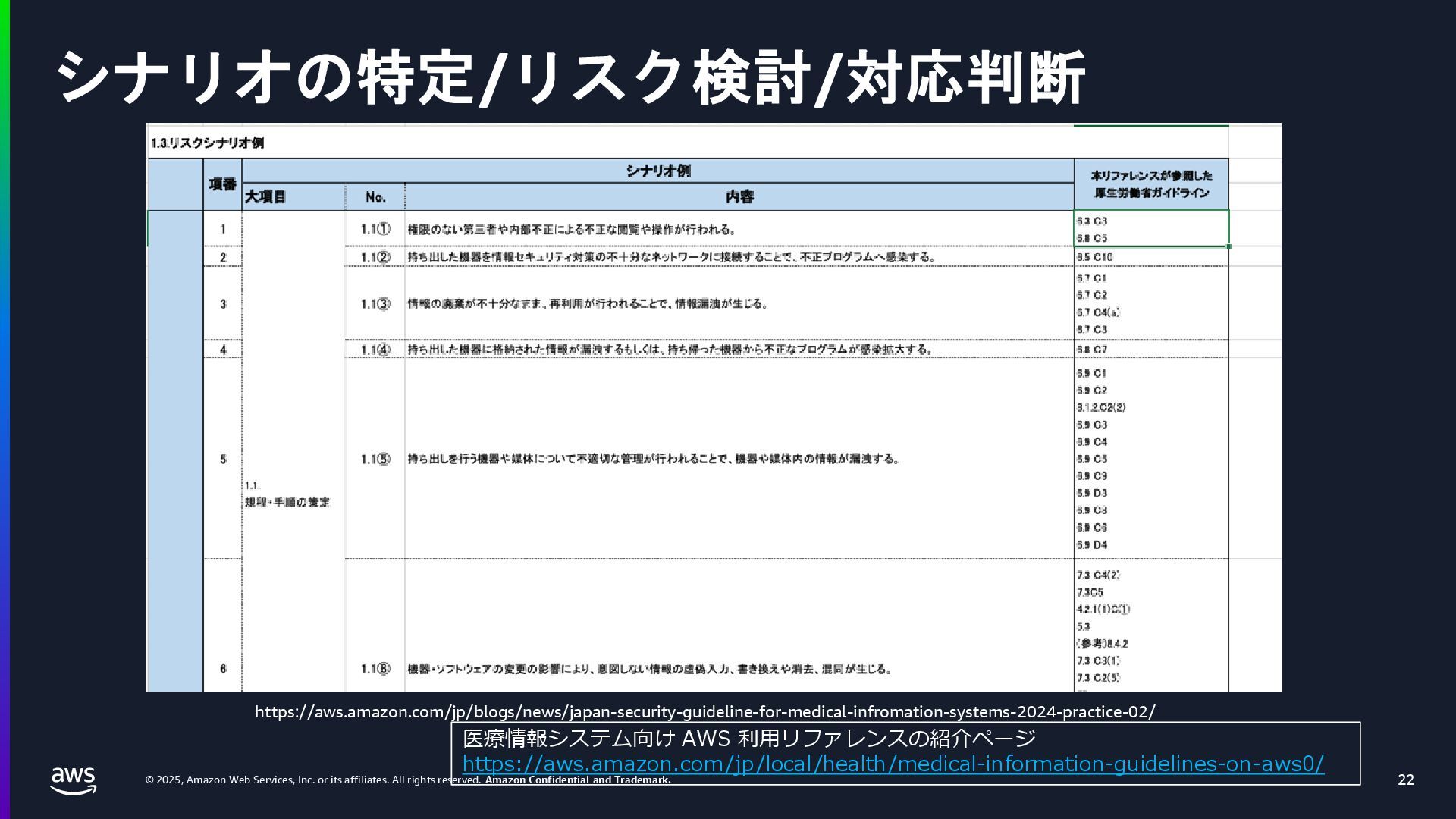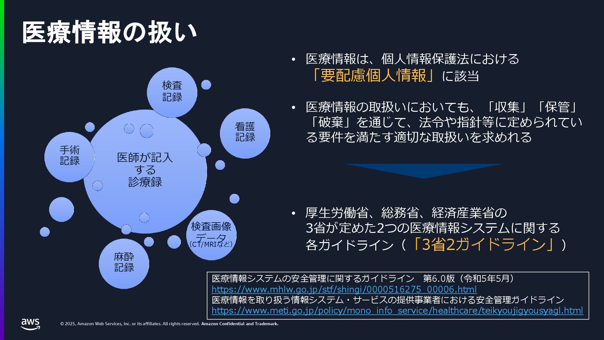 rights reserved. Amazon Confidential and Trademark. 医療情報システム向け AWS 利用リファレンス AWS パートナー o キヤノンITソリューションズ株式会社 o 日本電気株式会社 o 株式会社日立システムズ o フィラーシステムズ株式会社 医療情報システム向け AWS 利用リファレンスの紹介ページ https://aws.amazon.com/jp/local/health/medical-information-guidelines-on-aws0/ 本リファレンスにより、 ガイドラインの要求事項に対する ✓ AWSのセキュリティ対応の内容と、その根拠 と成る文章とその記載箇所 ✓ ガイドラインに適合するAWSサービス
