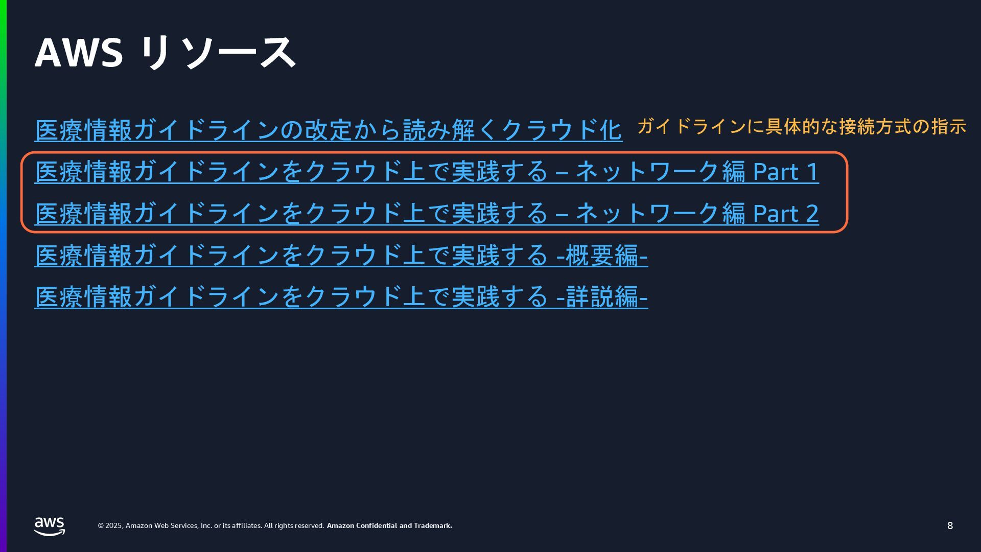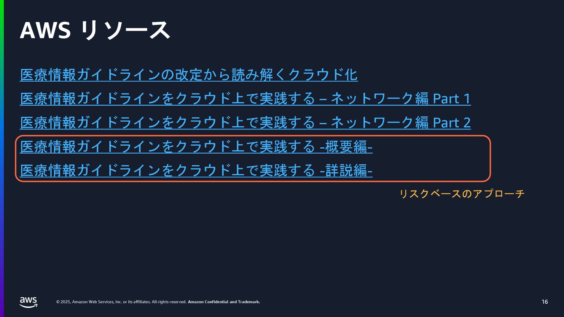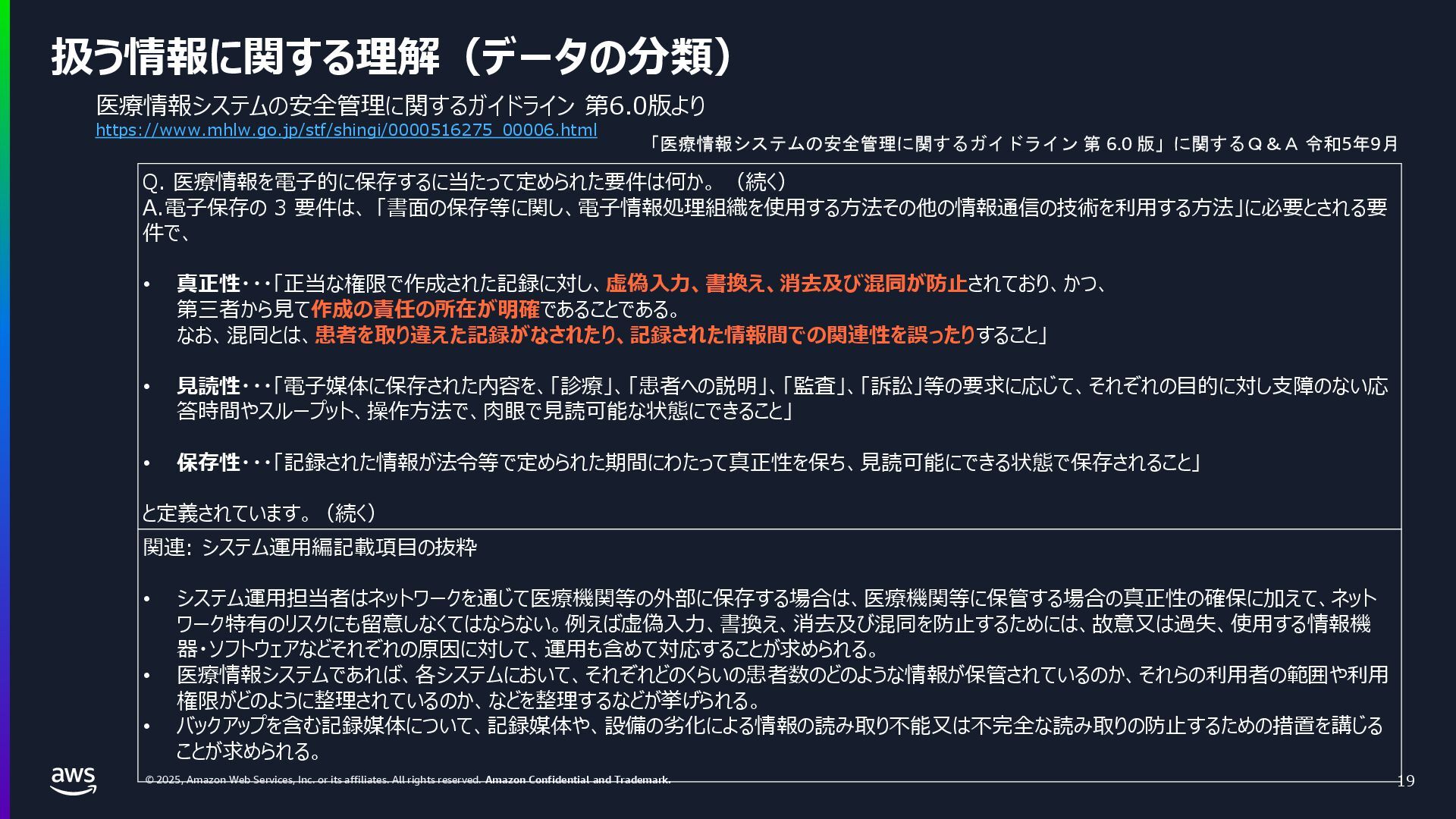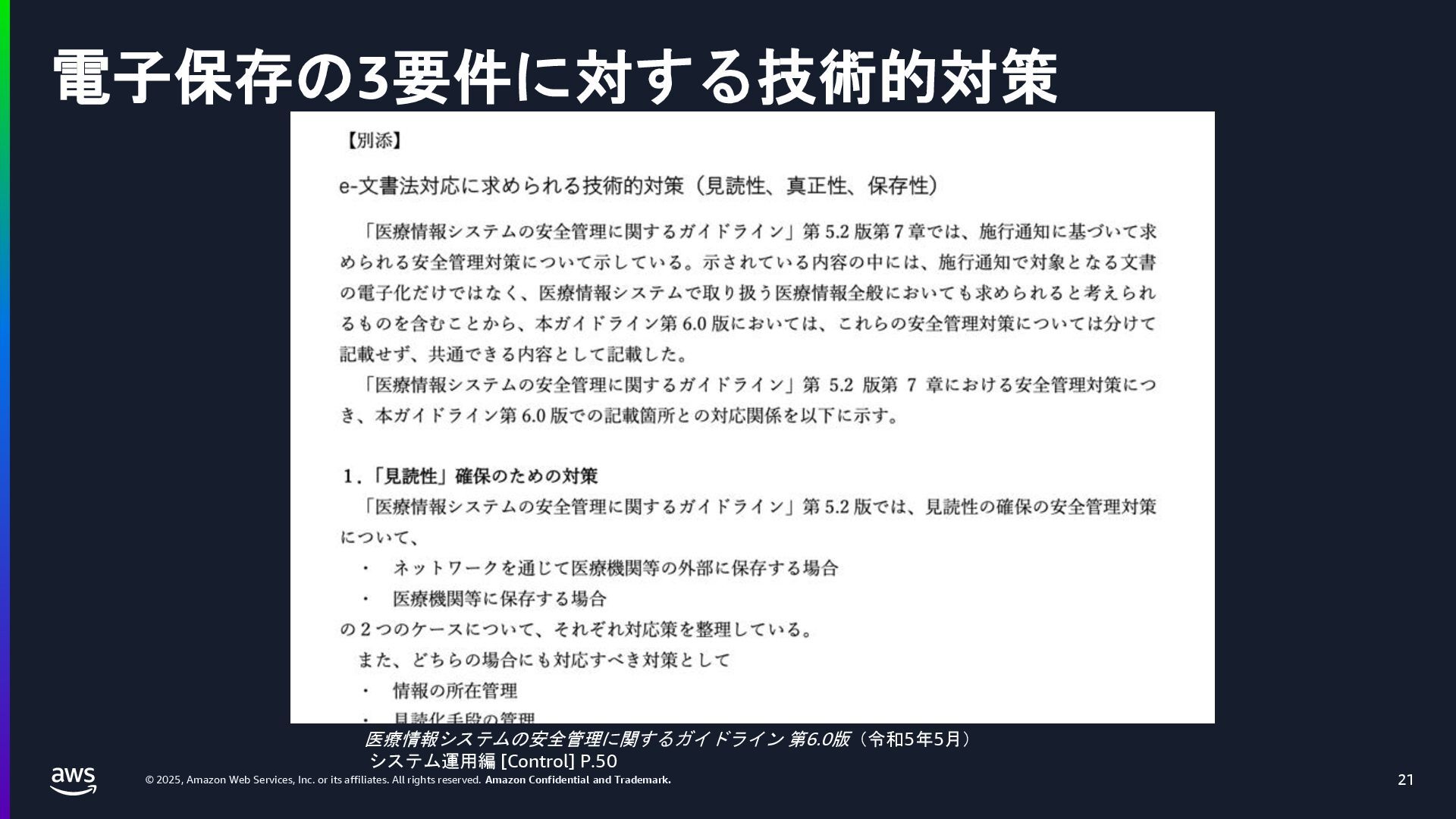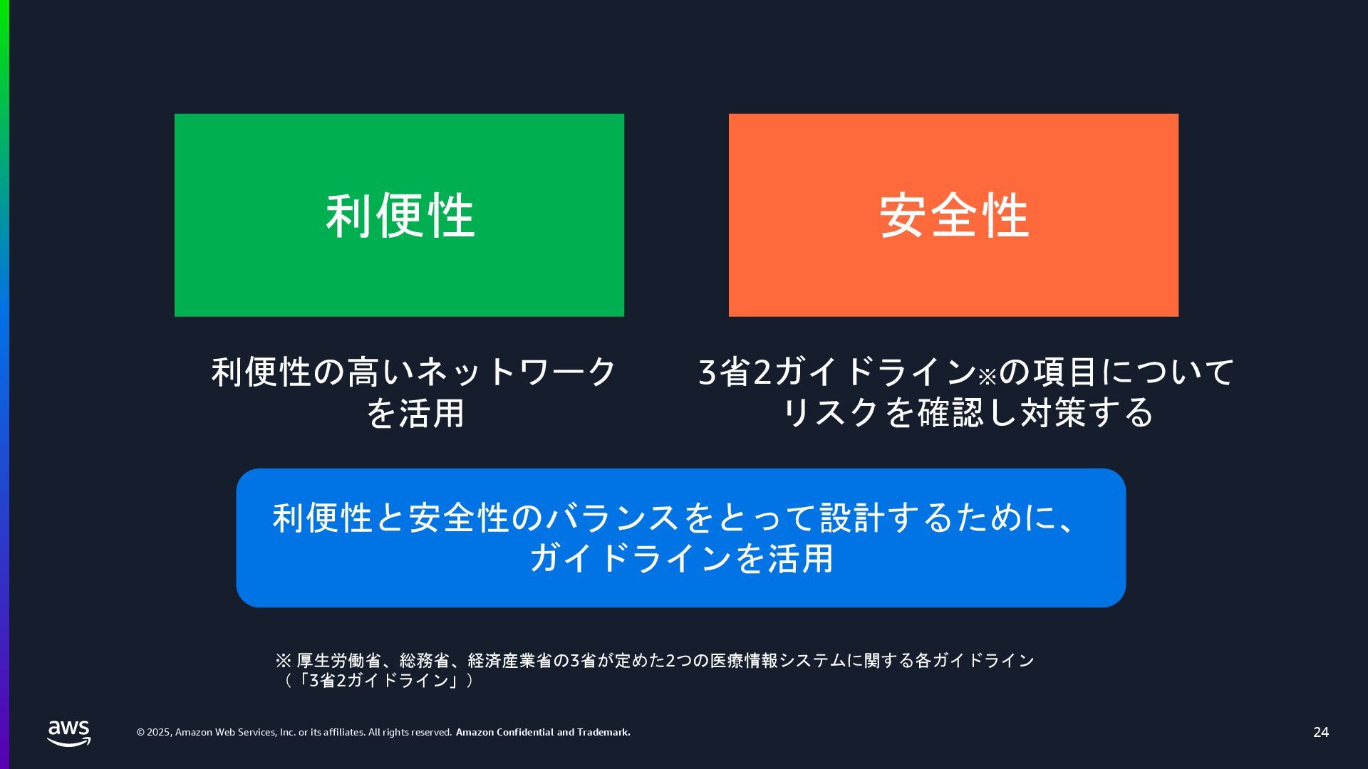 rights reserved. Amazon Confidential and Trademark. 医療情報システム向け AWS 利用リファレンス AWS パートナー o キヤノンITソリューションズ株式会社 o 日本電気株式会社 o 株式会社日立システムズ o フィラーシステムズ株式会社 医療情報システム向け AWS 利用リファレンスの紹介ページ https://aws.amazon.com/jp/local/health/medical-information-guidelines-on-aws0/ 本リファレンスにより、 ガイドラインの要求事項に対する ✓ AWSのセキュリティ対応の内容と、その根拠 と成る文章とその記載箇所 ✓ ガイドラインに適合するAWSサービス