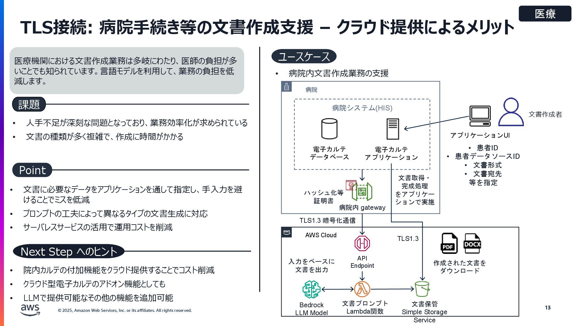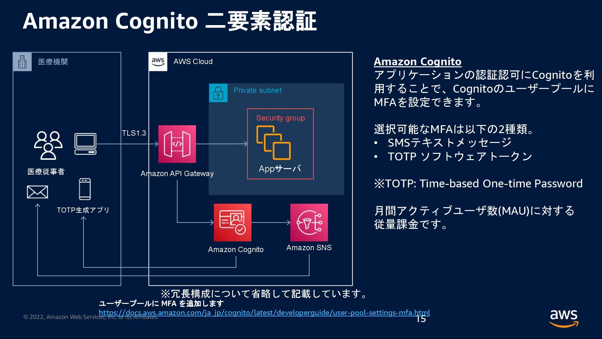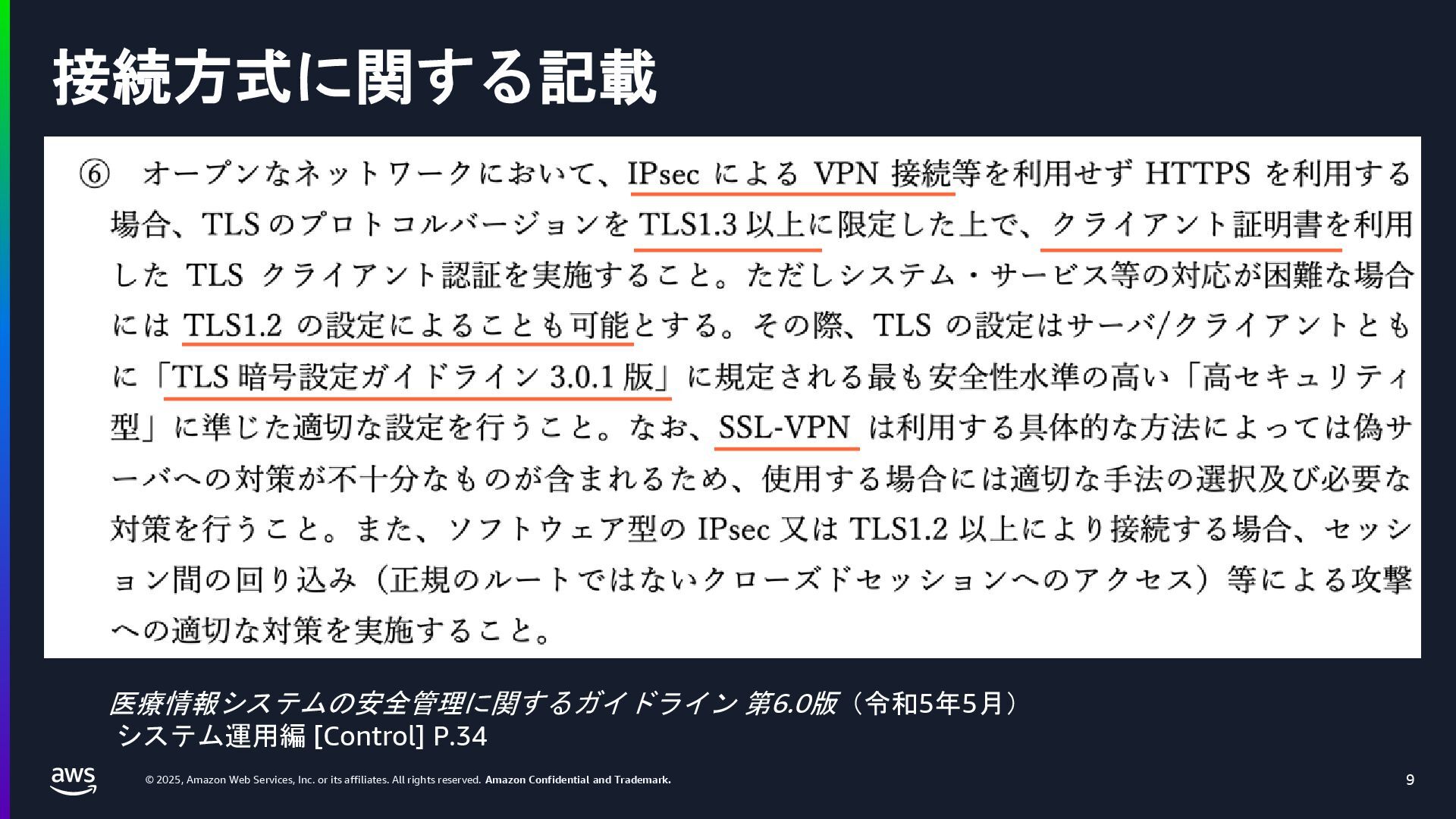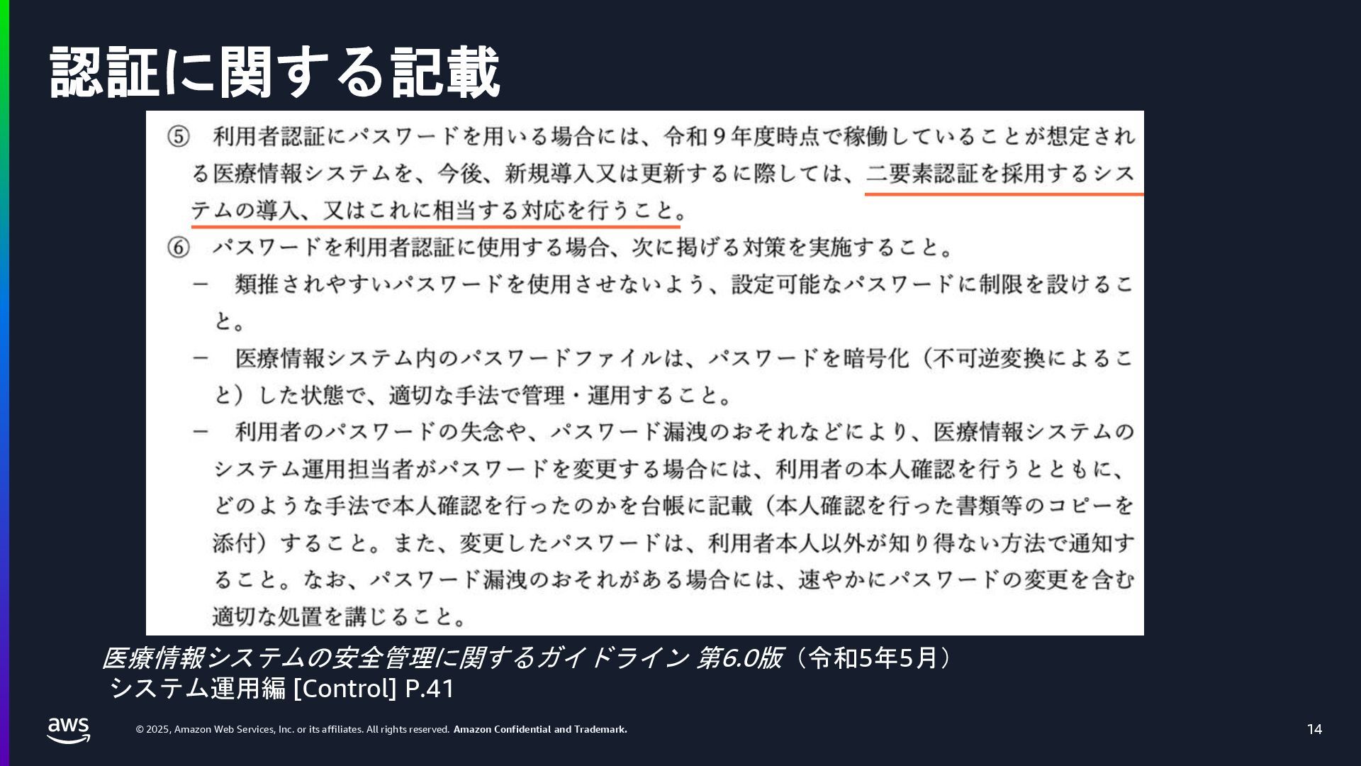 rights reserved. Amazon Confidential and Trademark. 医療情報システム向け AWS 利用リファレンス AWS パートナー o キヤノンITソリューションズ株式会社 o 日本電気株式会社 o 株式会社日立システムズ o フィラーシステムズ株式会社 医療情報システム向け AWS 利用リファレンスの紹介ページ https://aws.amazon.com/jp/local/health/medical-information-guidelines-on-aws0/ 本リファレンスにより、 ガイドラインの要求事項に対する ✓ AWSのセキュリティ対応の内容と、その根拠 と成る文章とその記載箇所 ✓ ガイドラインに適合するAWSサービス