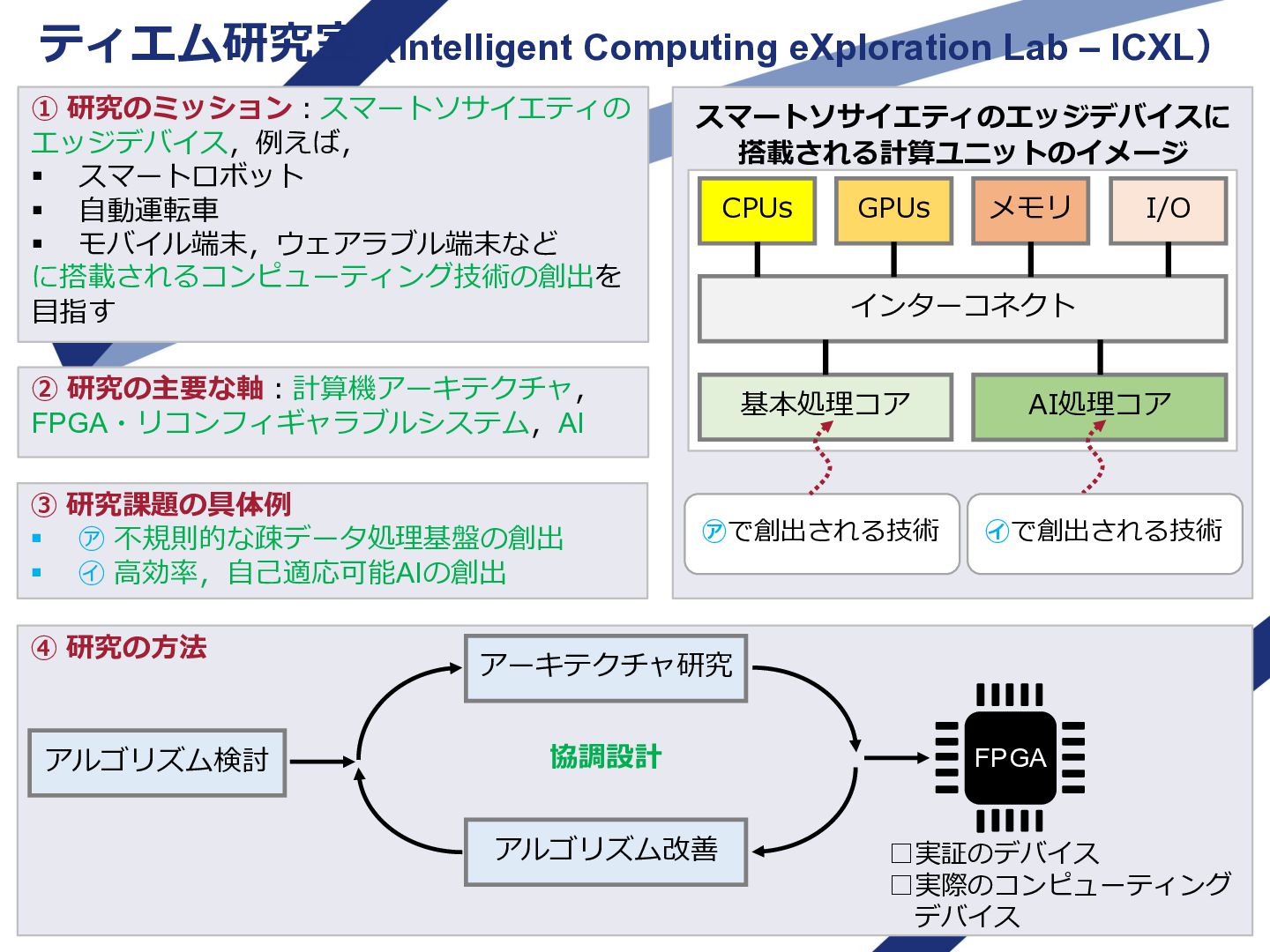 5. ティエム研究室(Intelligent Computing eXploration Lab – ICXL) ① 研究のミッション:スマートソサイエティの エッジデバイス,例えば, ▪