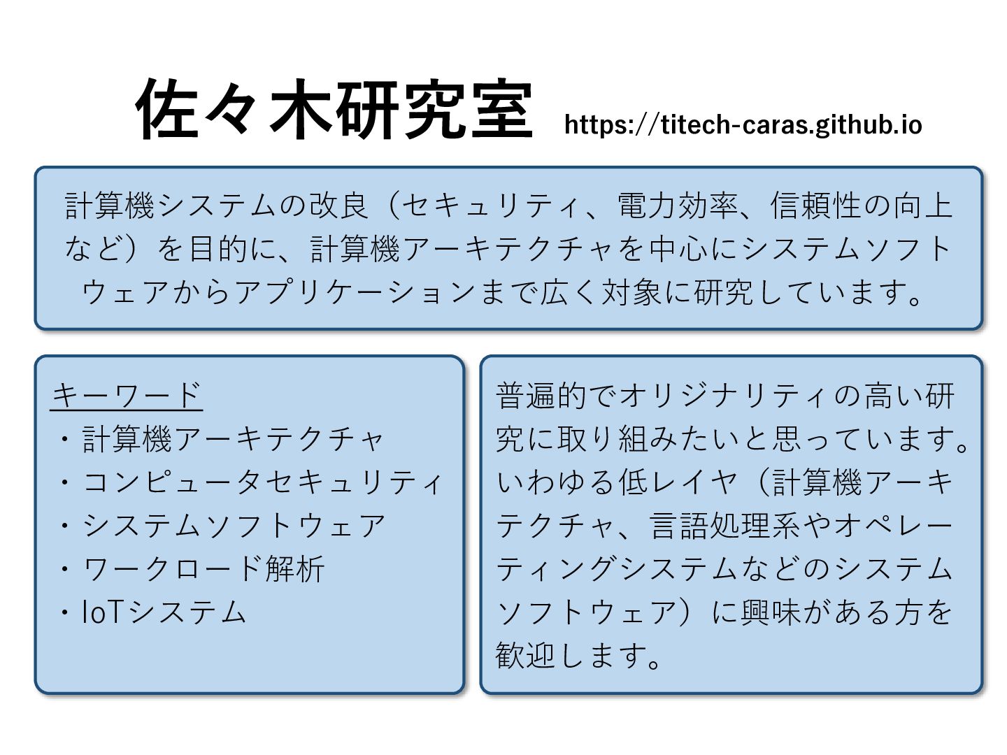 テクチャ、言語処理系やオペレー ティングシステムなどのシステム ソフトウェア)に興味がある方を 歓迎します。 計算機システムの改良(セキュリティ、電力効率、信頼性の向上 など)を目的に、計算機アーキテクチャを中心にシステムソフト ウェアからアプリケーションまで広く対象に研究しています。 https://titech-caras.github.io