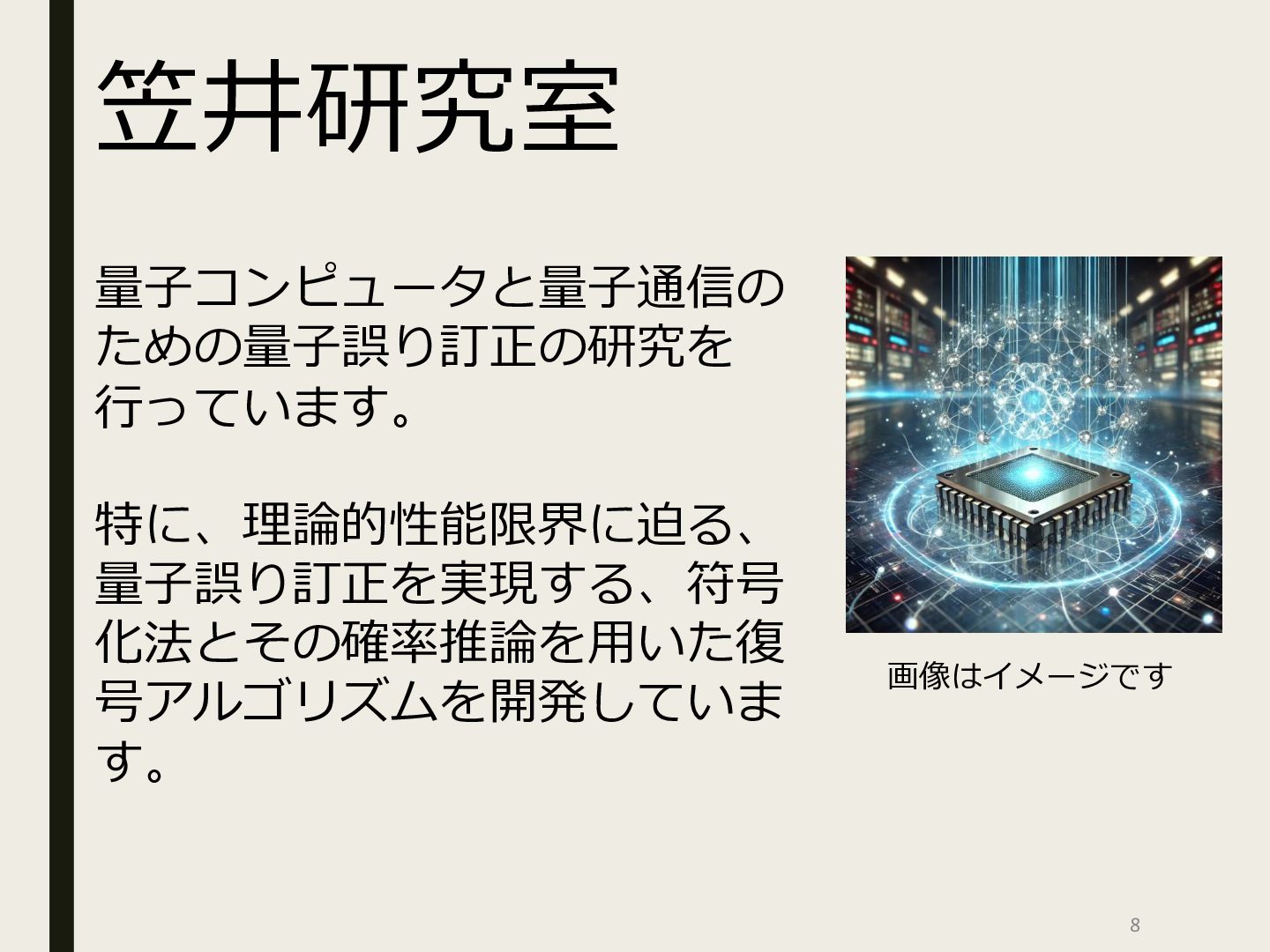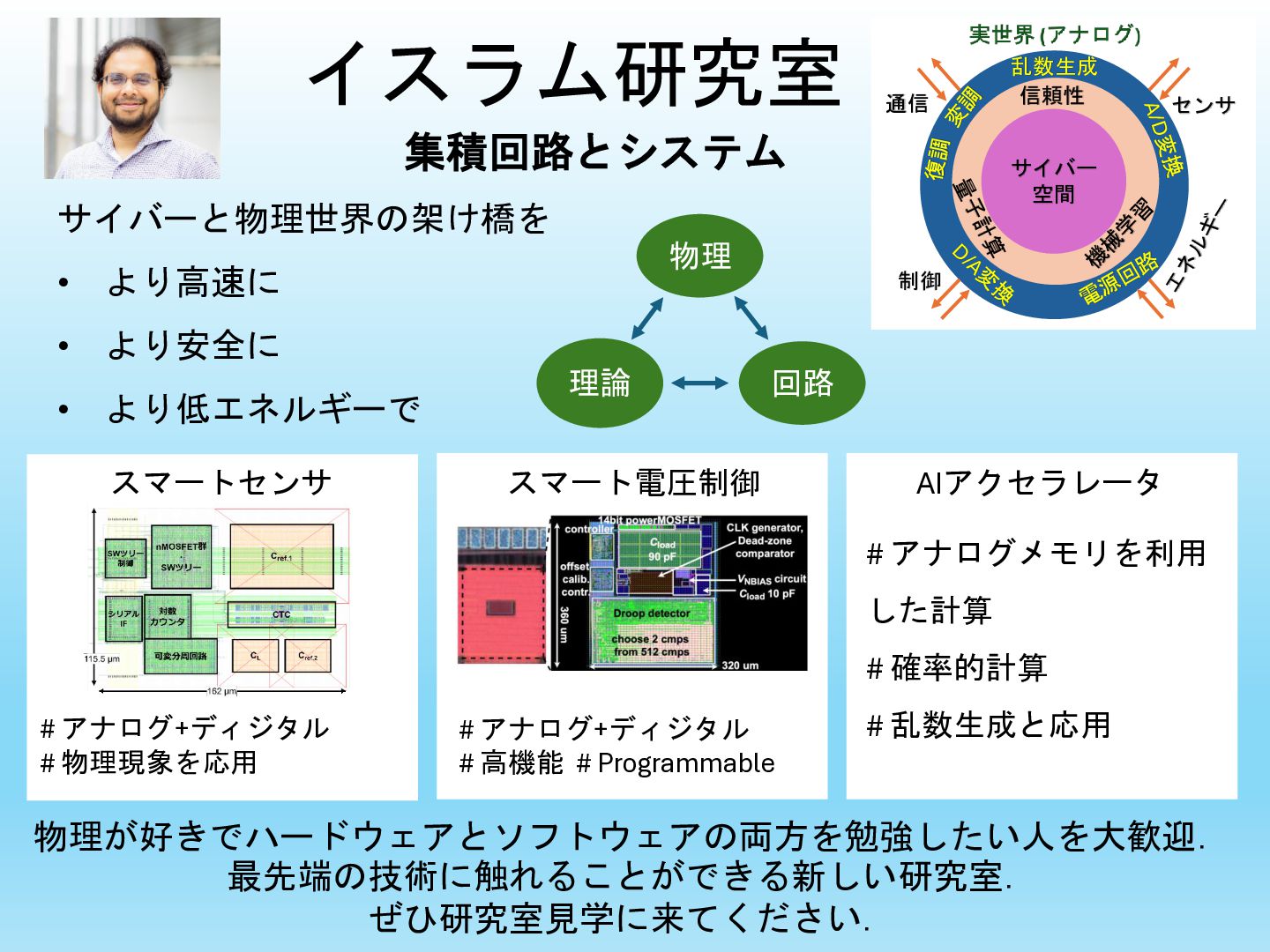 制御 信頼性 機 械 学 習 量子計算 A/D変換 電 源 回路 D/A変 換 変 調 復調 乱数生成 サイバーと物理世界の架け橋を • より高速に • より安全に • より低エネルギーで スマートセンサ 集積回路とシステム スマート電圧制御 物理が好きでハードウェアとソフトウェアの両方を勉強したい人を大歓迎. 最先端の技術に触れることができる新しい研究室. ぜひ研究室見学に来てください. AIアクセラレータ # アナログメモリを利用 した計算 # 確率的計算 # 乱数生成と応用 # アナログ+ディジタル # 物理現象を応用 # アナログ+ディジタル # 高機能 # Programmable 理論 回路 物理
