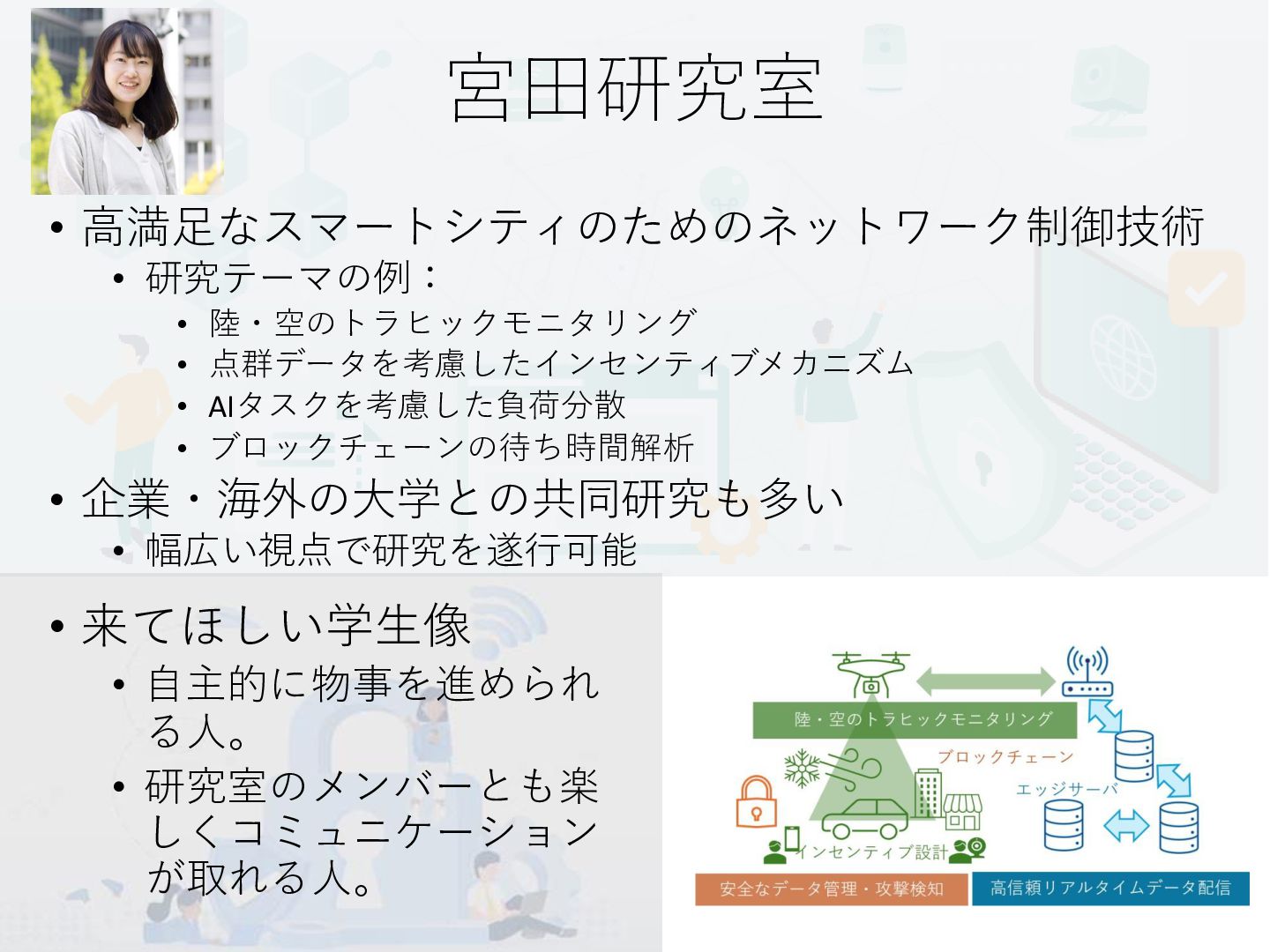 13. 宮田研究室 • 高満足なスマートシティのためのネットワーク制御技術 • 研究テーマの例: • 陸・空のトラヒックモニタリング • 点群データを考慮したインセンティブメカニズム •