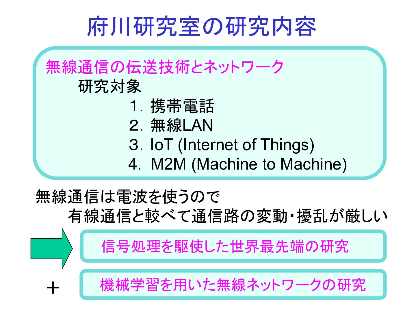 4. M2M (Machine to Machine) 無線通信は電波を使うので 有線通信と較べて通信路の変動・擾乱が厳しい 信号処理を駆使した世界最先端の研究 + 機械学習を用いた無線ネットワークの研究
