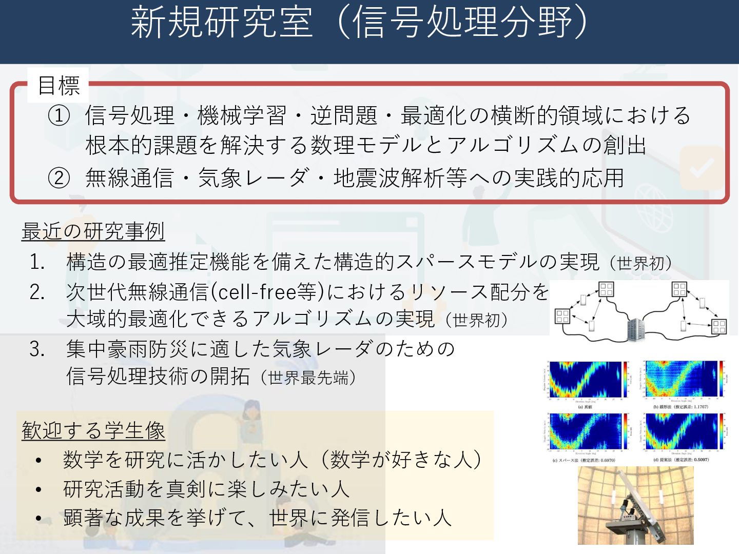大域的最適化できるアルゴリズムの実現(世界初) 3. 集中豪雨防災に適した気象レーダのための 信号処理技術の開拓(世界最先端) 最近の研究事例 歓迎する学生像 新規研究室(信号処理分野) • 数学を研究に活かしたい人(数学が好きな人) • 研究活動を真剣に楽しみたい人 • 顕著な成果を挙げて、世界に発信したい人