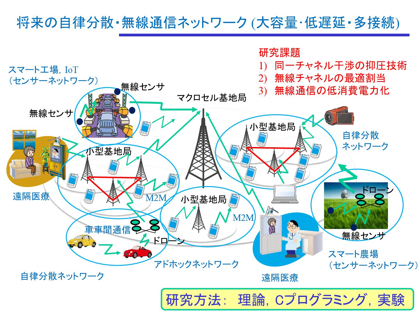 小型基地局 自律分散ネットワーク 自律分散 ネットワーク スマート工場,IoT (センサーネットワーク) M2M スマート農場 (センサーネットワーク) M2M ドローン アドホックネットワーク 車車間通信 ドローン 無線センサ 無線センサ 無線センサ 研究課題 1) 同一チャネル干渉の抑圧技術 2) 無線チャネルの最適割当 3) 無線通信の低消費電力化