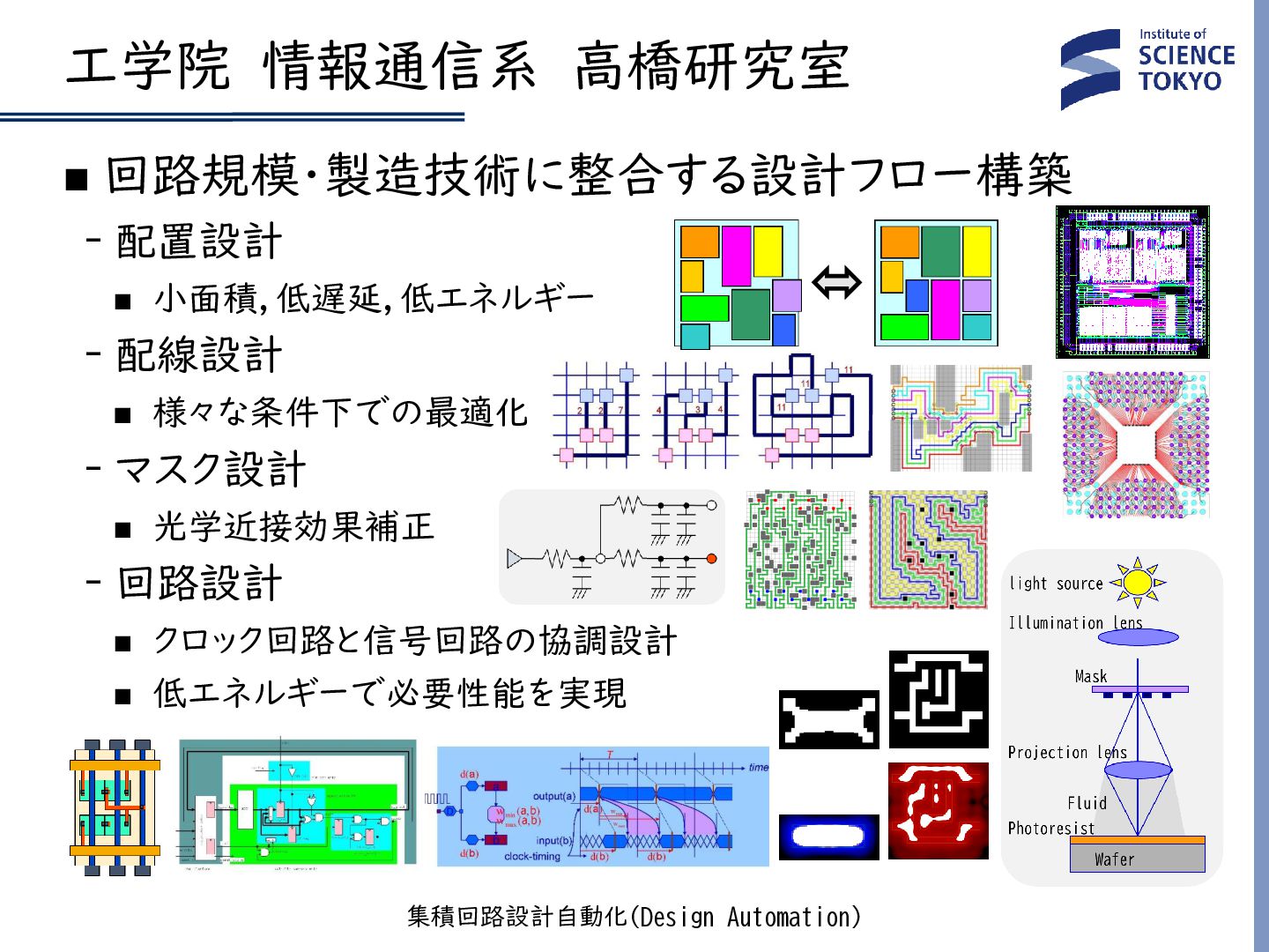 光学近接効果補正 ‐回路設計 ◼ クロック回路と信号回路の協調設計 ◼ 低エネルギーで必要性能を実現 工学院 情報通信系 高橋研究室 集積回路設計自動化(Design Automation)