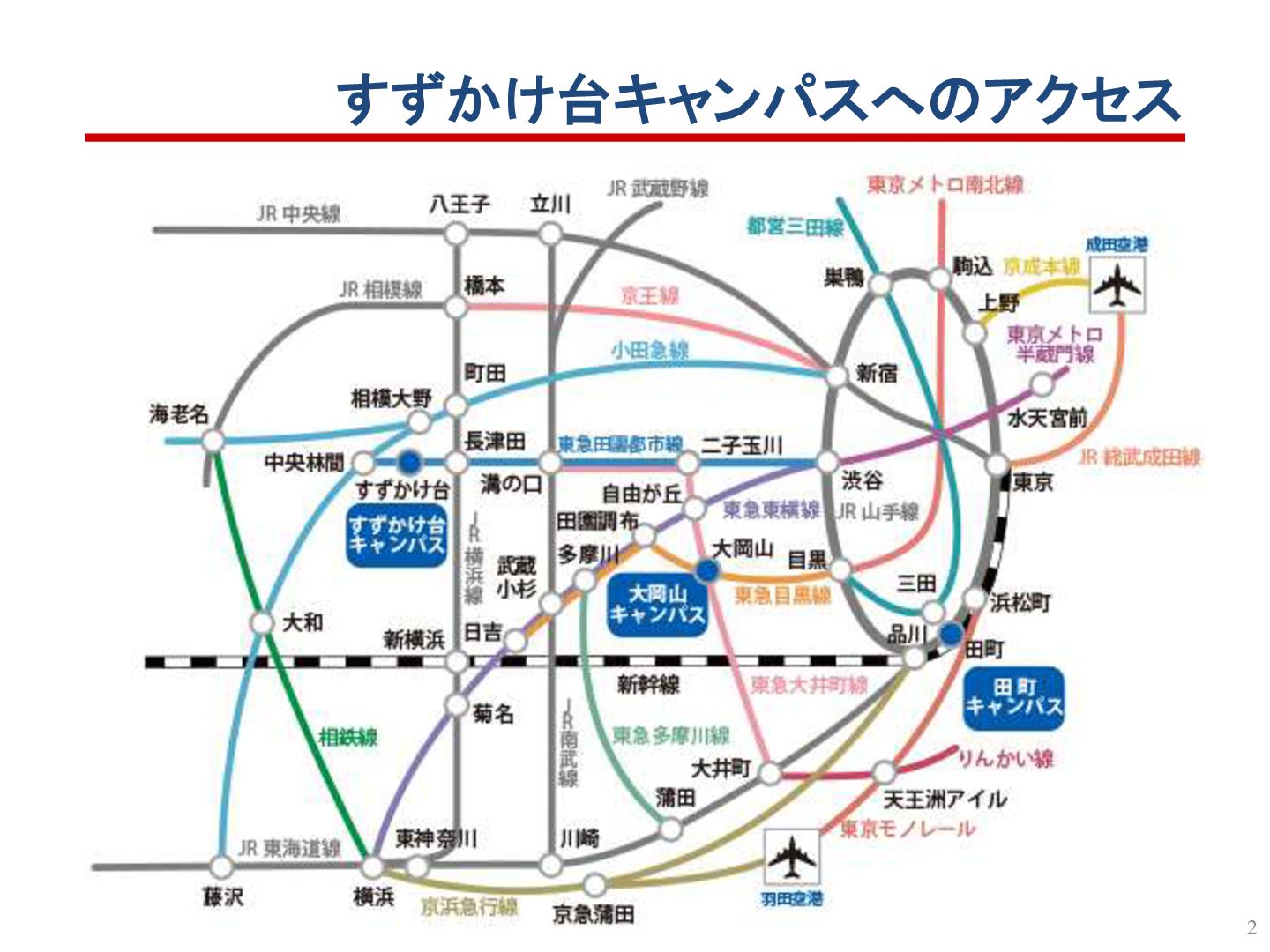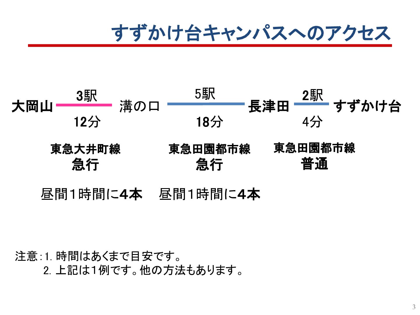 1. すずかけ台キャンパスへのアクセス 注意:1. 時間はあくまで目安です。 2. 上記は1例です。他の方法もあります。 大岡山 18分 すずかけ台 長津田 2駅