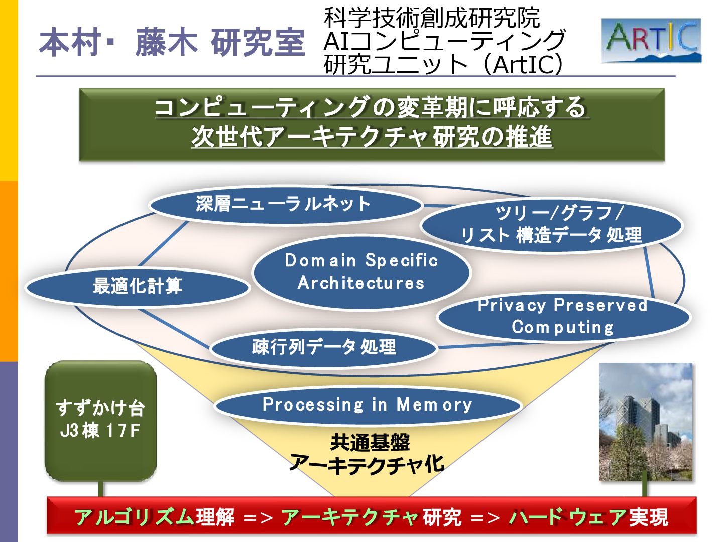 本村・ 藤⽊ 研究室 すずかけ台 J3 棟 1 7 F コ ンピュ ーティ ングの変⾰期に呼応する 次世代アーキテク チャ 研究の推進 アルゴリ ズム理解 => アーキテク チャ 研究 => ハード ウェ ア実現 深層ニュ ーラ ルネッ ト ツリ ー/グラ フ / リ スト 構造データ 処理 Priva cy Preserved Com p u tin g Dom a in Sp ecific Arch itectu res 最適化計算 疎⾏列データ 処理