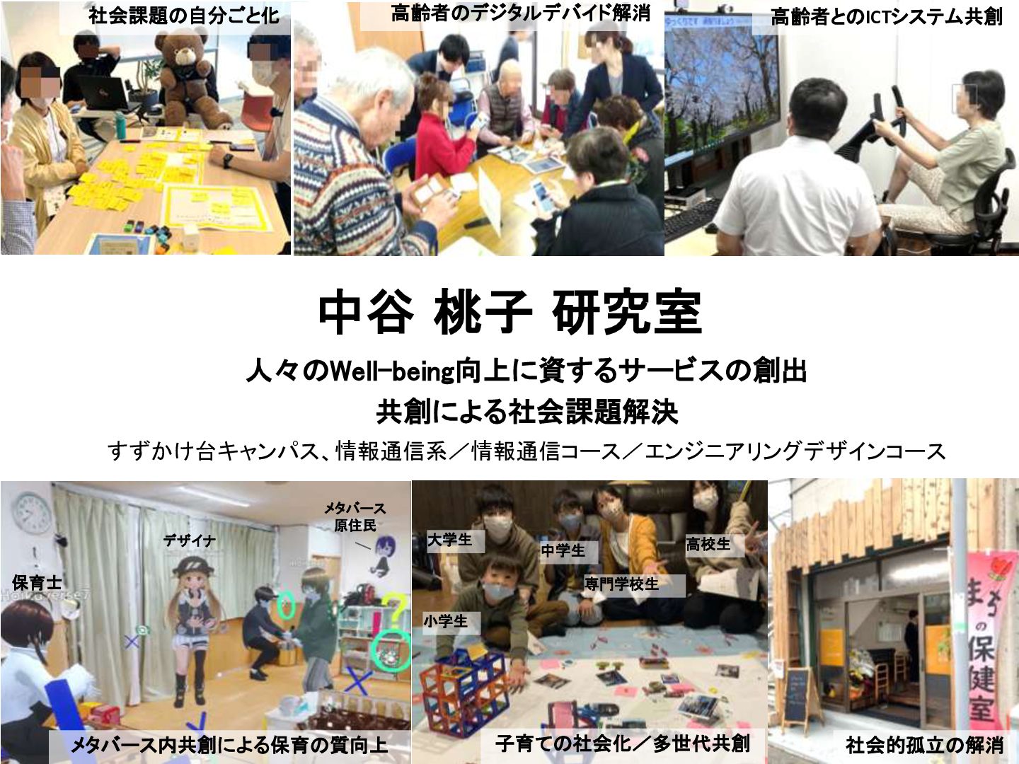 桃子 研究室 人々のWell-being向上に資するサービスの創出 共創による社会課題解決 高齢者とのICTシステム共創 すずかけ台キャンパス、情報通信系/情報通信コース/エンジニアリングデザインコース 高齢者のデジタルデバイド解消 メタバース内共創による保育の質向上 社会課題の自分ごと化 子育ての社会化/多世代共創 社会的孤立の解消