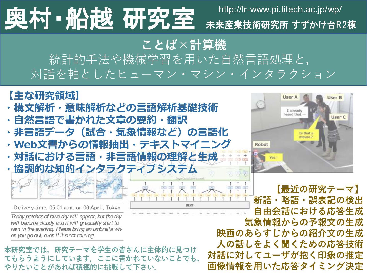 ・自然言語で書かれた文章の要約・翻訳 ・非言語データ(試合・気象情報など)の言語化 ・Web文書からの情報抽出・テキストマイニング ・対話における言語・非言語情報の理解と生成 ・協調的な知的インタラクティブシステム 【最近の研究テーマ】 新語・略語・誤表記の検出 自由会話における応答生成 気象情報からの予報文の生成 映画のあらすじからの紹介文の生成 人の話しをよく聞くための応答技術 対話に対してユーザが抱く印象の推定 画像情報を用いた応答タイミング決定 本研究室では,研究テーマを学生の皆さんに主体的に見つけ てもらうようにしています.ここに書かれていないことでも, やりたいことがあれば積極的に挑戦して下さい.