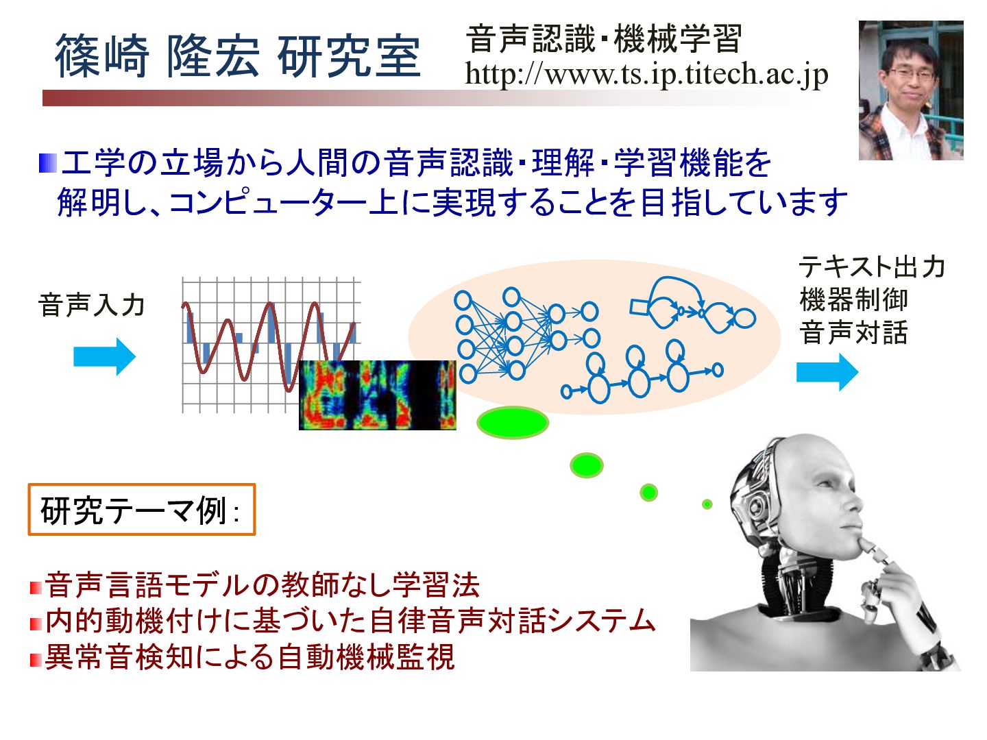 音声対話 研究テーマ例: 音声言語モデルの教師なし学習法 内的動機付けに基づいた自律音声対話システム 異常音検知による自動機械監視
