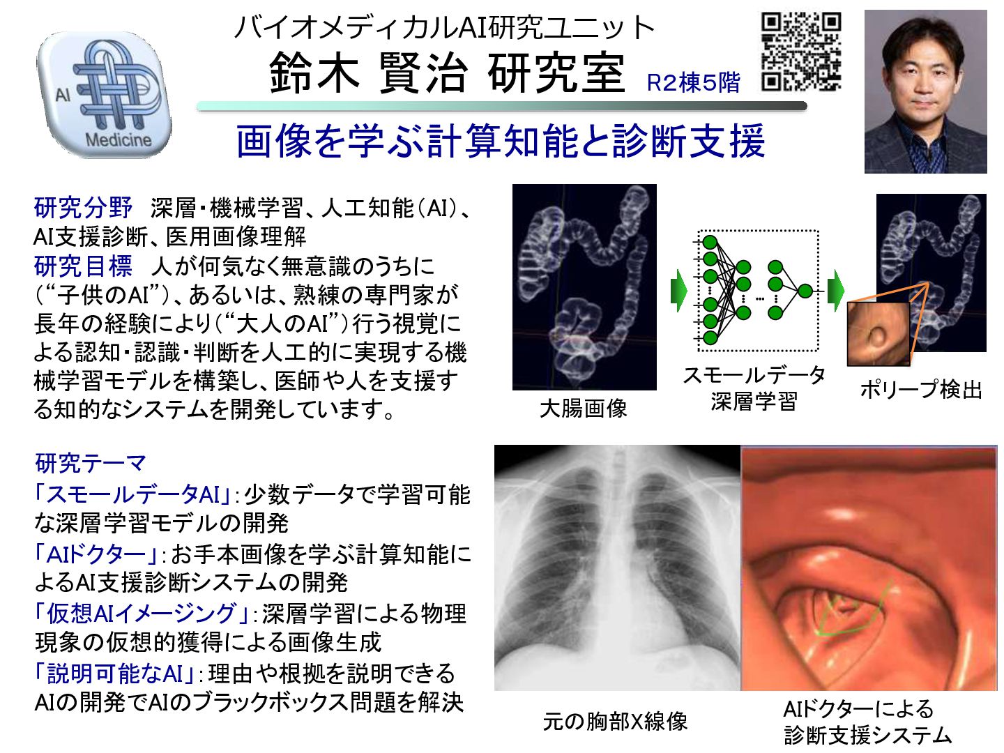 「説明可能なAI」:理由や根拠を説明できる AIの開発でAIのブラックボックス問題を解決 研究分野 深層・機械学習、人工知能(AI)、 AI支援診断、医用画像理解 研究目標 人が何気なく無意識のうちに (“子供のAI”)、あるいは、熟練の専門家が 長年の経験により(“大人のAI”)行う視覚に よる認知・認識・判断を人工的に実現する機 械学習モデルを構築し、医師や人を支援す る知的なシステムを開発しています。 画像を学ぶ計算知能と診断支援 大腸画像 スモールデータ 深層学習 ポリープ検出 R2棟5階 AIドクターによる 診断支援システム 骨成分除去画像 元の胸部X線像 バイオメディカルAI研究ユニット