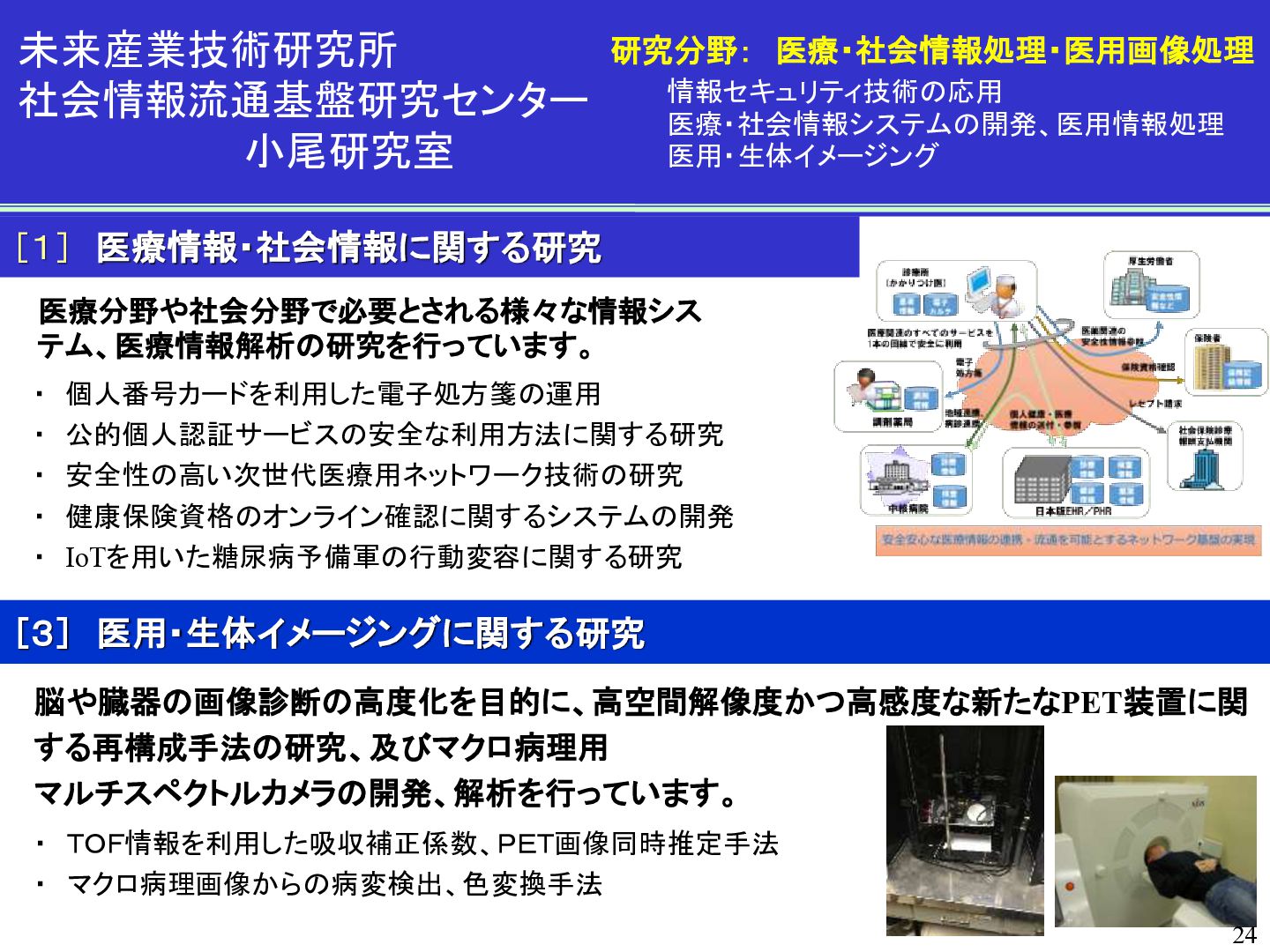 医療・社会情報システムの開発、医用情報処理 医用・生体イメージング ・ 個人番号カードを利用した電子処方箋の運用 ・ 公的個人認証サービスの安全な利用方法に関する研究 ・ 安全性の高い次世代医療用ネットワーク技術の研究 ・ 健康保険資格のオンライン確認に関するシステムの開発 ・ IoTを用いた糖尿病予備軍の行動変容に関する研究 [3] 医用・生体イメージングに関する研究 脳や臓器の画像診断の高度化を目的に、高空間解像度かつ高感度な新たなPET装置に関 する再構成手法の研究、及びマクロ病理用 マルチスペクトルカメラの開発、解析を行っています。 ・ TOF情報を利用した吸収補正係数、PET画像同時推定手法 ・ マクロ病理画像からの病変検出、色変換手法 24
