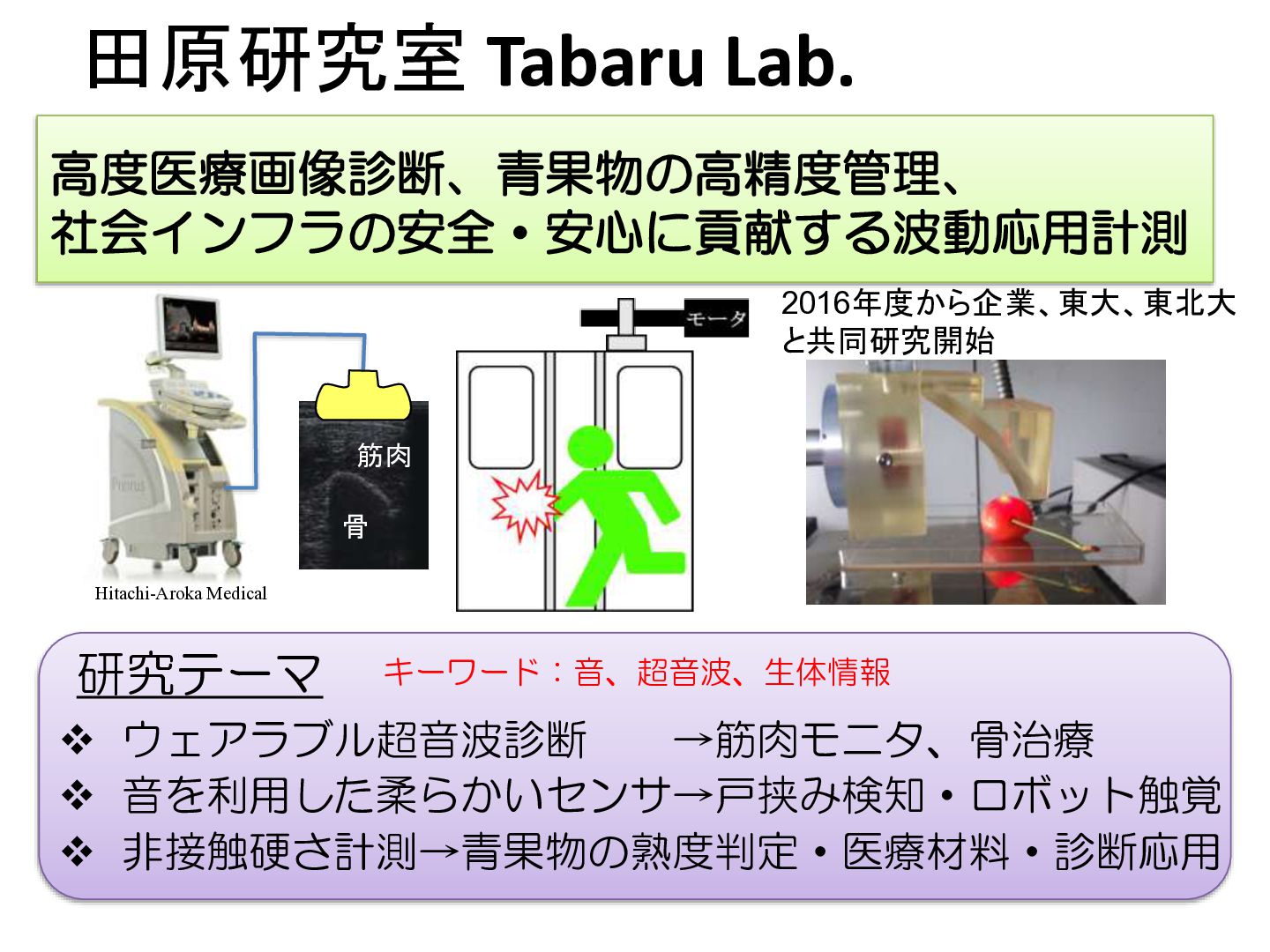 Hitachi-Aroka Medical 骨 筋肉 研究テーマ 高度医療画像診断、青果物の高精度管理、 社会インフラの安全・安心に貢献する波動応用計測 2016年度から企業、東大、東北大 と共同研究開始 キーワード:音、超音波、生体情報