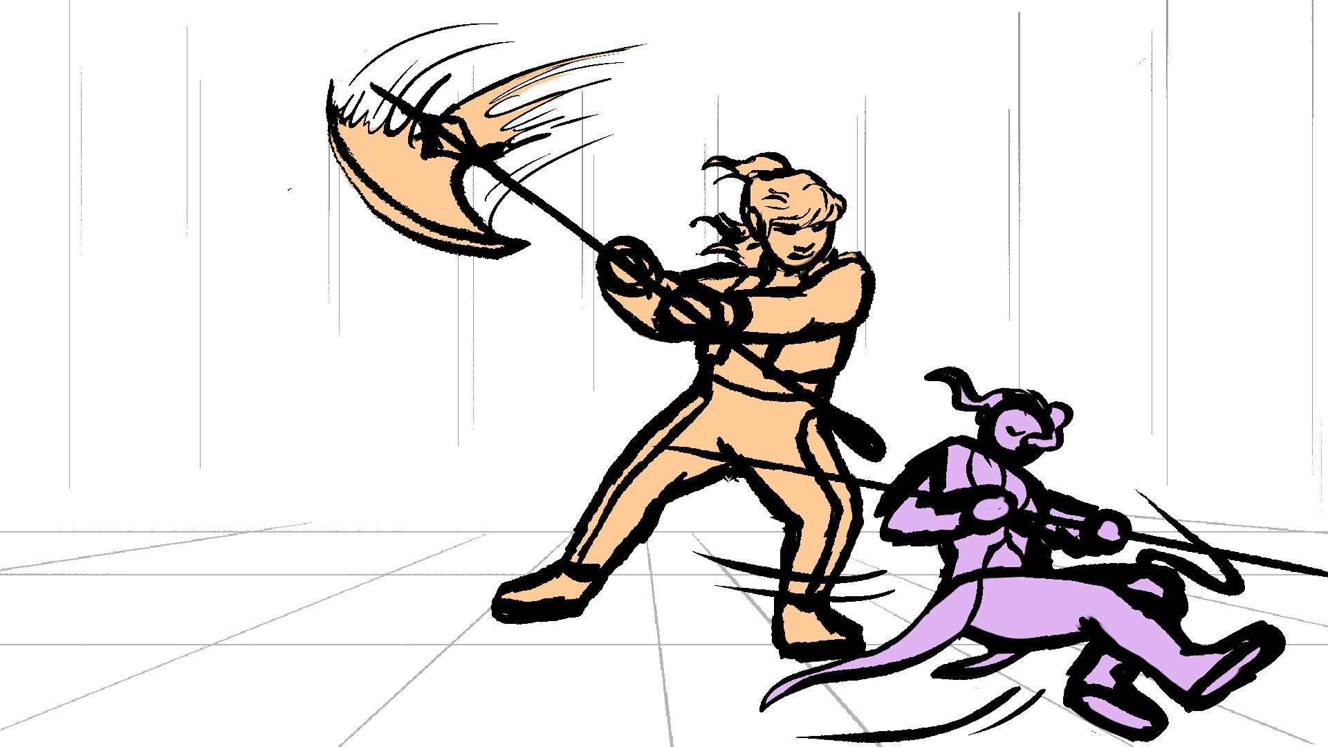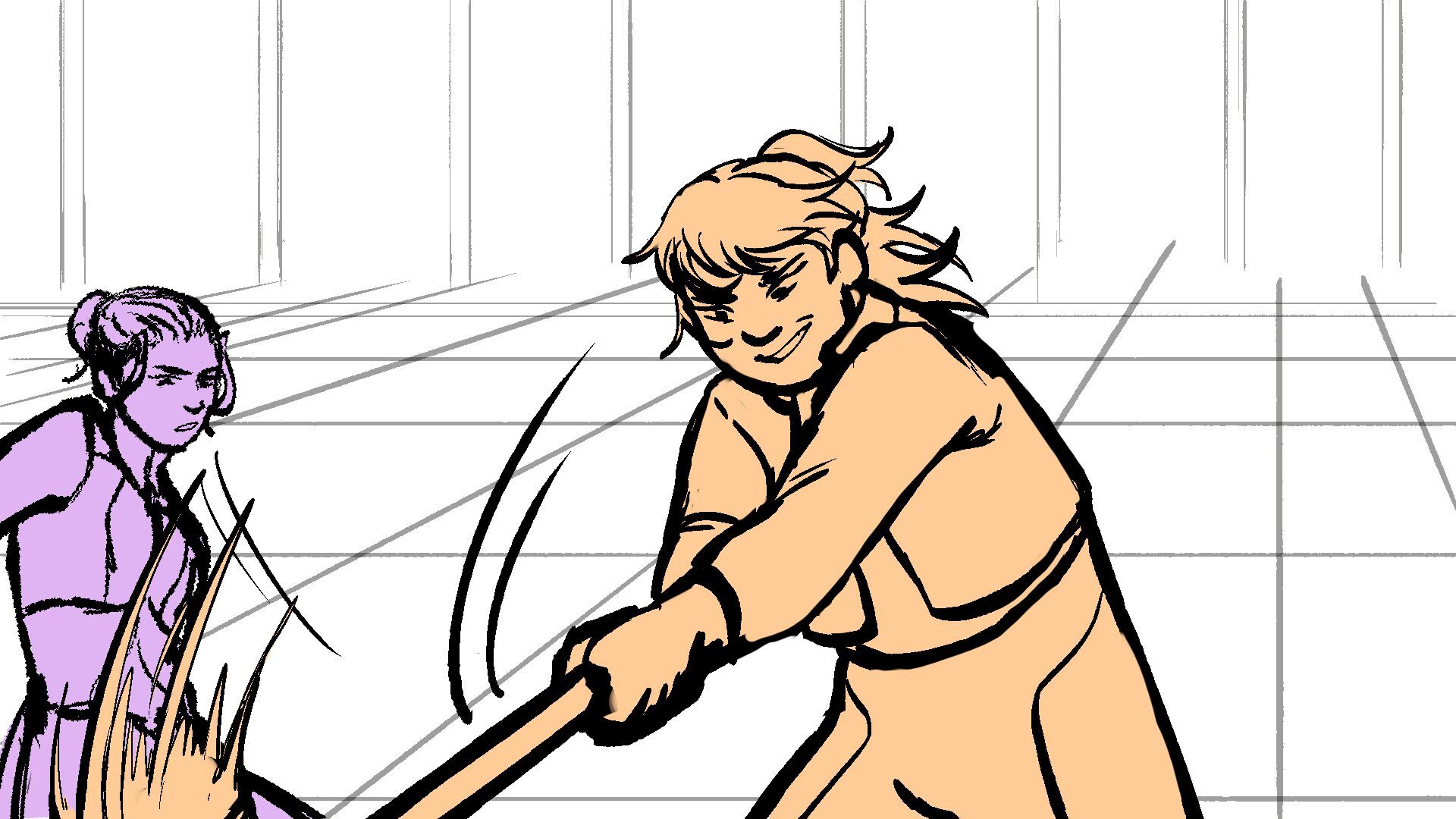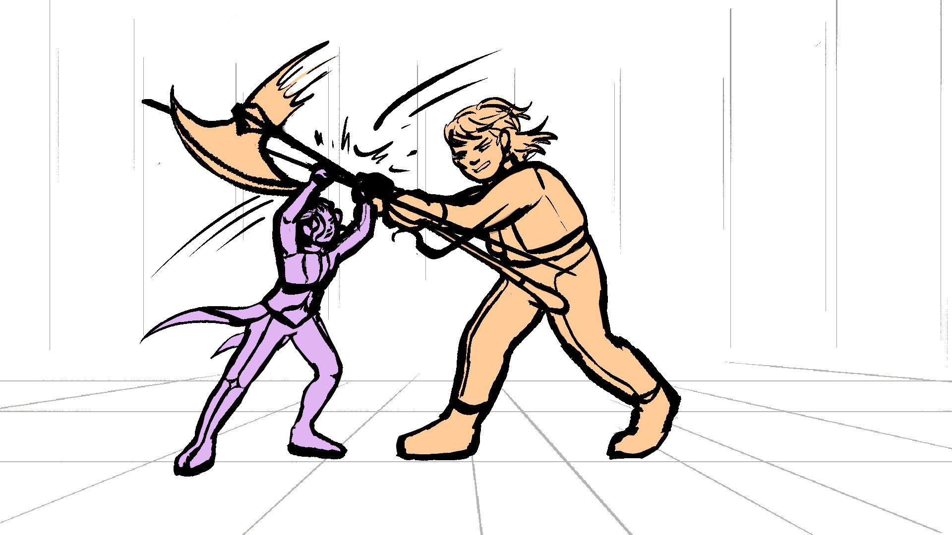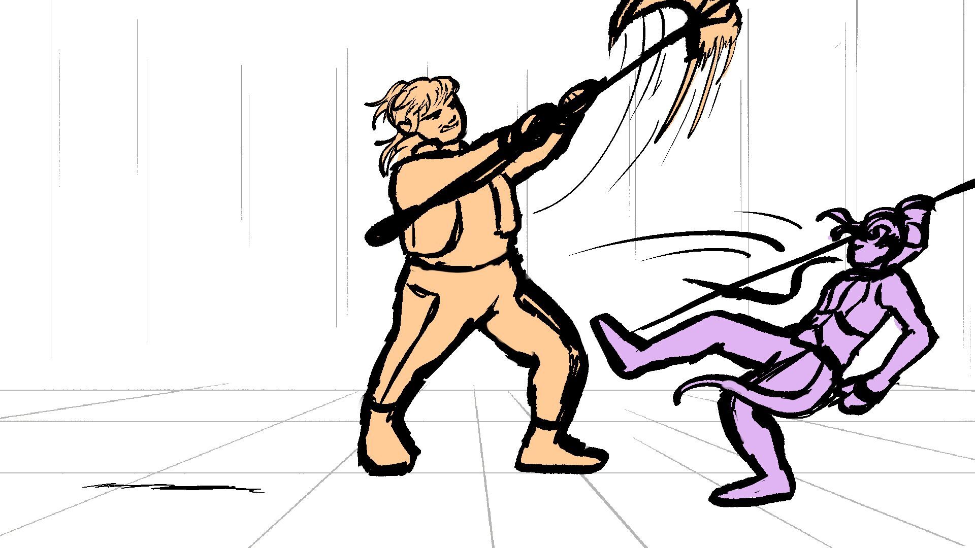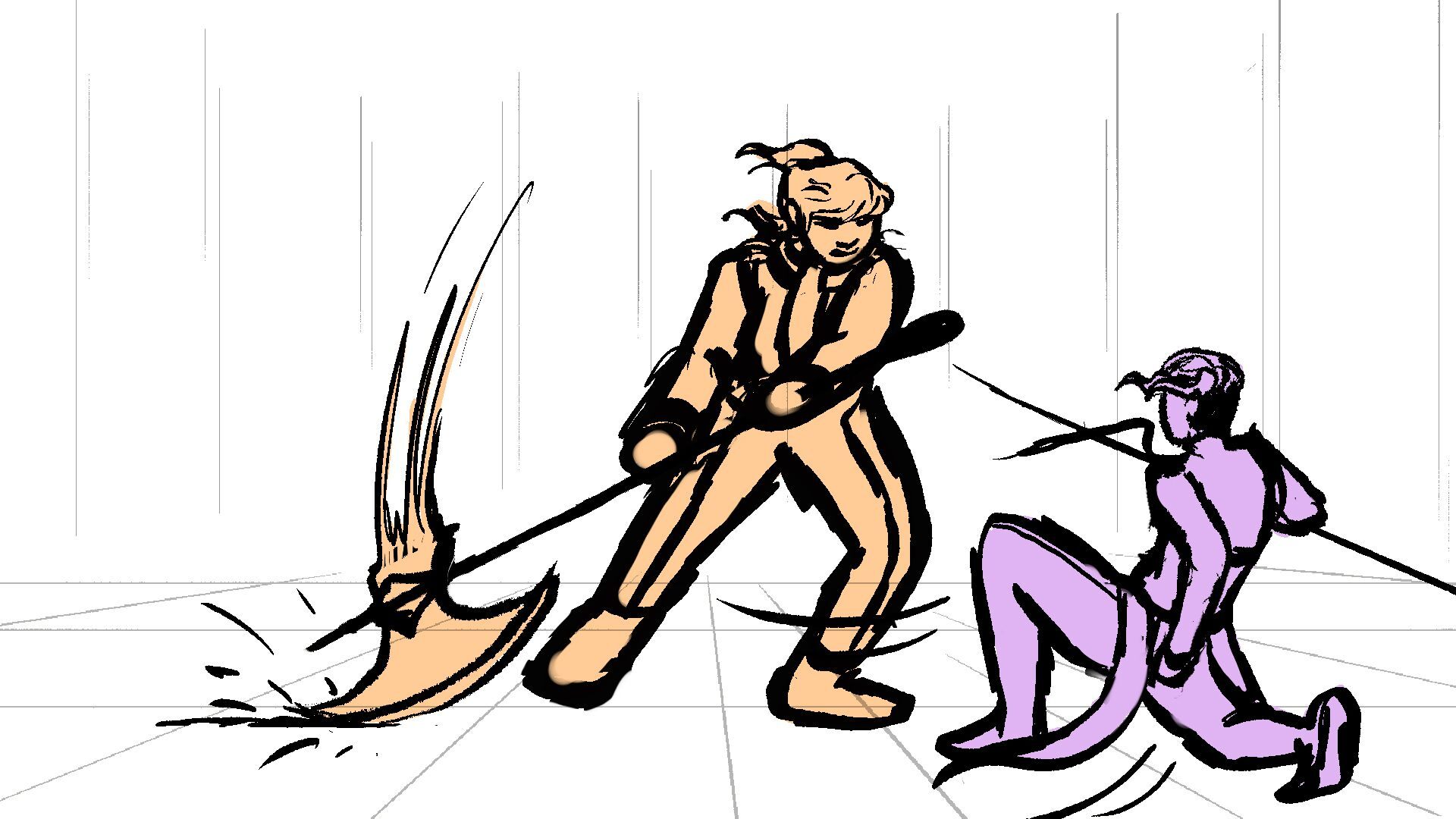 P (in purple) and J (in orange) go head to head in a melee clash of blades! (This storyboard is mainly me trying to exercise creating good continuation of motion in action shots for me.)