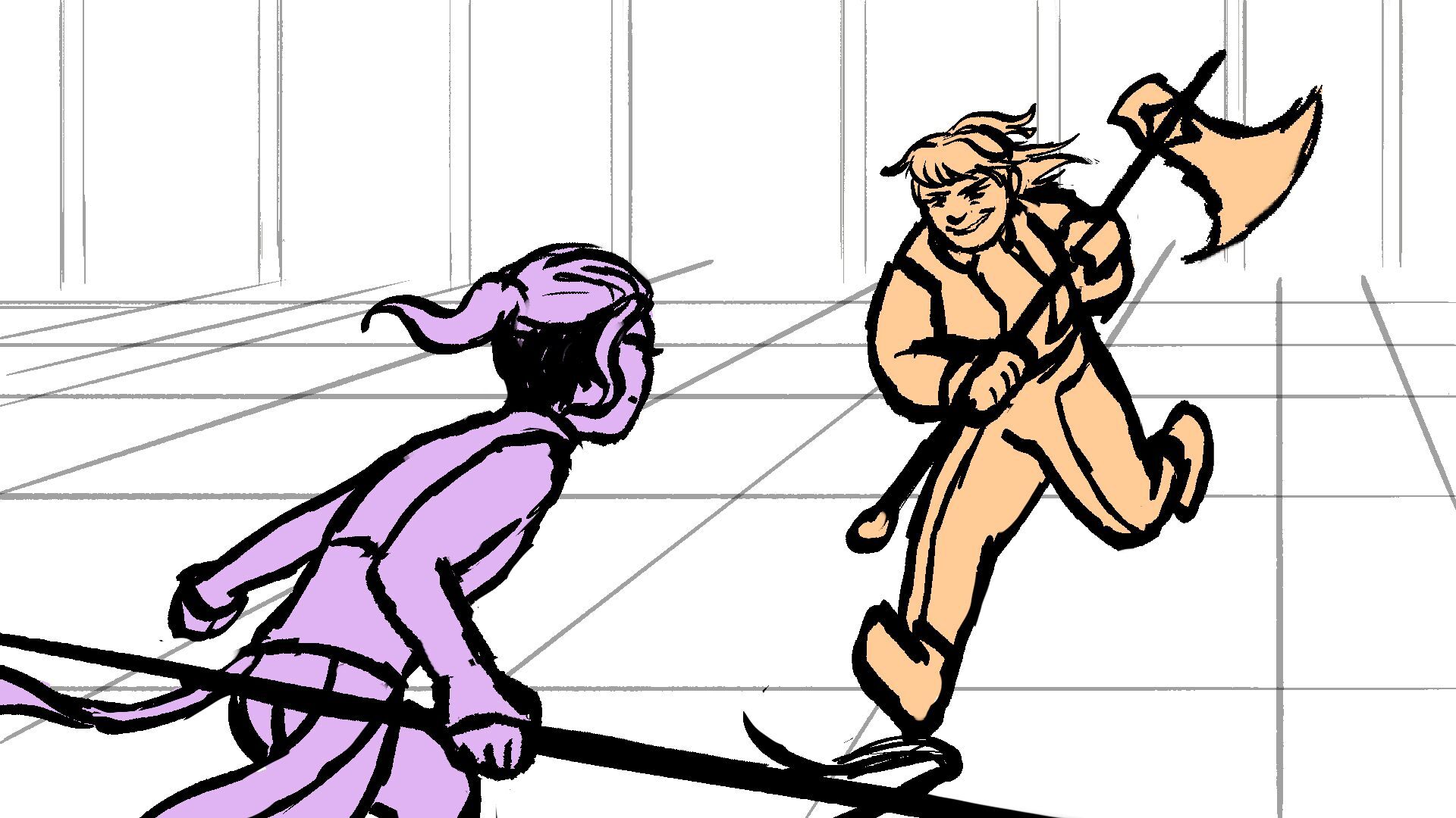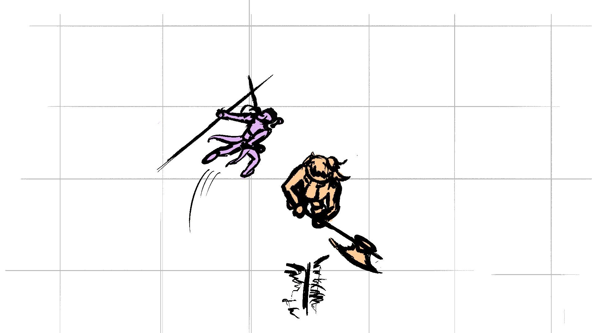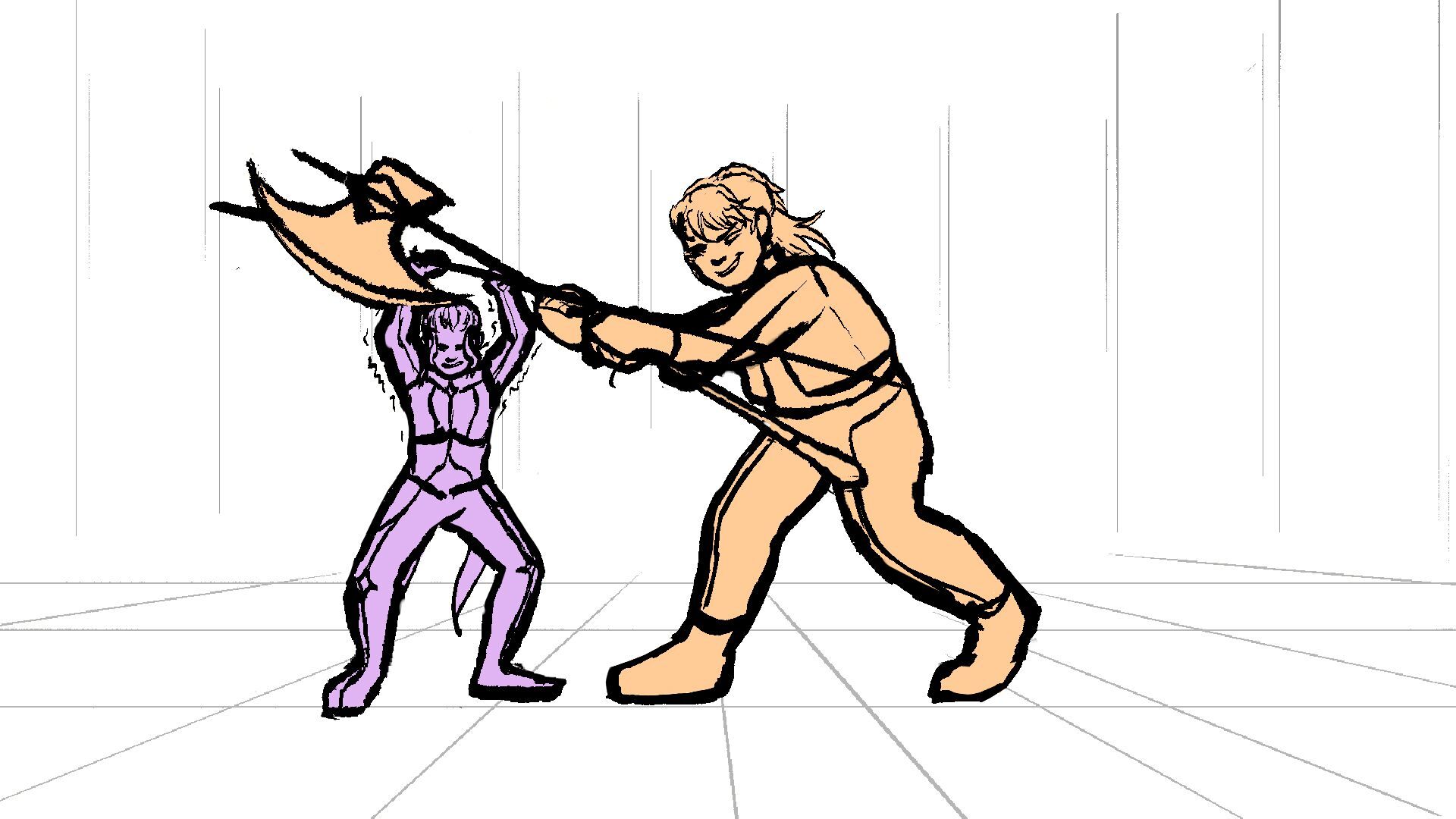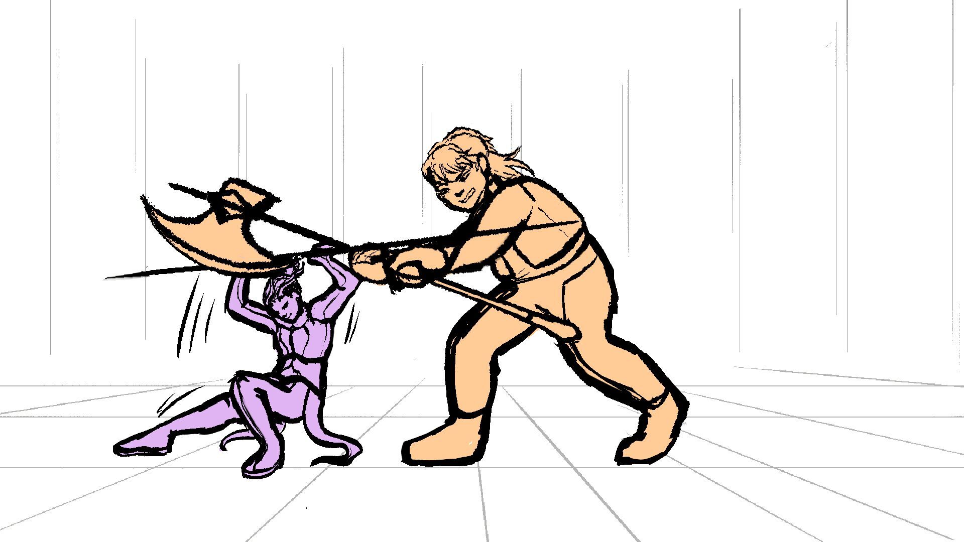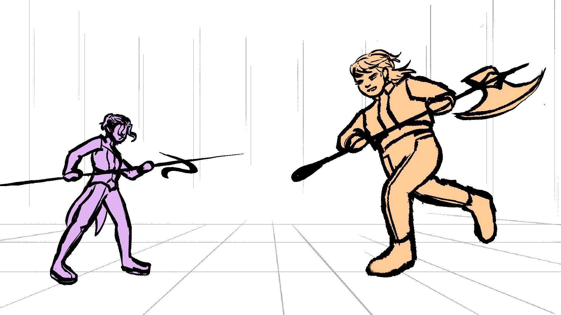 P (in purple) and J (in orange) go head to head in a melee clash of blades! (This storyboard is mainly me trying to exercise creating good continuation of motion in action shots for me.)