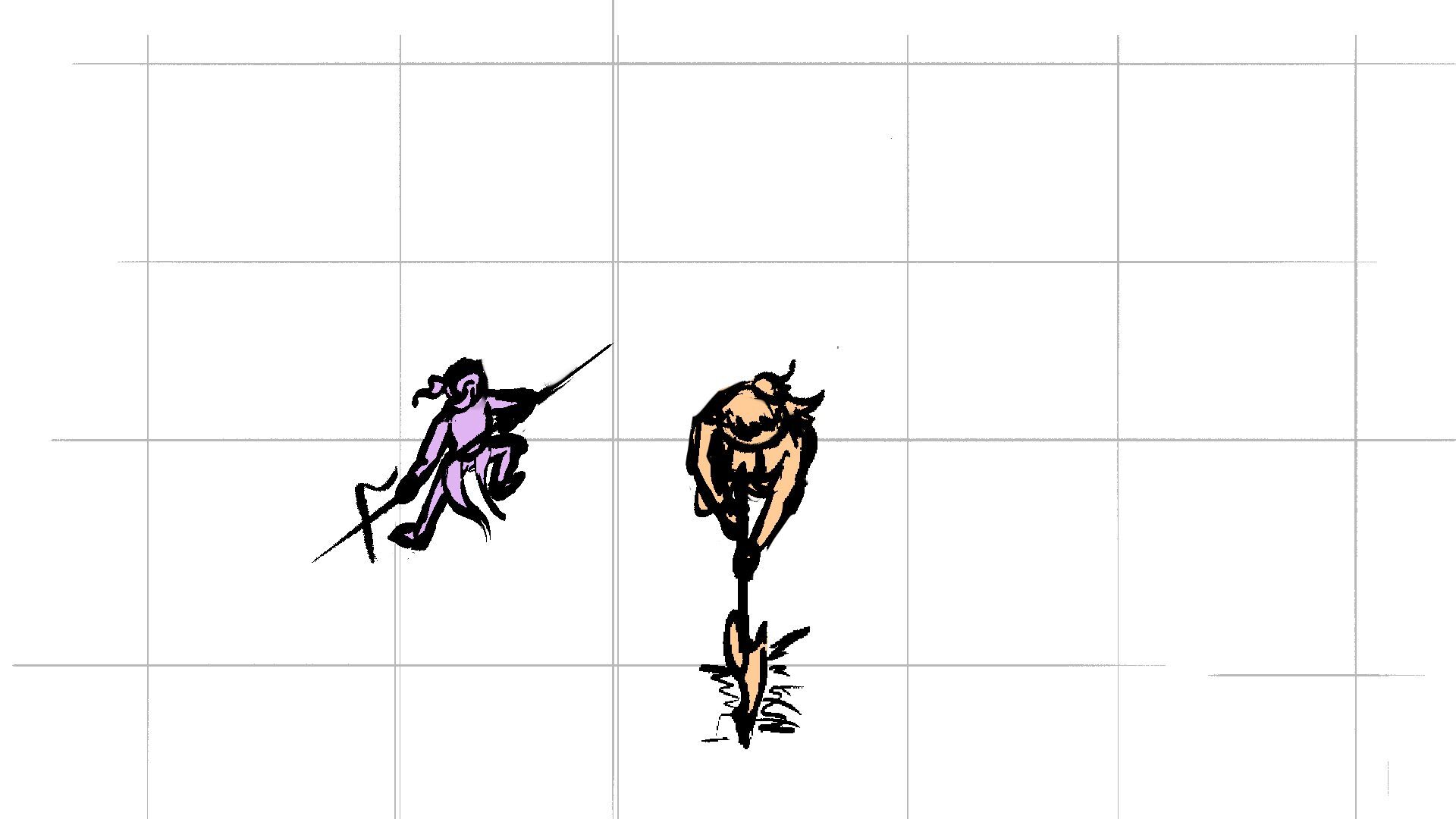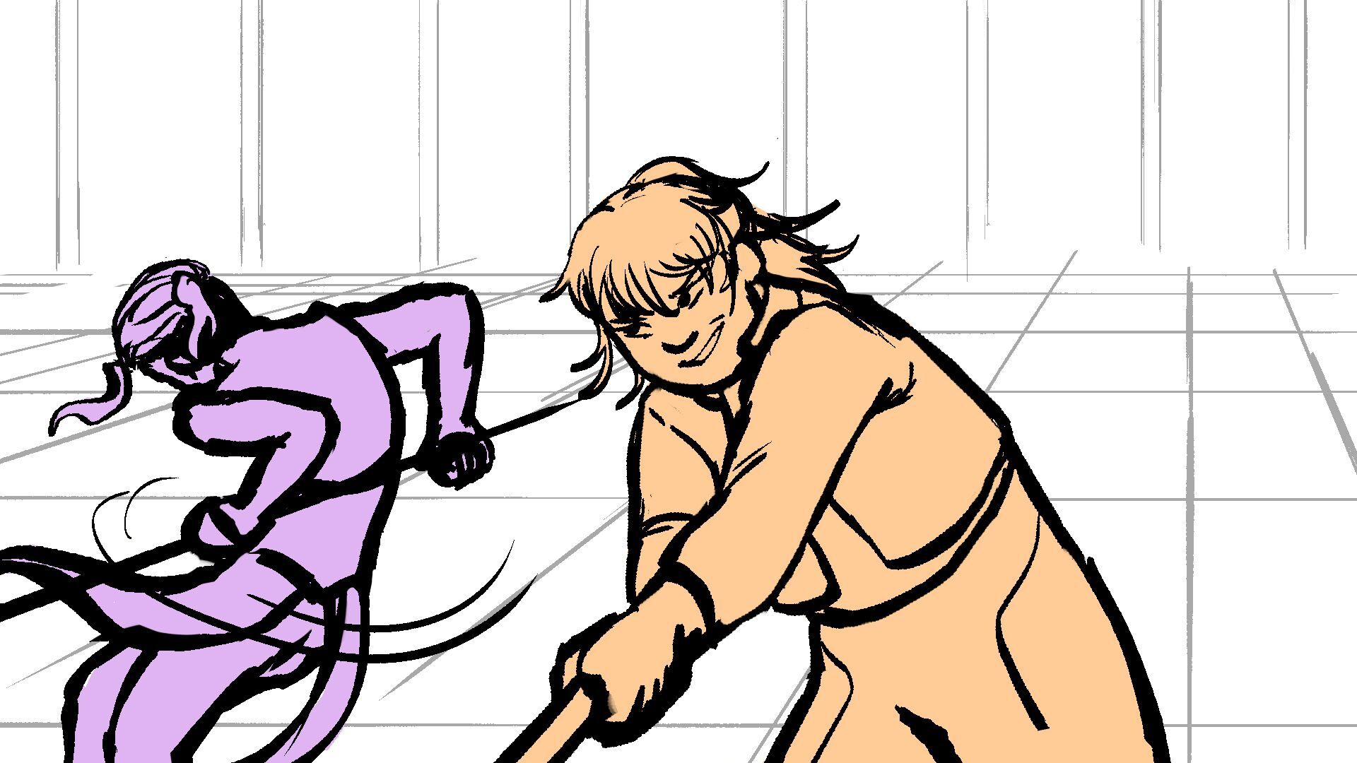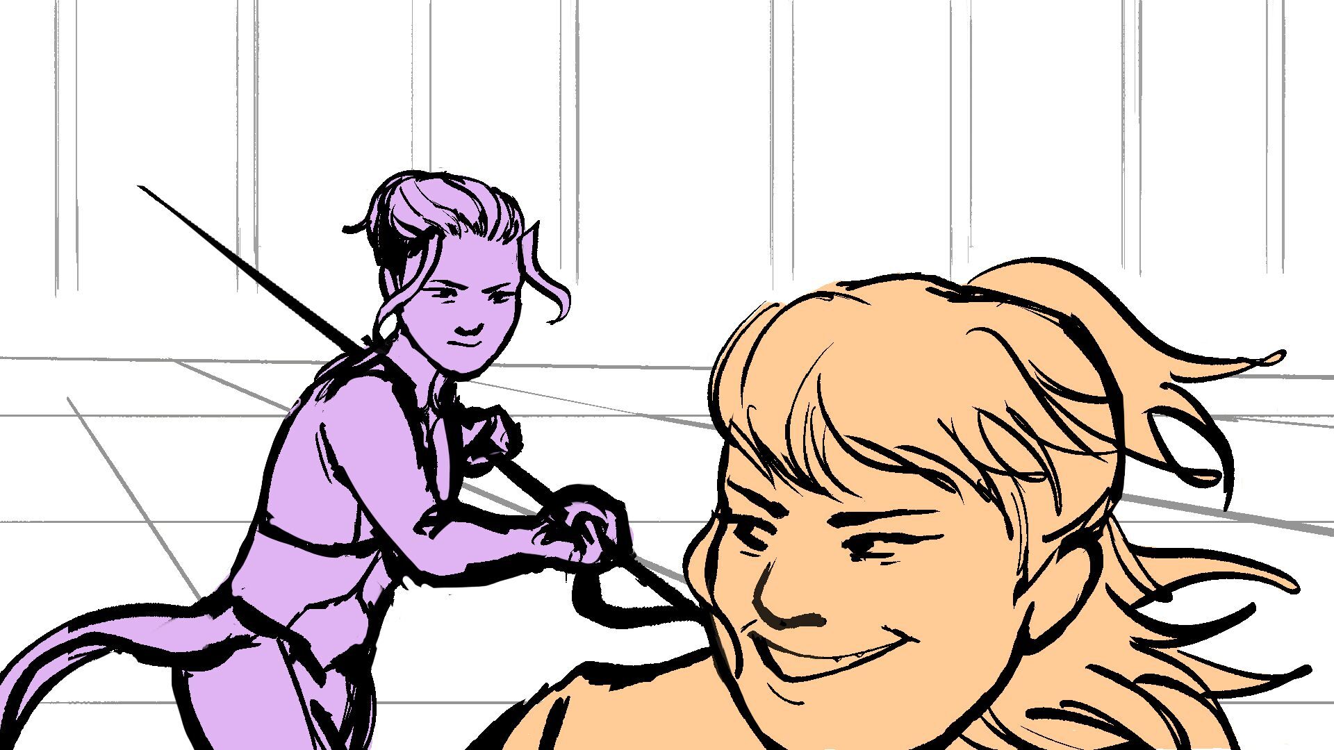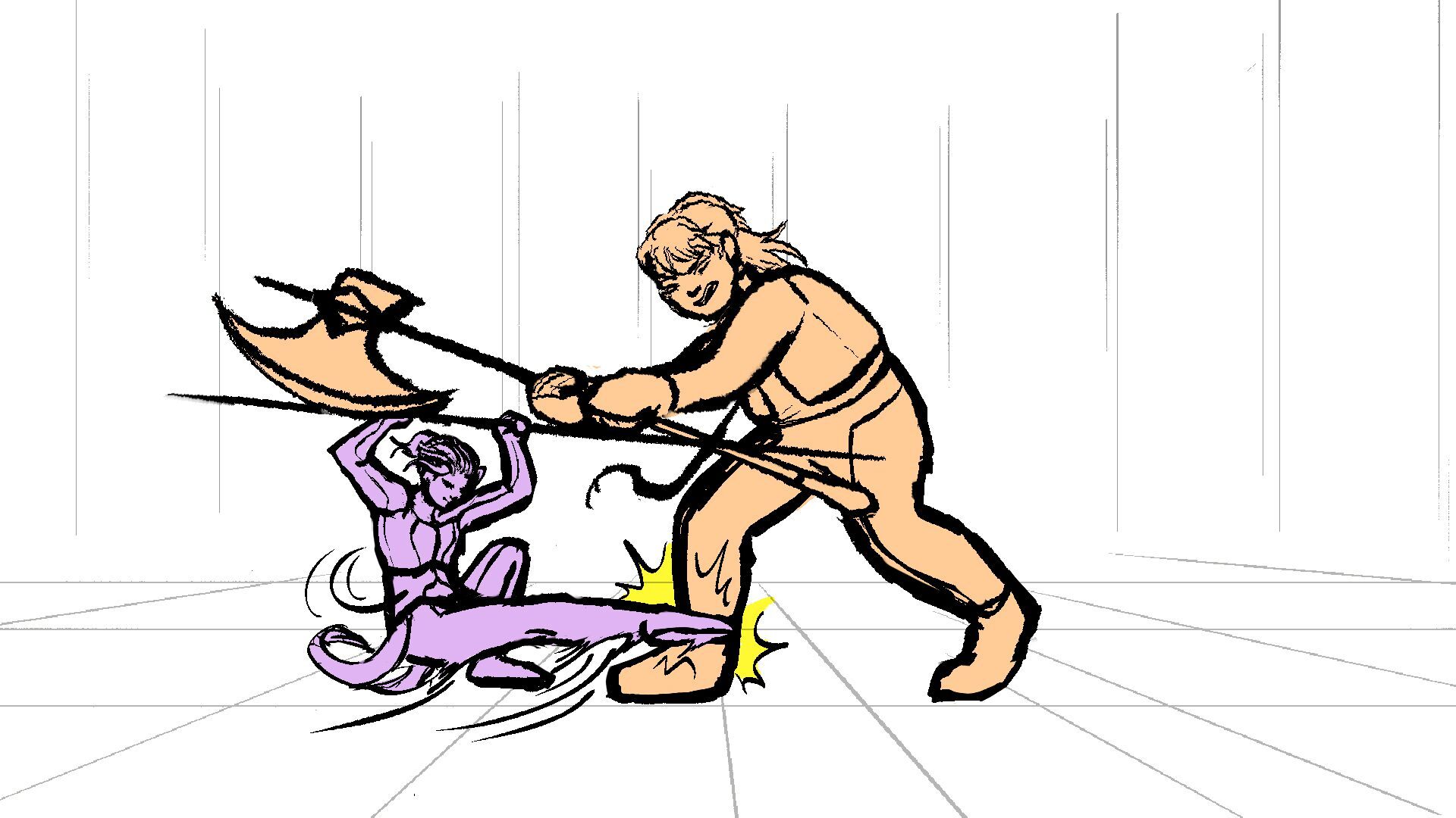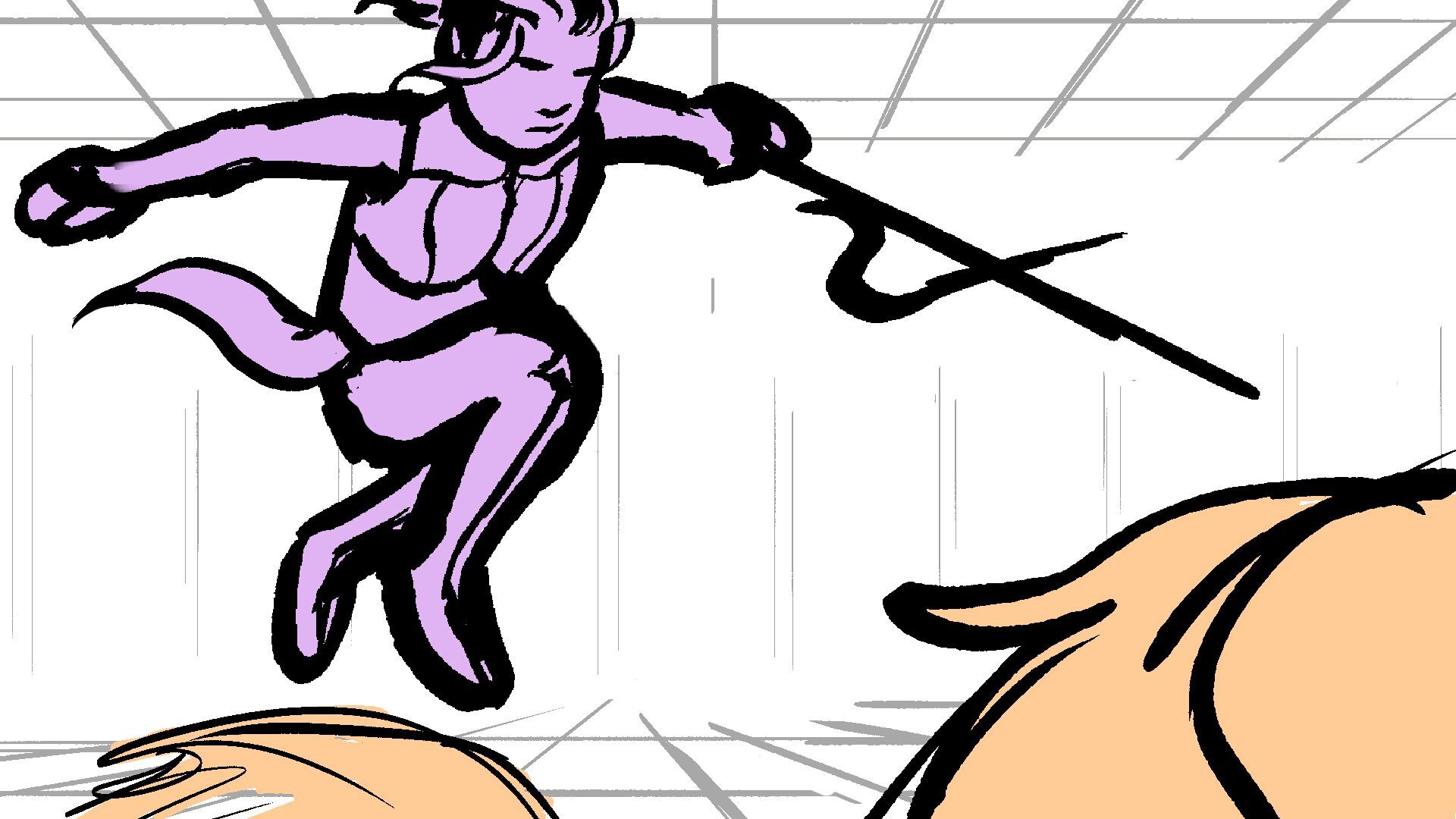 P (in purple) and J (in orange) go head to head in a melee clash of blades! (This storyboard is mainly me trying to exercise creating good continuation of motion in action shots for me.)