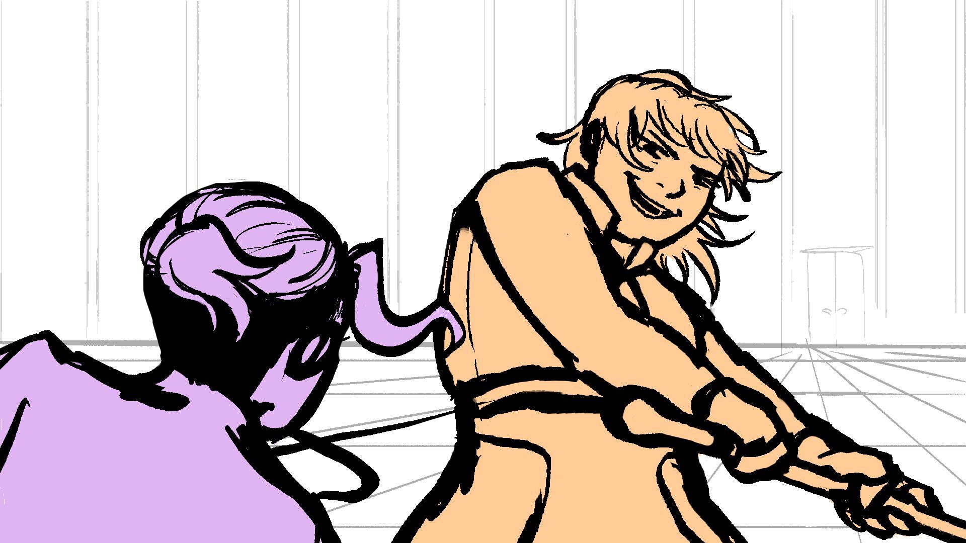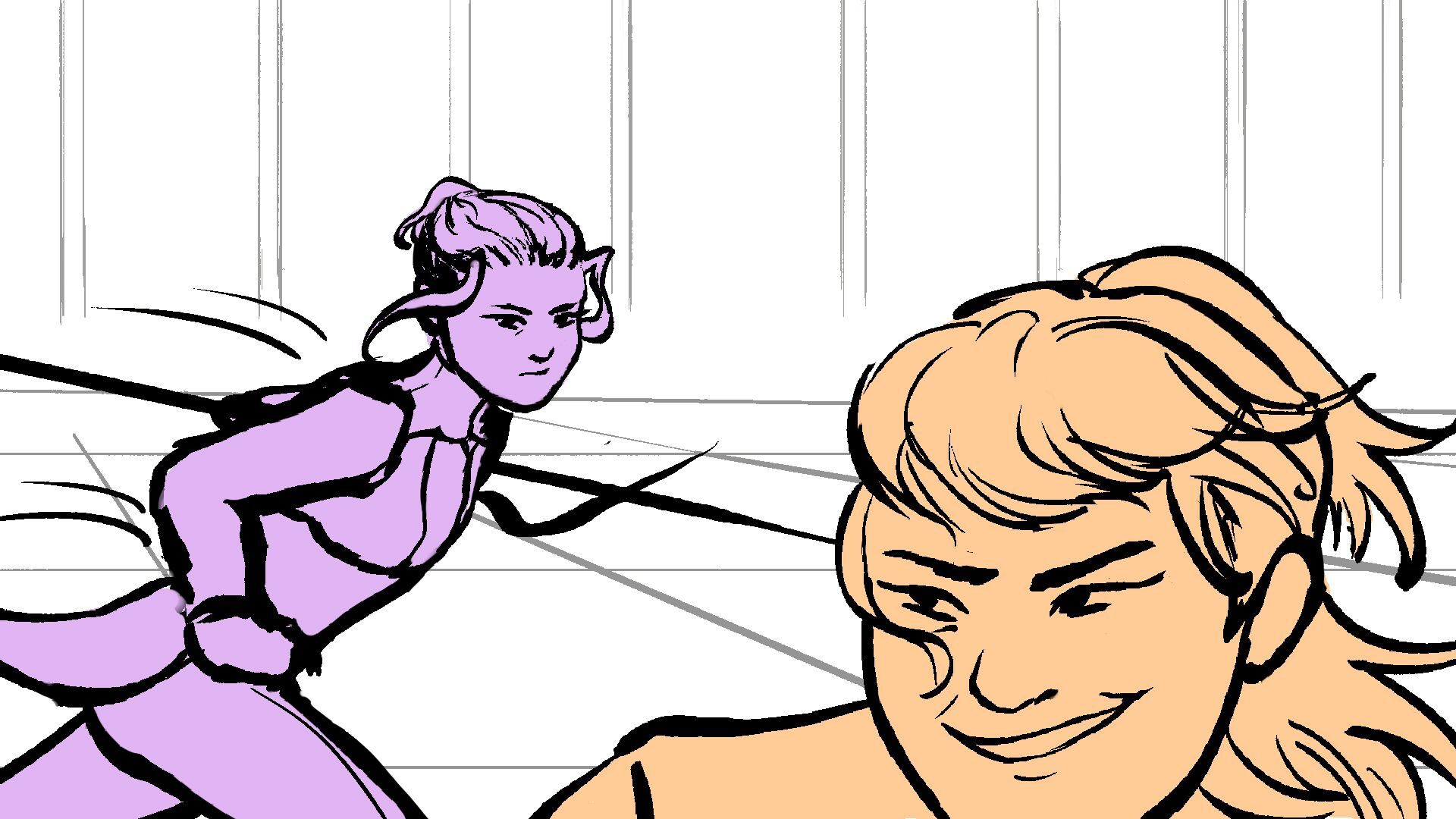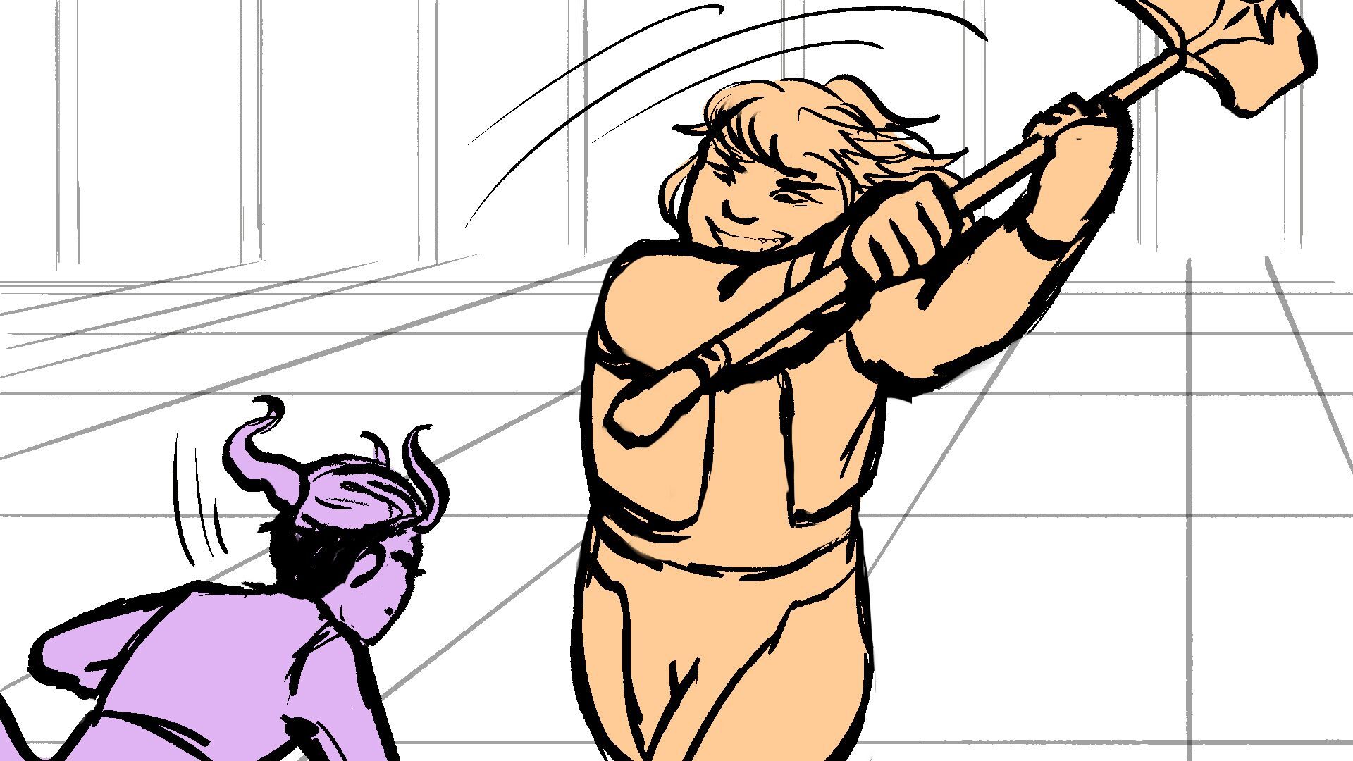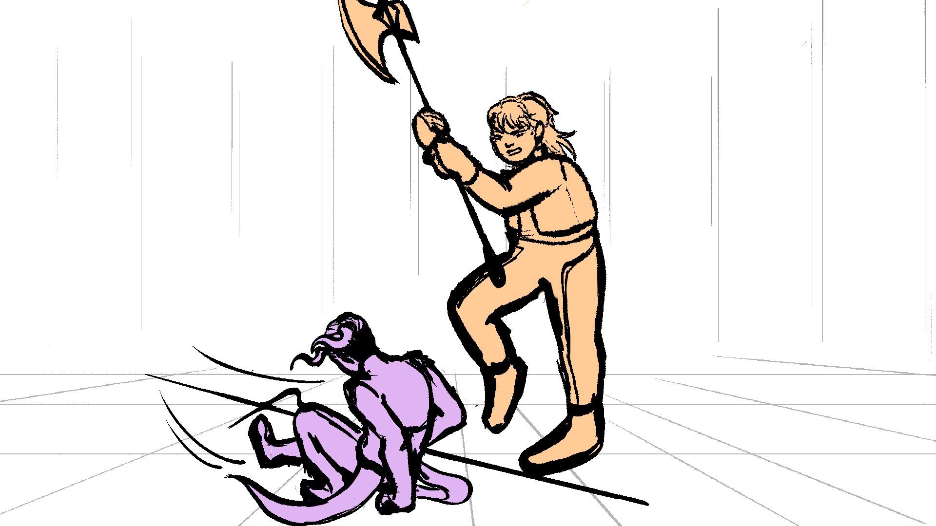 P (in purple) and J (in orange) go head to head in a melee clash of blades! (This storyboard is mainly me trying to exercise creating good continuation of motion in action shots for me.)