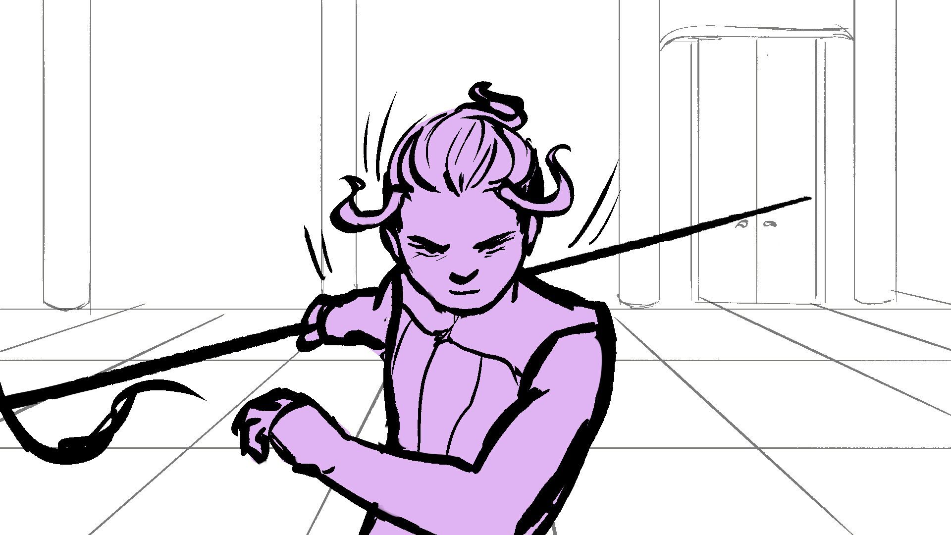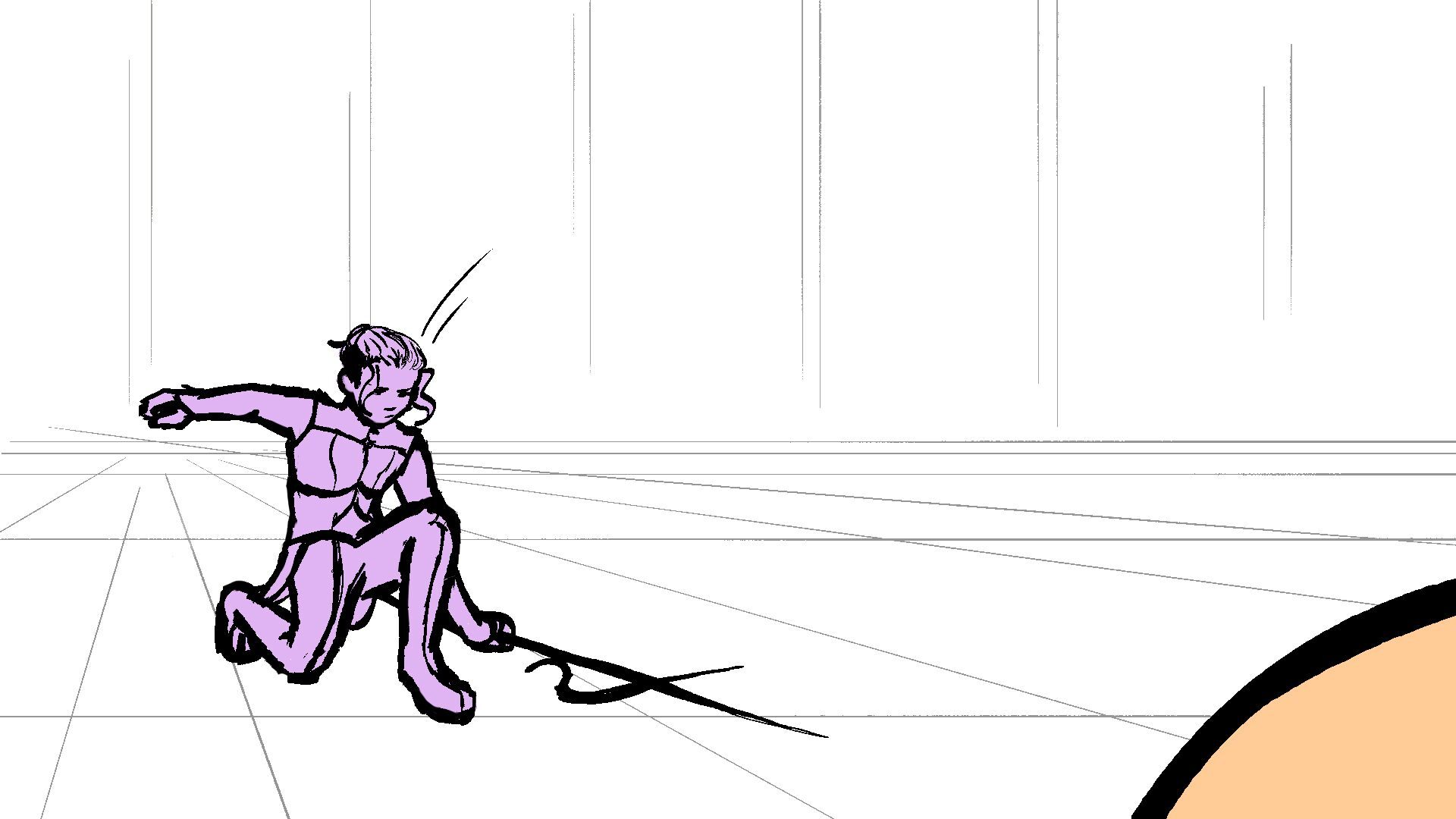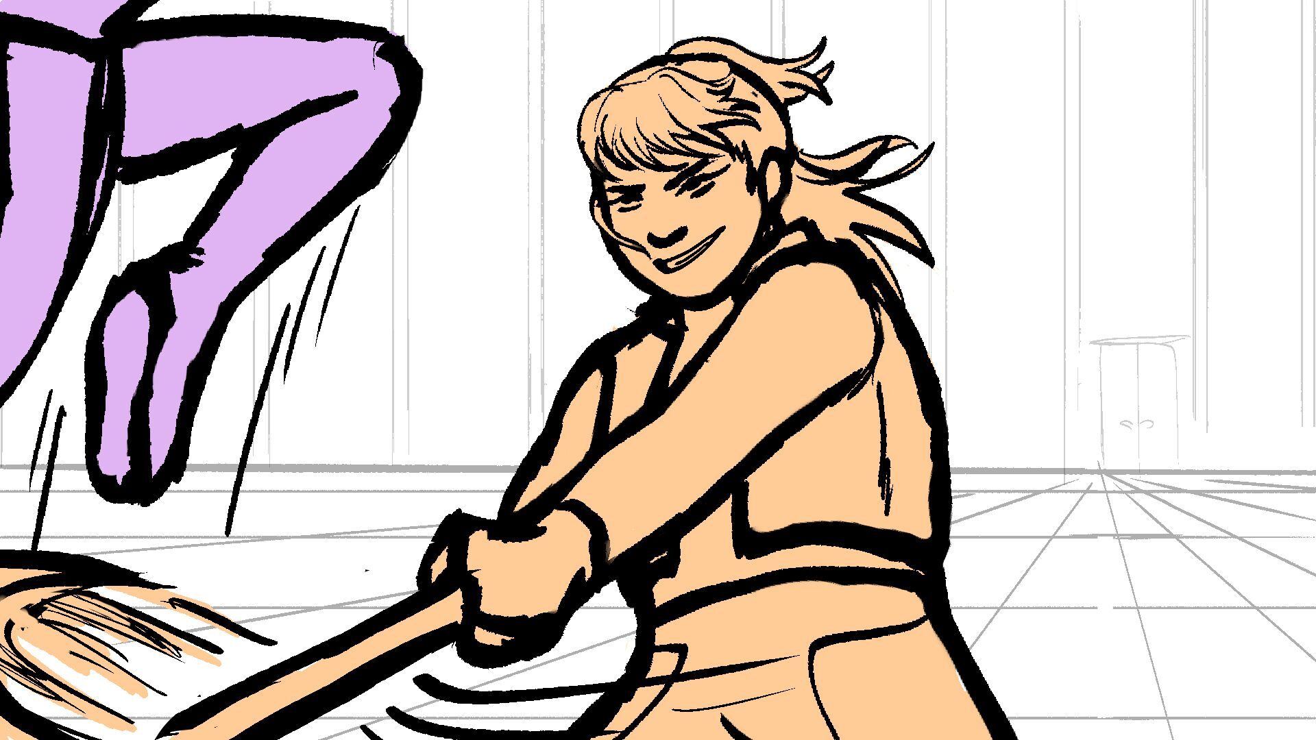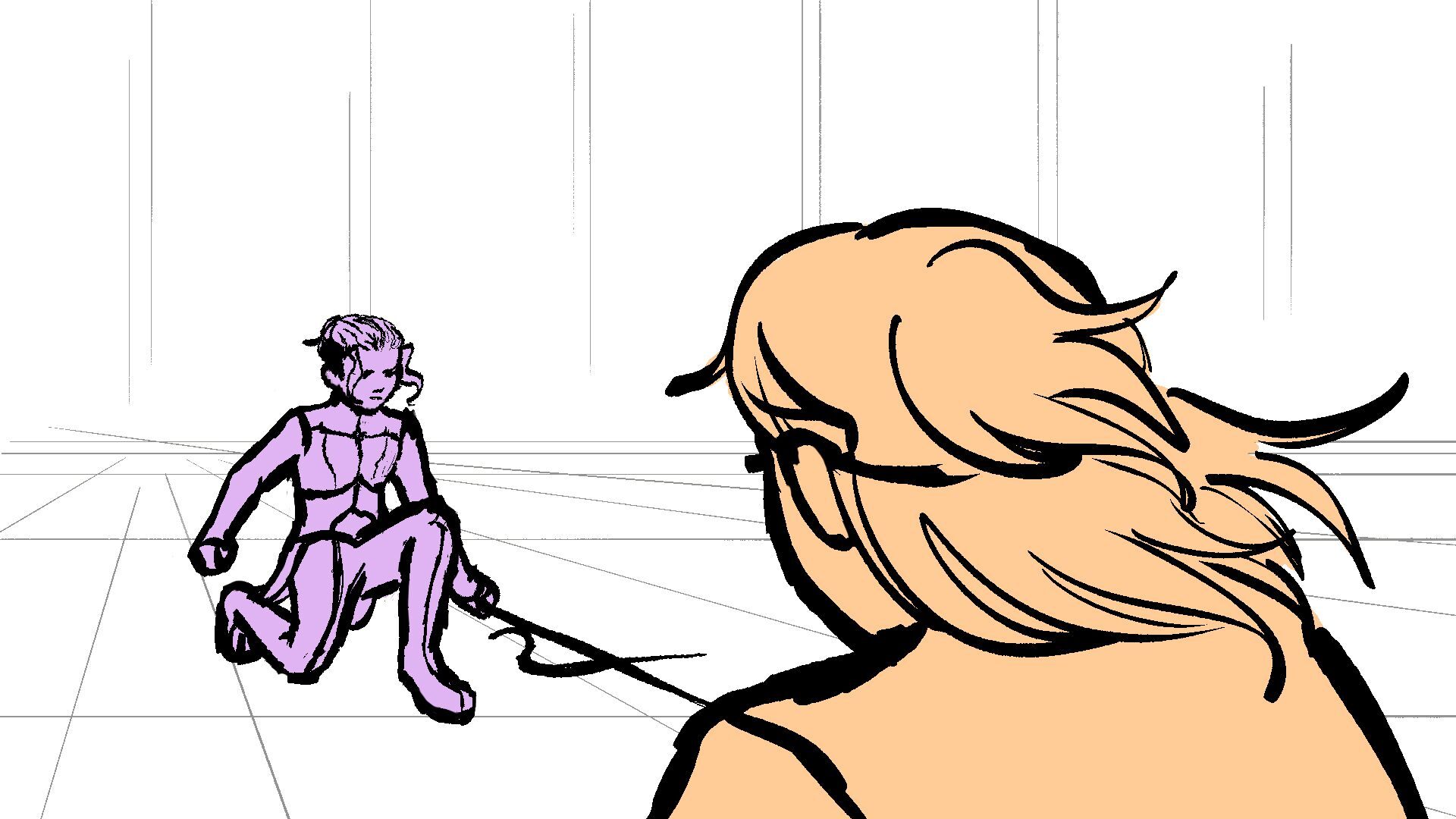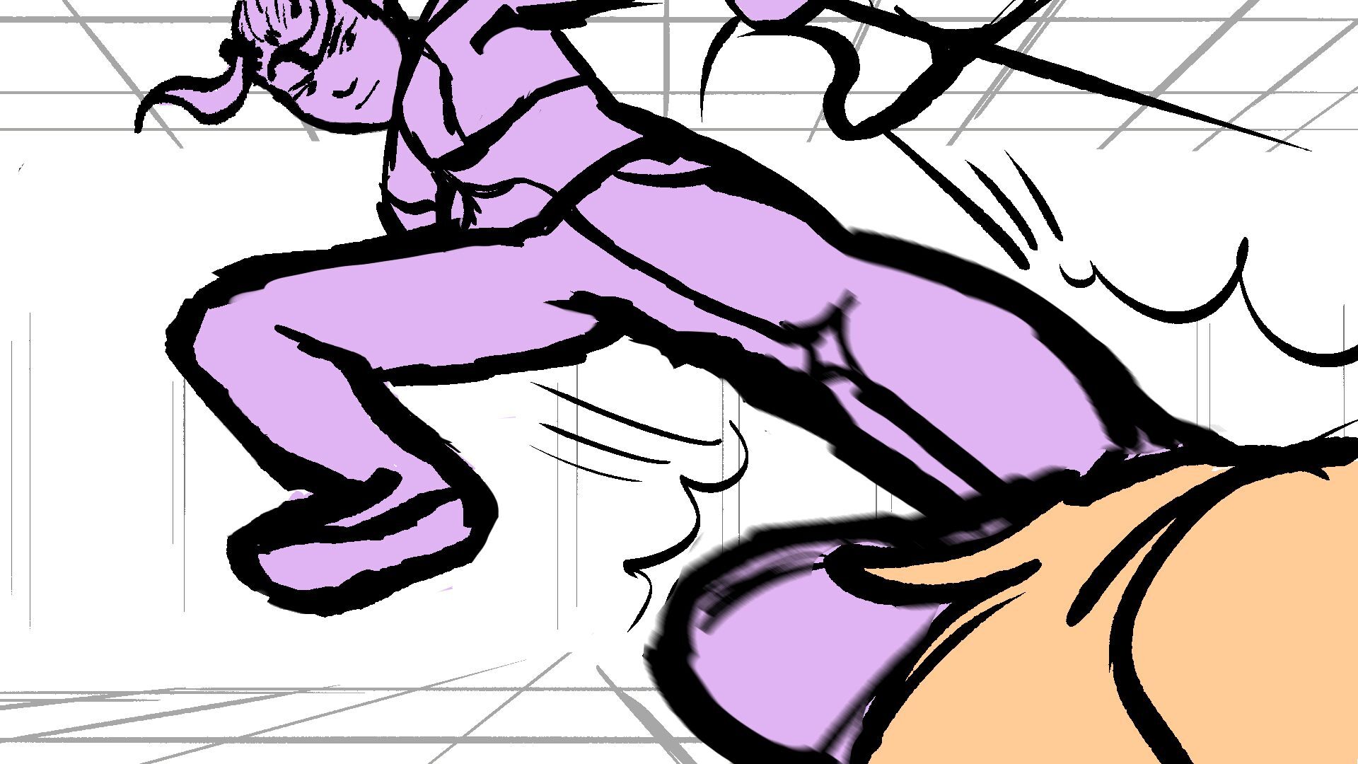 P (in purple) and J (in orange) go head to head in a melee clash of blades! (This storyboard is mainly me trying to exercise creating good continuation of motion in action shots for me.)