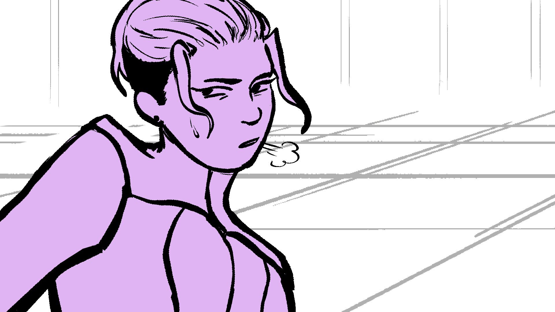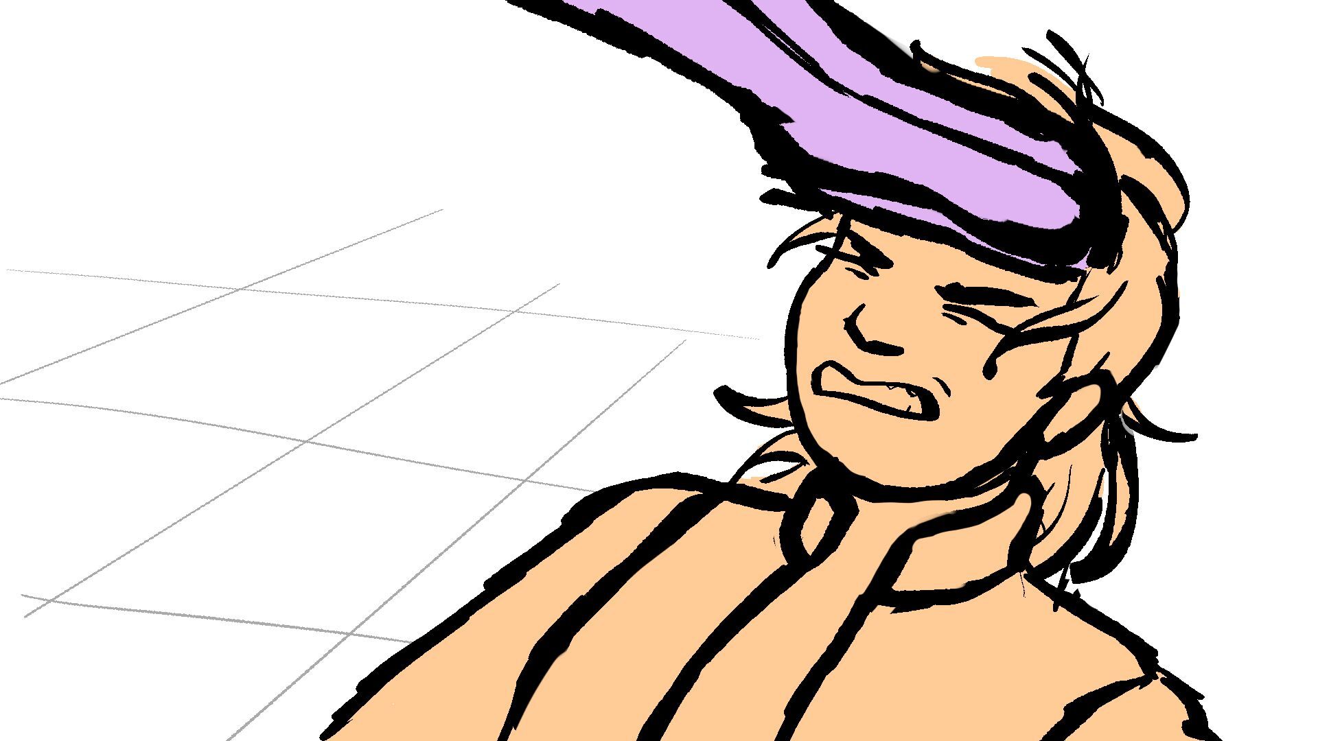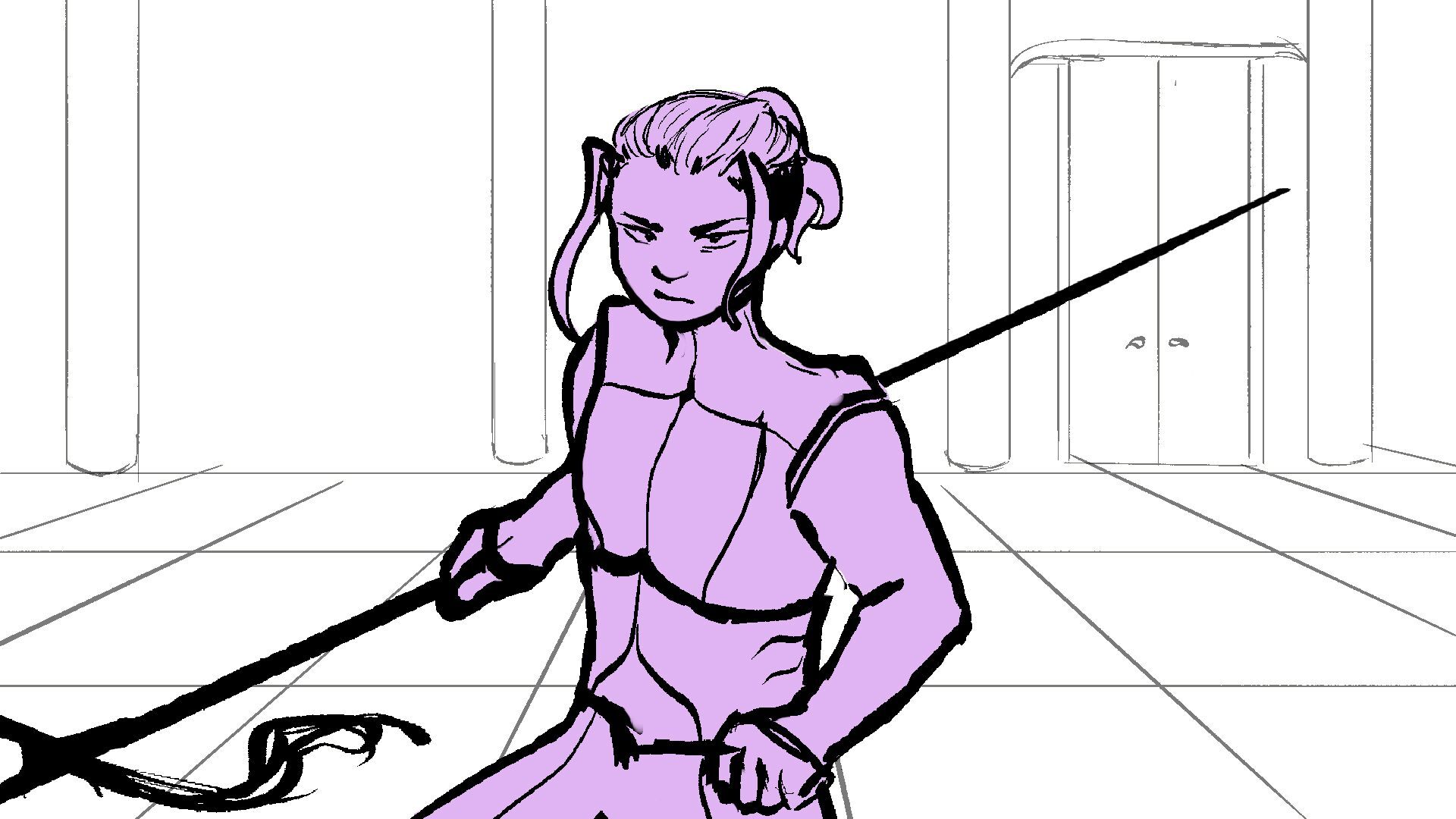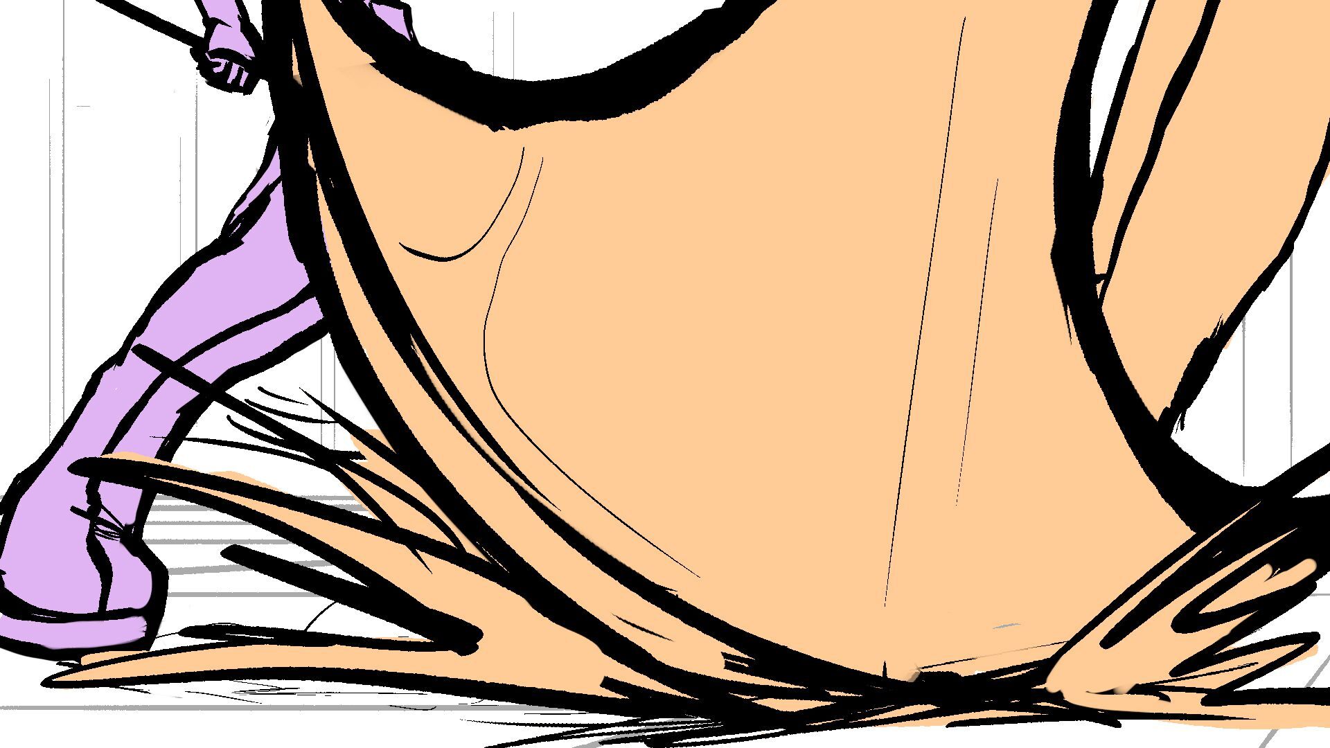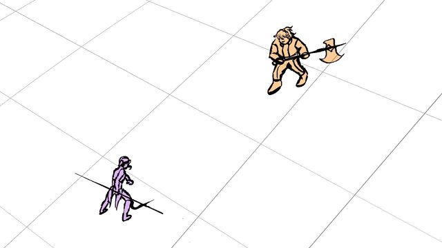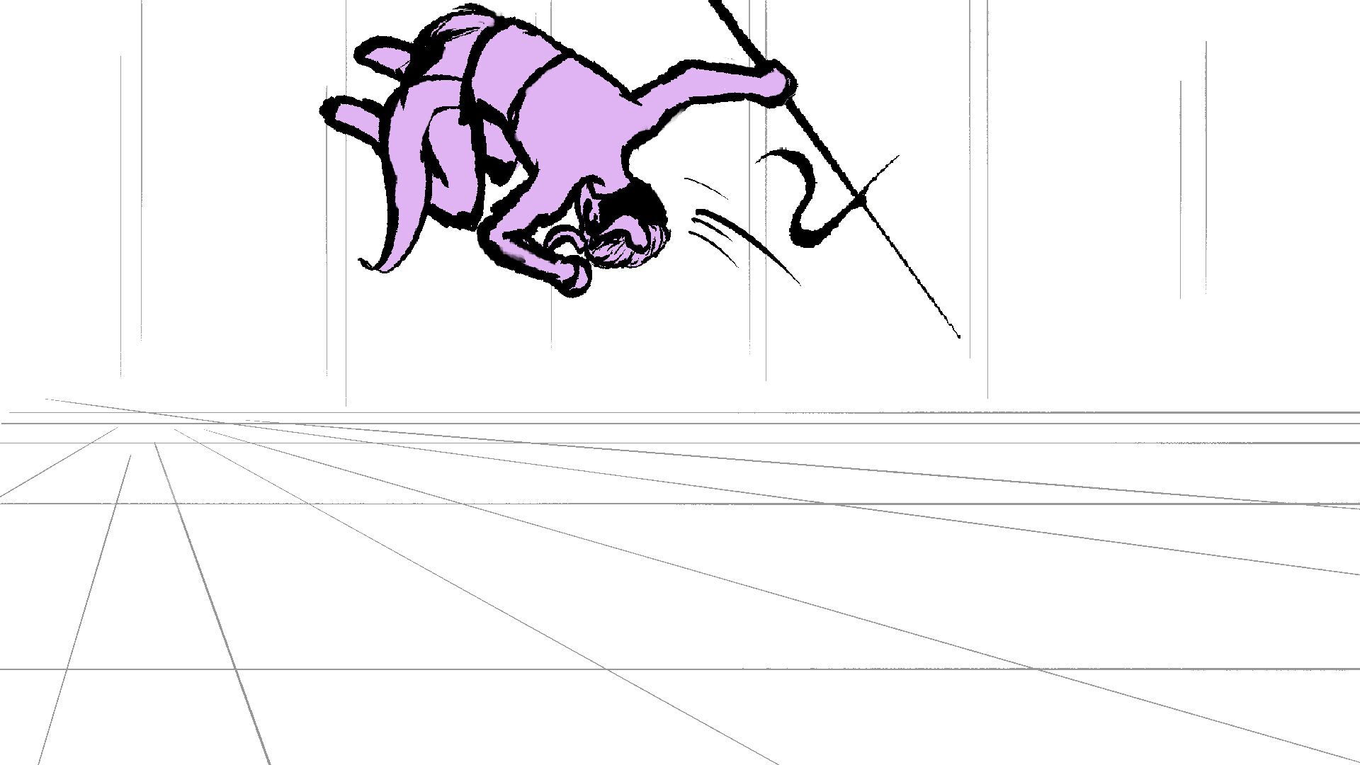 P (in purple) and J (in orange) go head to head in a melee clash of blades! (This storyboard is mainly me trying to exercise creating good continuation of motion in action shots for me.)