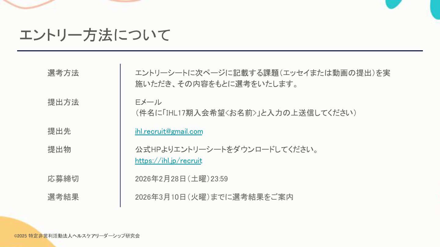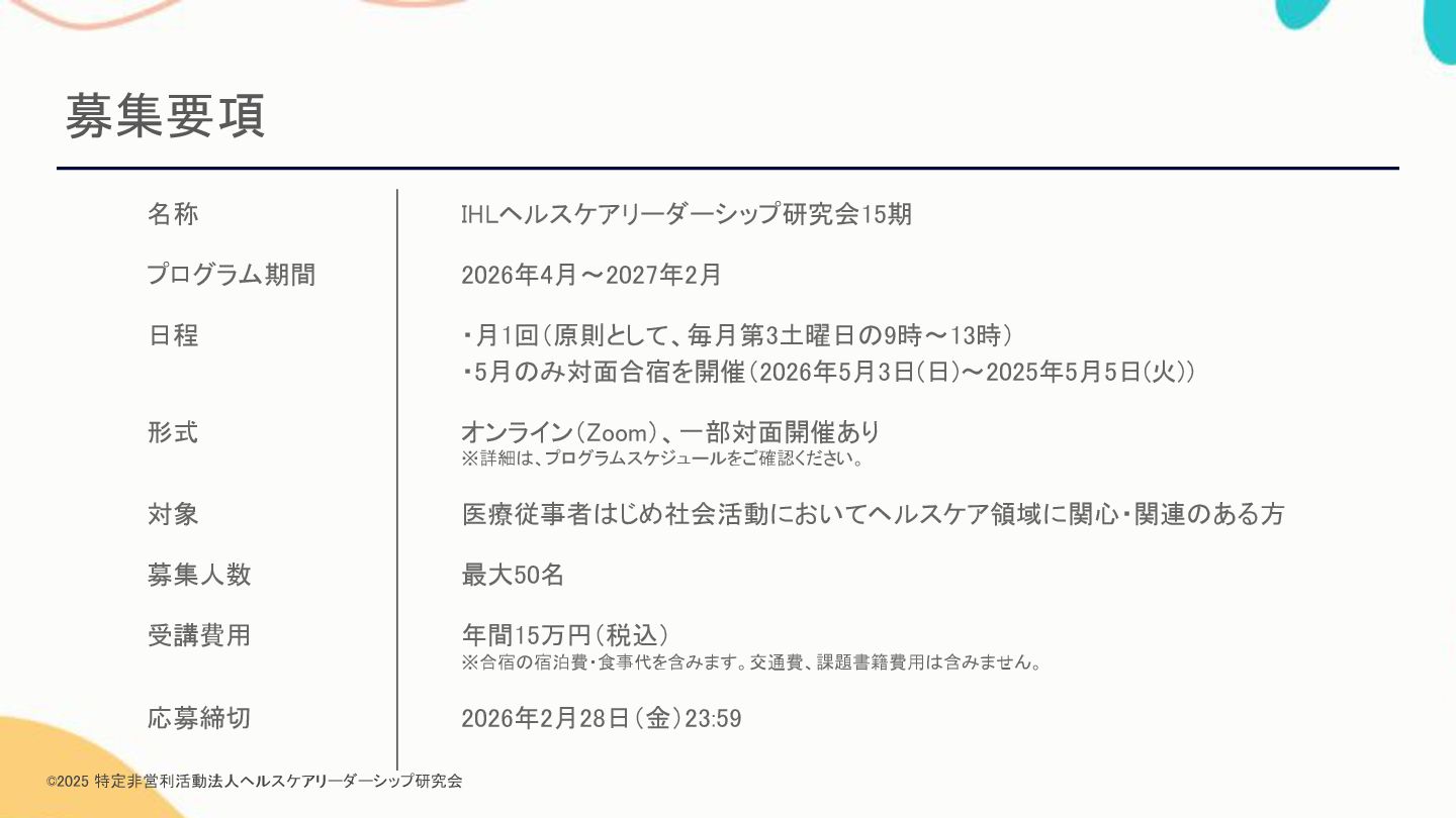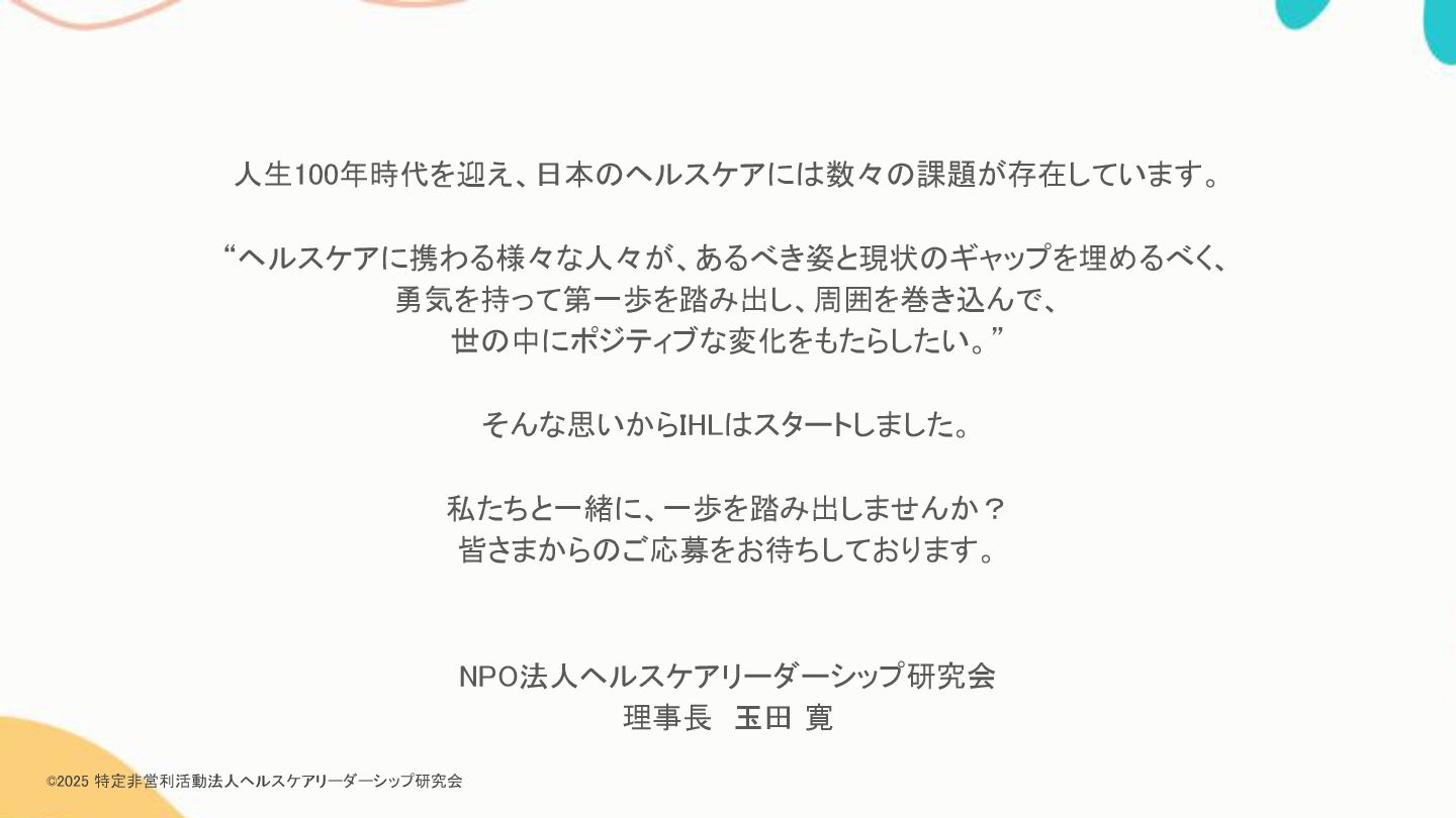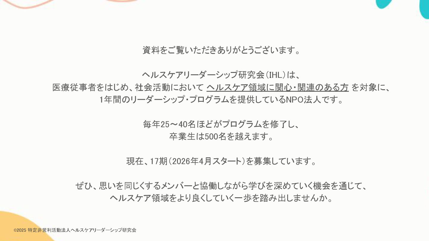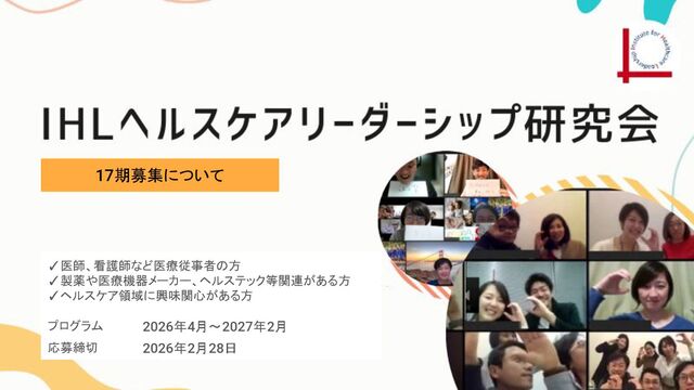 IHLヘルスケアリーダーシップ研究会17期 (プログラム期間:2026年4月〜2027年2月)のご紹介資料です。 募集要項はこちらからダウンロードください。 https://ihl.jp/recruit